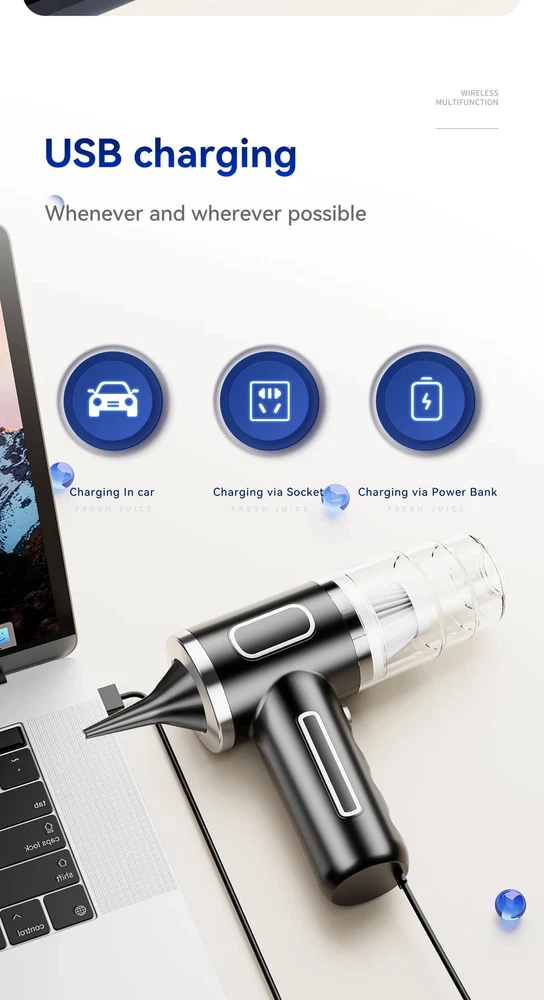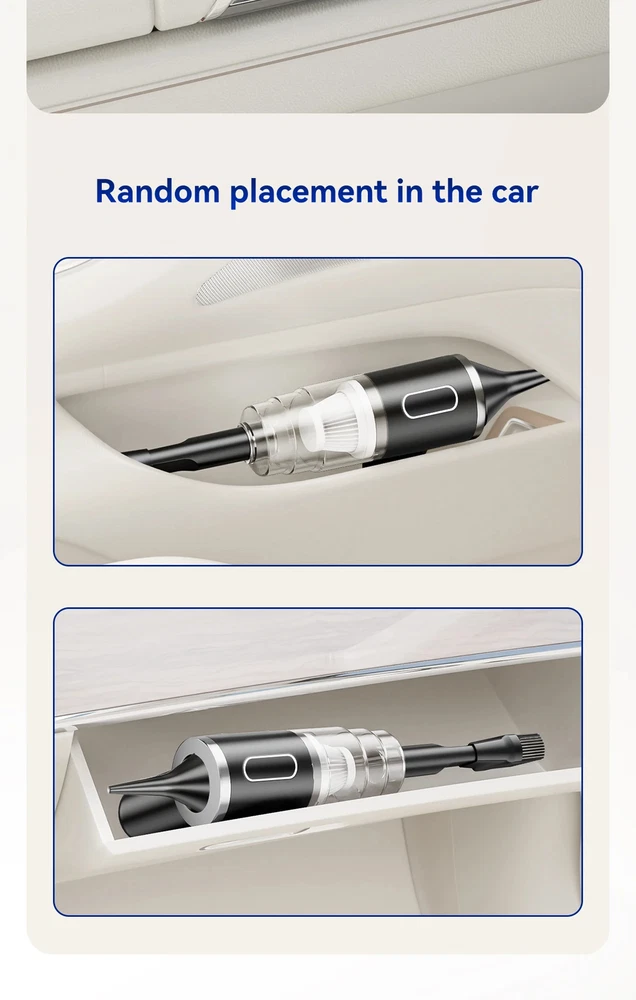 9600000Pa Wireless Vacuum Cleaner 5 in1 Strong clean Automobile Portable Vacuum Clean Handheld For Car Home Office Specification: Rated speed: 45000(r/min) Rated input power: 120 (W) Rated voltage: ≤24V (V) Vacuum suction: 9600000Pa (PA) Battery capacity: 2000mah Noise ratio: ≤70dB Charging time: 3-4hours About this product: 1.【Rechargeable Battery & Fast Charging】This electric vacuum cleaner has a built-in 2000mAh battery with a fast charging port. It can be easily charged using car chargers, power banks, laptop rechargeable batteries and other charging methods. Charging takes only 3 hours. This reusable vacuum cleaner is the perfect replacement for a compressed air tank, environmentally friendly and energy-saving. It also saves money and time. 2.【Powerful Air Duster and Vacuum Cleaner 5-in-1】Our vacuum cleaner has two functions: it can suck, pump, blow and charge. Easily blow away particles such as dirt, crumbs, and dust from surfaces, as well as remove small, stubborn dirt hidden in keyboards, nooks and crannies. 3.【Easy Maintenance】With just one click of removal, you can easily dump the garbage and clean the vacuum cleaner. Hepa filters can be washed and reused, ensuring efficient suction while keeping dust and dirt out and preventing clogging. 4.【Wide range of uses】The cordless vacuum cleaner comes with many different detachable brush head nozzle accessories for cleaning various scenarios. For example, it can thoroughly clean computer keyboards, cameras, air conditioners, sofas, windows, pets, plants, etc. Packing List: 【Double-use for blowing and sucking】: Standard: Vacuum cleaner *1+USB charging cable *1+ brush *1+ long-nosed straw *1+Vacuum nozzle*1+filter element *1 Upgraded: Vacuum cleaner *1+USB charging cable *1+ brush *1+ long-nosed straw *1+Vacuum nozzle*1+filter element *2