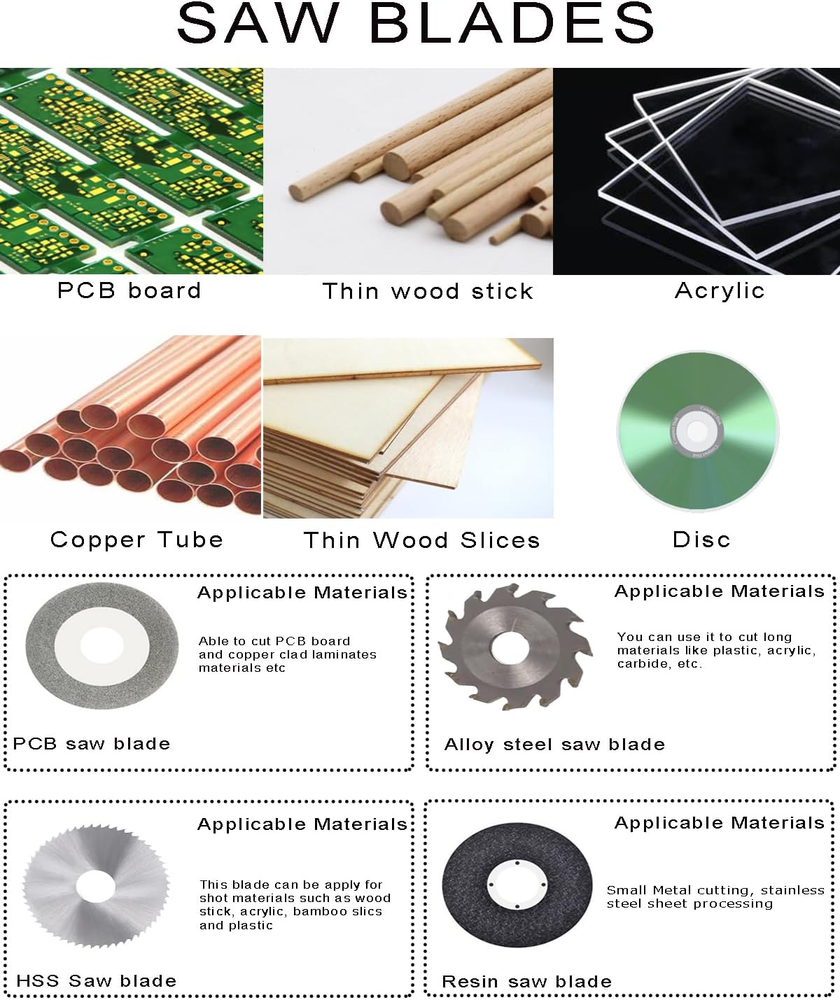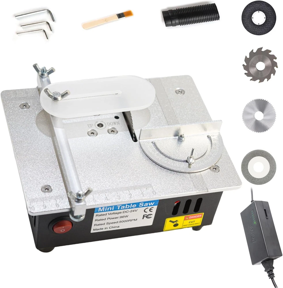 【Lightweight Aluminum Alloy】: The panel of the mini table saw is made of aluminum alloy, which makes it lightweight, compact, and durable. The overall weight is about 3.9lbs/1.8kg. Product Dimension: 7.1*5.5*2.95 inch (18*14*7.5 cm) 【7-Degrees Speed】:The craft table saw supports 7 degrees of speed. You can control the speed according to material (e.g. wood/PCB board/acrylic/plastic/metal, etc.) 【Controllable Cut Thickness】:The height of the saw blade can be adjusted for different thicknesses of materials, which makes the cut surface clean and smooth. The blade height can be adjusted in the range of 0-0.6 inch (0 to 15mm) 【Available for 0-180 Angle】: Push the material toward the blade with the angle controller(miter gauge) on the body to control the cut angle of 0-180 degrees 【Comes with Dust Pipe】: Waste and dust are inevitable in every cutting operation. It is equipped with a dust pipe so the user can connect it to a small dust collector, which is very important for the user's health 【Packing List】: 1*Mini table saw main body, 1* Power adapter, 4* blades,1* brush, 3* screwdrivers, 1* dust pipe, 1* safety bezel, 1* user manual, 1* miter gauge Product Description Mini Table Saw, RTOVZON 4 Blades Mini Desktop Electric Saw Mini Table Saw, RTOVZON 96W Mini Desktop Electric Saw Cutter, Cut Thickness Adjustable Precision Craft Table Saw with Speed & Angle Adjust 4* Blades, Available for Wood/PCB/Acrylic/Plastic/Aluminium