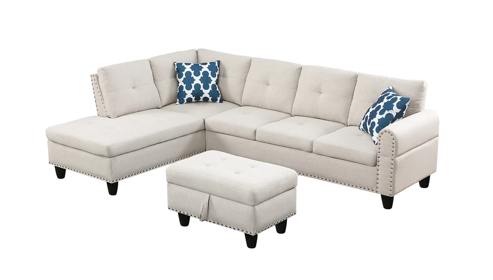 This sectional is a game-changer for small spaces! The L-shaped design offers plenty of room to lounge, and the storage ottoman is super handy. The linen blend fabric looks elegant, while the foam cushions provide great support. Love the nailhead trim and tufted details—adds a classy touch. Perfect blend of comfort and style!