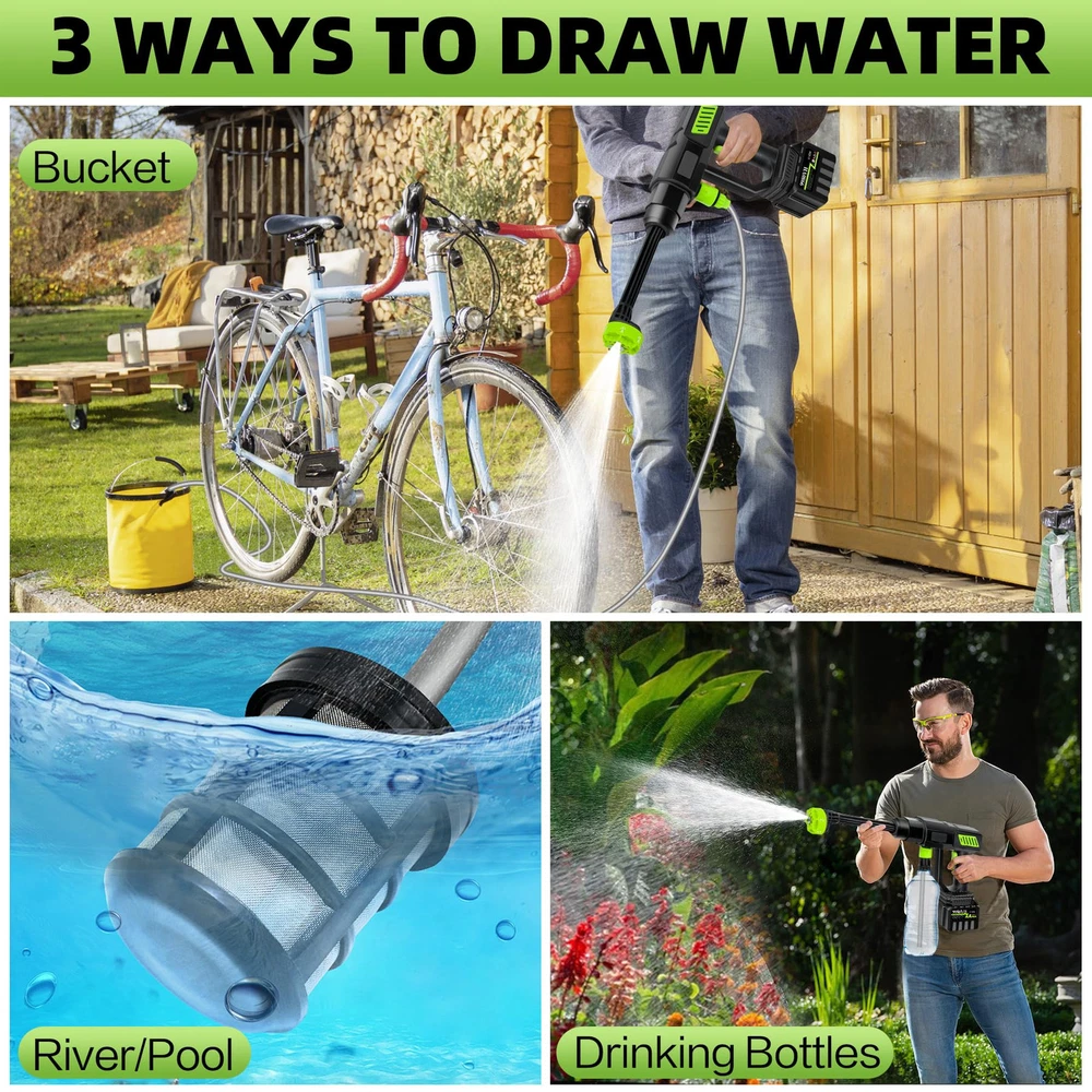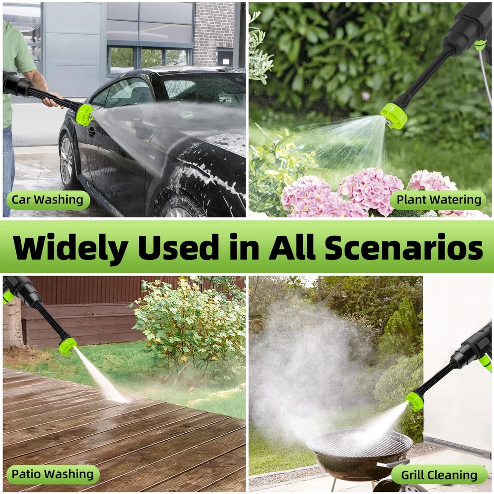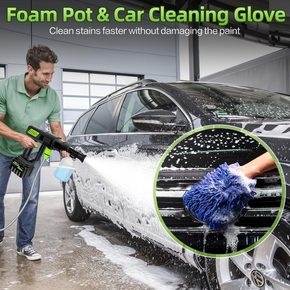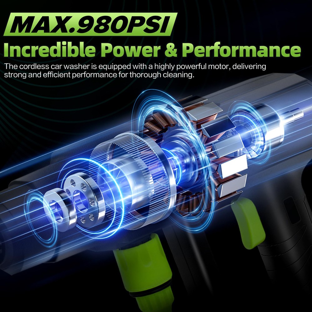 Cordless High Pressure Washer: cordless power washer provides a strong and consistent water flow that can reach to 980 PSI, effectively removing dirt, dust and debris from various surfaces. Equipped with an 18000mAh high performance battery that provides about 45-60 minutes of cleaning time on a full charge. The highly efficient cordless pressure washer gun allows you to clean all your outdoor spaces and equipment easily and quickly. Multi-function Nozzle: The battery power washer is equipped with a 6-in-1 nozzle that is suitable for 0°, 15°, 25°, 40°, straight mode, and shower mode. You can freely rotate the nozzle according to your cleaning needs. It also comes with a foam sprayer and car cleaning glove to easily remove all kinds of stubborn stains and protect your car's paintwork. Multi-functional accessories to meet all your daily cleaning needs. Portable Water Supply: The 16.5ft hose with filter basket effectively filters particles, waste leaves, and any other impurities through. Don't need to worry pipe blockage any more. cordless high pressure car washer can easily draw water from buckets, pools, rivers, drinking bottles or any water source, saving a lot of water and work time, making it the perfect pressure washer for outdoor camping and long trips. Easy to Use: The battery power washer is easy to assemble, our user manual has a detailed installation video. It's easy to get started even for first time users. All parts fit into a carrier box, a great storage space saver, making your storage a breeze. The plastic case effectively prevents accidental breakage. You can take it anywhere you want. The car washer's portability and ease of use make it perfect for various tasks around the house and yard. Multi-scenario Application:The cordless high-pressure car washer provides versatility for various cleaning needs, from washing cars to watering gardens. The cordless feature allows for freedom of movement without being tethered to an outlet. Whether you're cleaning your boat, driveway, or tackling outdoor surfaces, this pressure washer delivers reliable results every time. If you have any questions when using it, please feel free to contact us.
