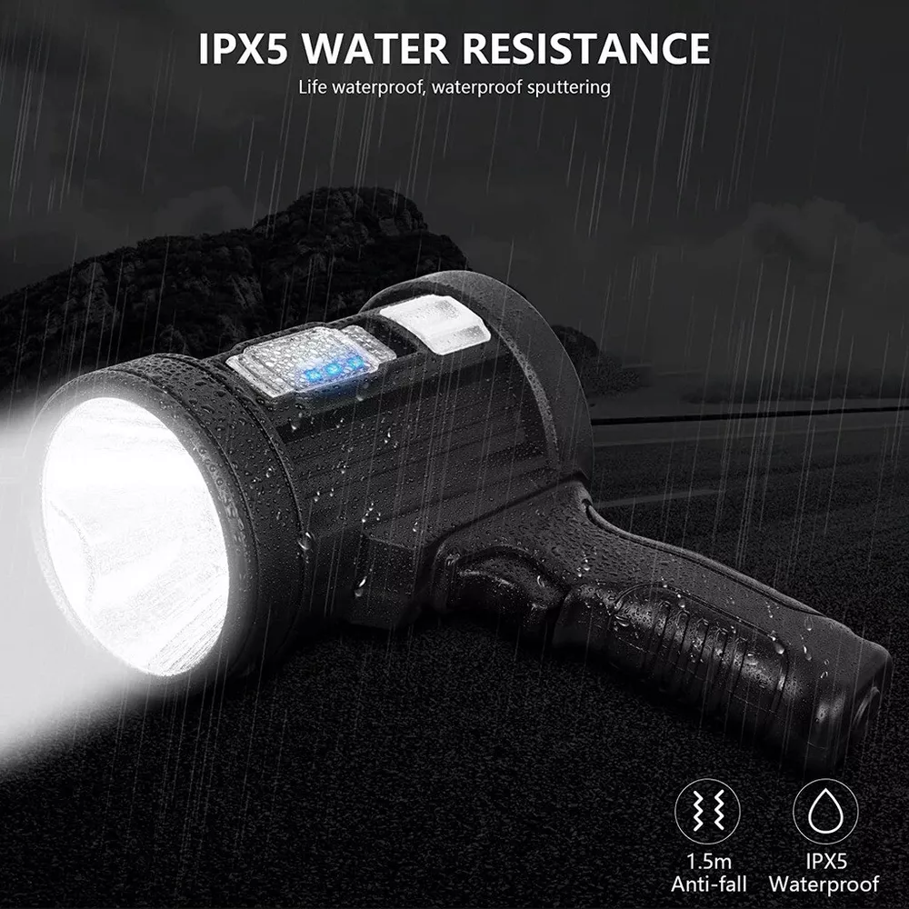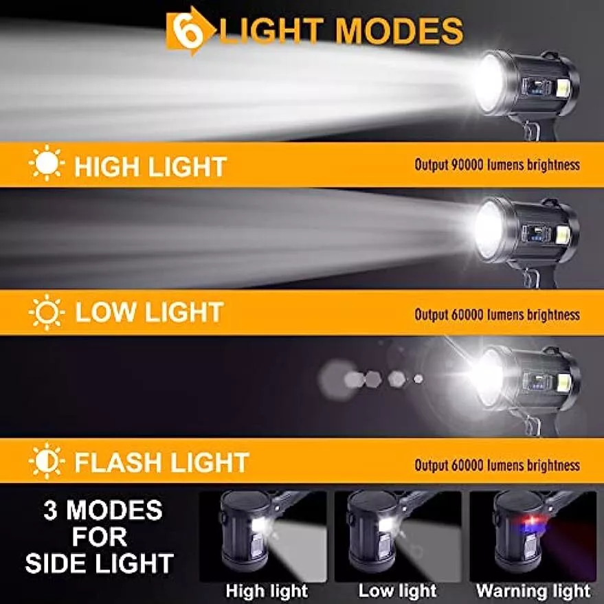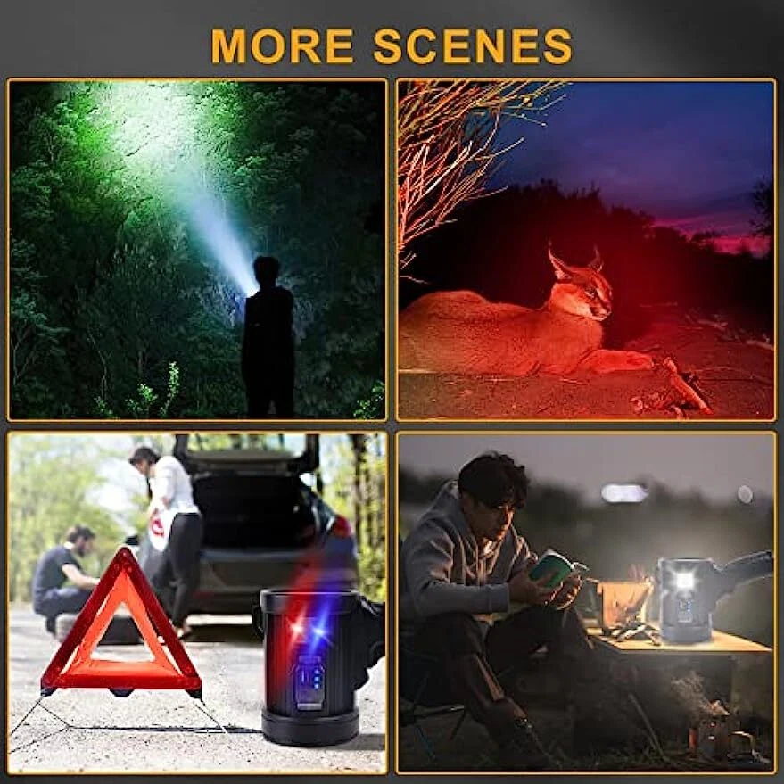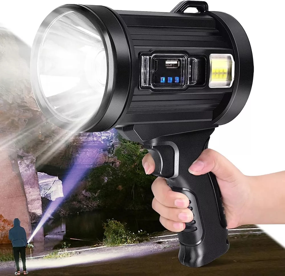 【Super Bright Large Searchlight 】Spotlight flashlights Built-in 9600mAh Battery Pack, can generate up to 90000 lumens light output,Irradiation distance is about 3280 feet(1000m), perfect for use hiking, camping, sailing or hunting outdoors, or emergency home light etcs. 【3 Main Lights Modes & 3 Side Modes】Most practical multi-functional spotlight has 3 main modes and 3 side light, front light (High -Meidum- Strobe), side light (High-Low-Safety warning light) . the warning light with red & blue light flash, which can be used as a searchlight or warning light in bad weather outdoor activities. Press and hold for 4-5 seconds to turn all off light. 【3 Charge Choice】Our solar flashlights include built-in battery USB input & output & solar, Come with a USB charging cable support rechargeable 100000 times, That's included USB Cable (4-5hrs) or by solar power (10-20hrs).The 3 blue indicator lights will show the battery situation (35%,65%,100%).USB output become power bank for your mobile phone, camera, digital product in emergency. 【IPX6 Waterproof & Durable】Super Bright flashlight ergonomic handles made of high quality ABS and aluminum alloy materials, upper tightness and IPX6 waterproof can easily handle water drops and other scratches you will encounter, Also with skid-proof, shock-proof, waterproof,rainproof, dustproof etcs advantages. 【Enjoy your 3 Color Filter】The spotlight also come with 3 color lens (red,yellow,blue), Made your own have 9 different lighting modes to indoor and outdoor activities, Put on the Blue /Yellow/Red filter both have 3 lighting modes (High - Medium - Strobe). 【Unique design】Handheld spotlight flashlight with one-touch off and power display. When you are ready to turn off the spotlight, you can simply press and hold the button for three seconds to achieve one-touch shutdown. When you turn on the LED spotlight, the power display light will automatically light up to show the real-time power level; you can also press the button next to the power display light to check the power level 【2 Years After-sale Service】Despite our best efforts, we still cannot guarantee that our led searchlights will be 100% trouble-free. So the rechargeable spot lights provide 7 x 24 hours customer service guarantee. If you receive a defective product, contact us and we will immediately send you a replacement unit for free. 【Upgraded switch Button & Package Kits】Press and hold for 4-5 seconds to turn off all lights. Spotlight kit include: 1 X Flashlight Spotlight, 3 X Filter (Red, Blue, Yellow),1 X USB Cable, 1 X Packing Box. Note: Item built-in 2pc 18650 rechargeable battery(4500mAh) Best gifts for men. The LED spotlight has has 3 main modes and 3 side light. Choose the appropriate lighting mode according to your needs. Solar spotlight is suitable for farm use, daily indoor work, and car emergency use. Nine hours full NEXTWOOD Solar Charging Spotlight We found that as an outdoor camping light, one must have an endless supply of power, so we added a solar charging panel to the outdoor spotlight, which made this searchlight one of the hottest in the entire category of outdoor handheld spotlights in the second half of 2022. This is an all-round spotlight, it can be used as a handheld flashlight, searchlight, handheld spotlight, camping light, fishing light, table lamp, desk lamp. Product main function Additional features of the product Xhp70 chip This high-power spotlight is with a xhp70 chip, stable and bright, it has a powerful output, message clearly illuminate the objects within 3260ft. 9600mAh battery Built-in large rechargeable 9600mah battery, the flashlight can be used for up to 8 hours, lighting time up to 30 hours in low lighting mode. Radiator Cup Spotlight uses an upgraded radiator cup. Prevent LED lamp beads from being damaged during use, reduce flashlight temperature and power consumption. Add 3 color filters With red, blue and yellow filters. You can switch between different lighting colors by putting on the corresponding color filter. The spotlight is equipped for a variety of scenes, is a must for home, outdoor.