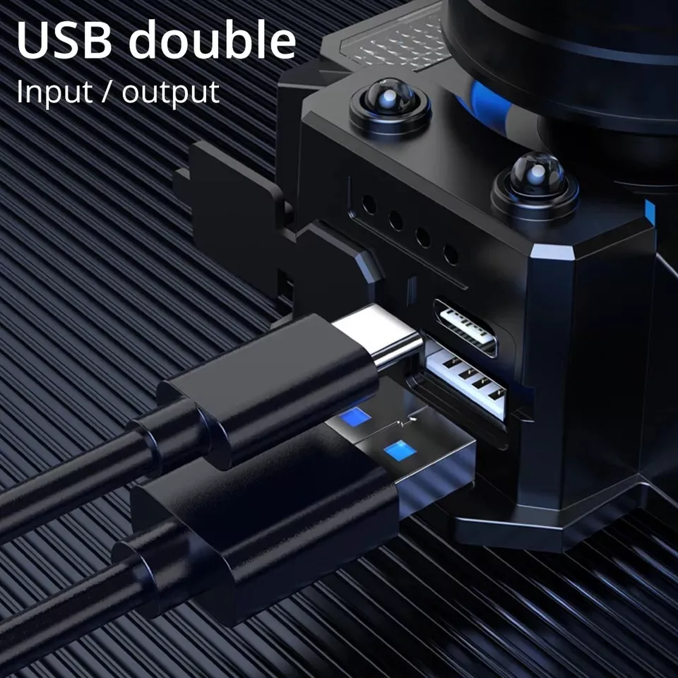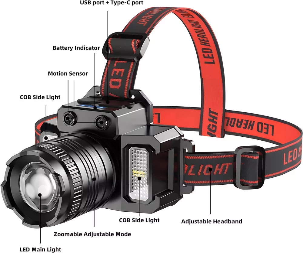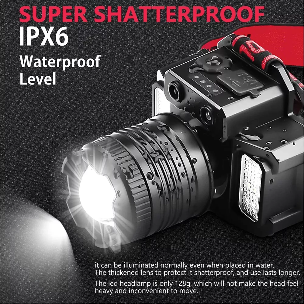 Description 1. Material: high-quality aluminum alloy + ABS material, light and durable, anti-fall and wear-resistant 2. Lamp bead: This product adopts XPG high-brightness main core, and is equipped with red and blue LED warning lights to maintain a stable high-brightness field of vision at all times 3. Zoom: Rotary zoom design, taking into account both distance and near, mechanical telescopic zoom, with optical lens, bursting with powerful light 4. Charging method: Smart USB dual interface, compatible with various charging methods, and can also charge mobile phones in an emergency, convenient and practical 5. Intelligent induction: Long press the switch to turn on the induction mode, intelligent sensitive sensor, wave induction, free your hands 6. Lighting mode: 5 gears (main light: strong light/weak light/strobe, side light: white light/side light red and blue fast flash), you can adjust the angle and light source according to your own needs, easy to operate and easy to use 7. Suitable for: camping, mountaineering, cycling, night fishing, night running, dog walking, maintenance and exploration, etc. Package includes 1*Headlamp 1*Headband 1*Charging Cable Product Highlights Name: USB rechargeable zoomable bright LED headlight Colour: Black Light color: white light + red and blue light Lamp bead: XPG+ red and blue LED Charging method: USB charging Battery: built-in rechargeable lithium battery Battery capacity: 2000mAh Charging time: 3-5h Battery life: 4-25h (100% strong light 10-12h, 50% medium light 18-20h, 25% low light 35-40h) Lighting mode: 5 gears (main light: strong light/weak light/strobe, side light: white light/side light flashes red and blue quickly) Whether to zoom: zoom Power display: 4*LED display lights (25%-50%-75%-100%) Sensing distance: within 15cm Maximum range: 300m Waterproof grade: IPX4 Product size: 45*92mm Product net weight: 128g