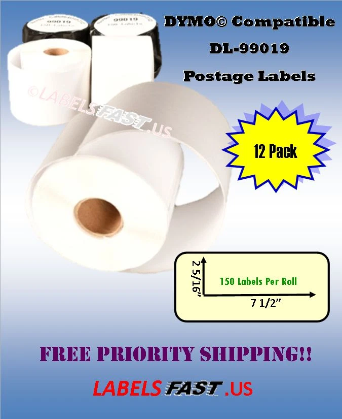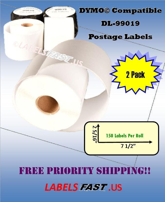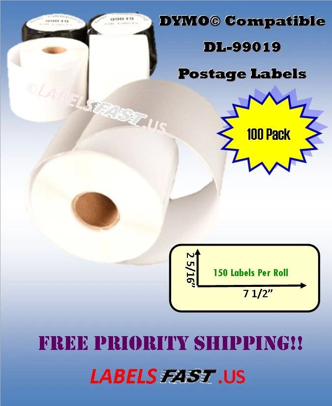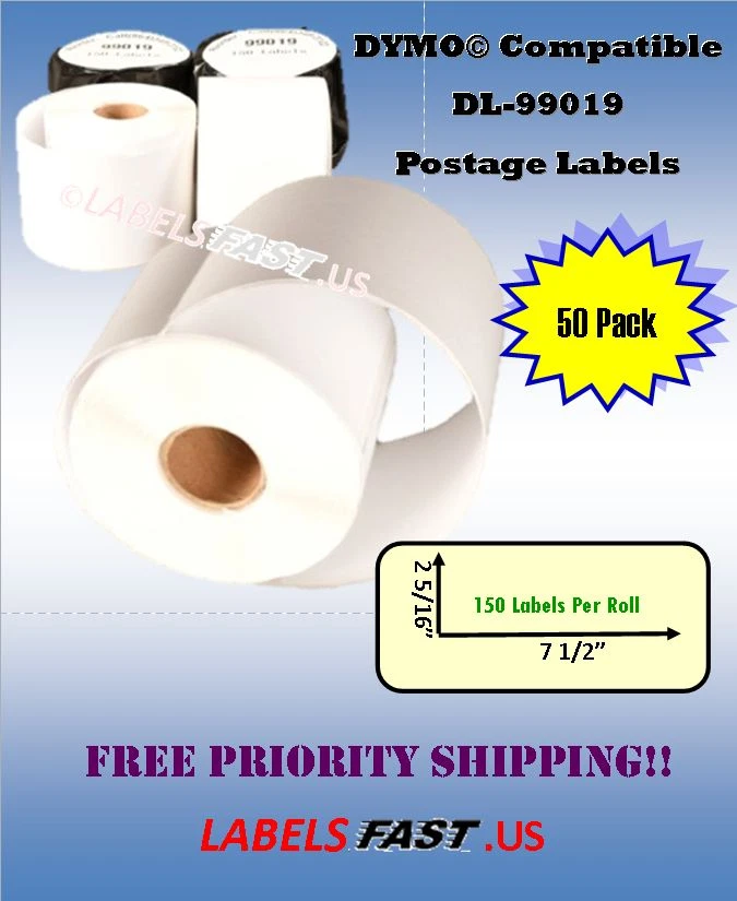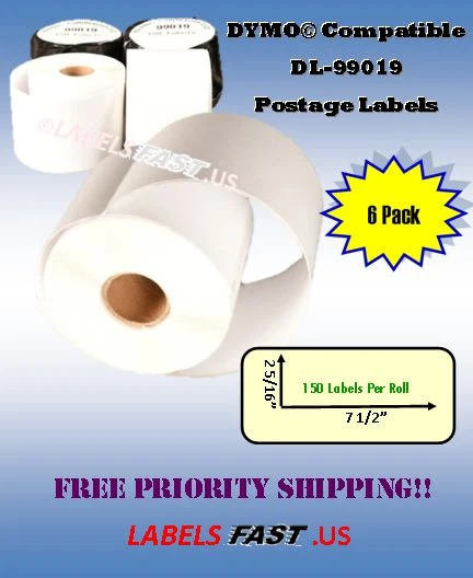 99019 - Dymo® Compatible Labels - eBay PayPal - 2-5/16" x 7-1/2" - 150 Labels 99019 Dymo® Compatible Labels eBay® PayPal® Mailing Tag Postage Stamp 150 Labels Description Dymo 99019 DYMO® Compatible 99019 Internet Postage Stamp Mail Shipping Labels White Rectangular Shaped Labels Each Label Is 2 5/16" In Length X 7 1/2" In Width 150 Labels per Roll Direct Thermal Label BPA Free Features Labels are smudge resistant. Labels are water and oil resistant. All temperature, strong, permanent adhesives are excellent for all general purpose labeling applications. Each roll is individually packed into a protective black poly bag to protect against moisture & light. Uses These rolls can be used for address/shipping labels, name badges, and many other home and business use. These thermal labels work well with USPS®, Endicia®, Click-N-Ship®, Pitney Bowes Shipstream™ Manager Deluxe, eBay®, PayPal® and other popular shipping/mailing software. These money saving labels use direct thermal printing process so you ever need to bother with messy, expensive ink or toner cartridges. Printer Compatibility Compatible with: DYMO Printers: 300, 310, 315, 320, 330, 400, 400 Duo, 400 Twin Turbo, 450, 450 Duo, 450 Turbo, 450 Twin Turbo, 4XL, EL40, EL60, SE300, SE450 CoStar LabelWriters: XL, XL+, BC, BC+, TURBO, SE200, SE250, ACII 200 / ASCII 250 Disclaimer We do not sell Dymo® branded labels. DYMO®, CoStar®, LabelWriter®, and all other DYMO® branded product names and SKU trademarks are trademarks of DYMO® Newell Rubbermaid Corporation. DYMO® Newell Rubbermaid Corporation does not sponsor or endorse any products made or sold by Labelsfast.us. Note We are environmentally conscious and minimize the amount of packaging material used in each order. Please recycle. Thank you for helping us reduce waste and be Green.