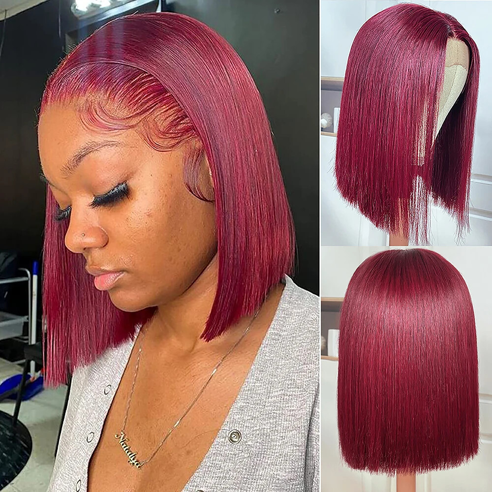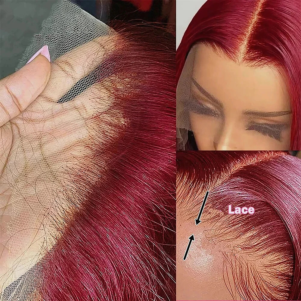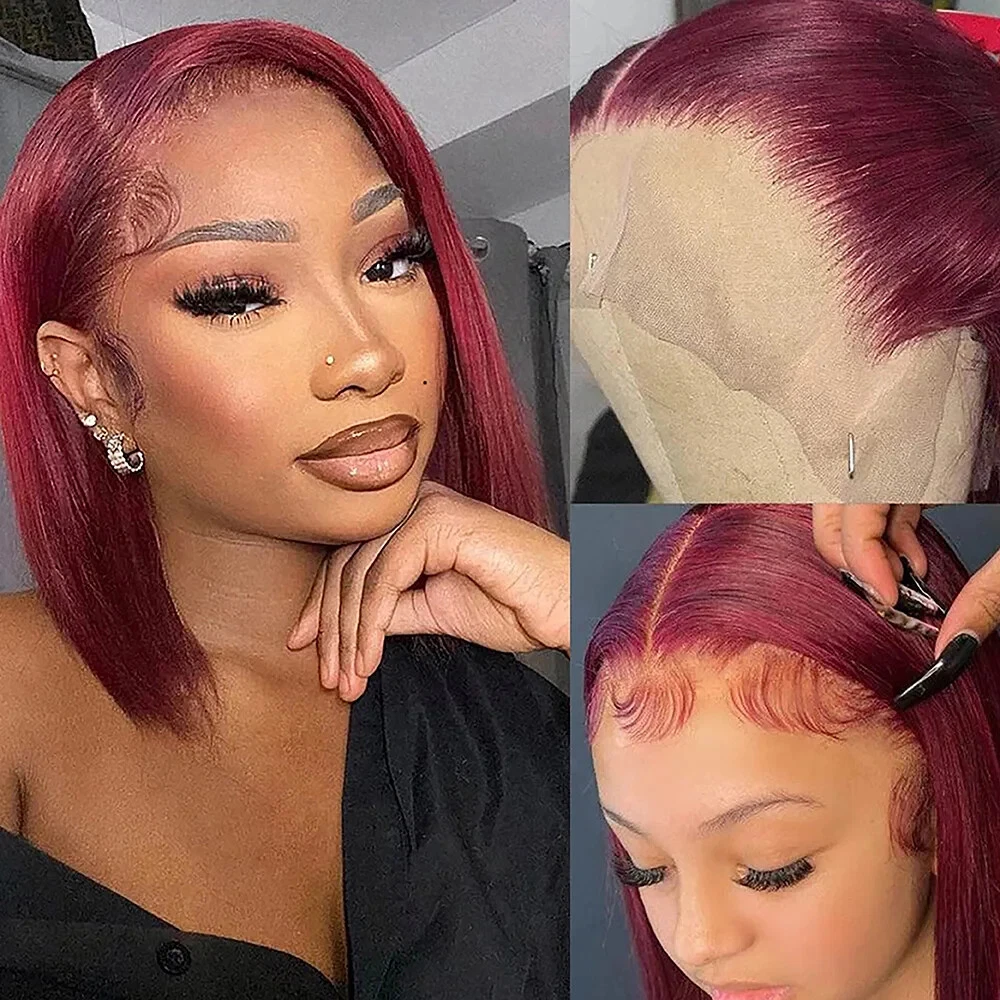 Specifications: Material: 100% Human Hair Weight: 135g-170g length: 8 inch-16inch Texture: Straight Hair Tape: Brazilian hair,Burmese hair,Indian hair,Peruvian hair Hair Style: Bob Lace Wig Hair Color: 99J Lace Color:Transparent lace Features:No Chemical,No Shedding,No Tangle,No Smell. Shiny,Smooth,Silky Hair Double Weft , Cap: Average cap size 22.5inch,4 combs in the cap to fix easily. Lace Part: 13x5x1 Lace, Pack Content: 1 * wig+1*wig cap