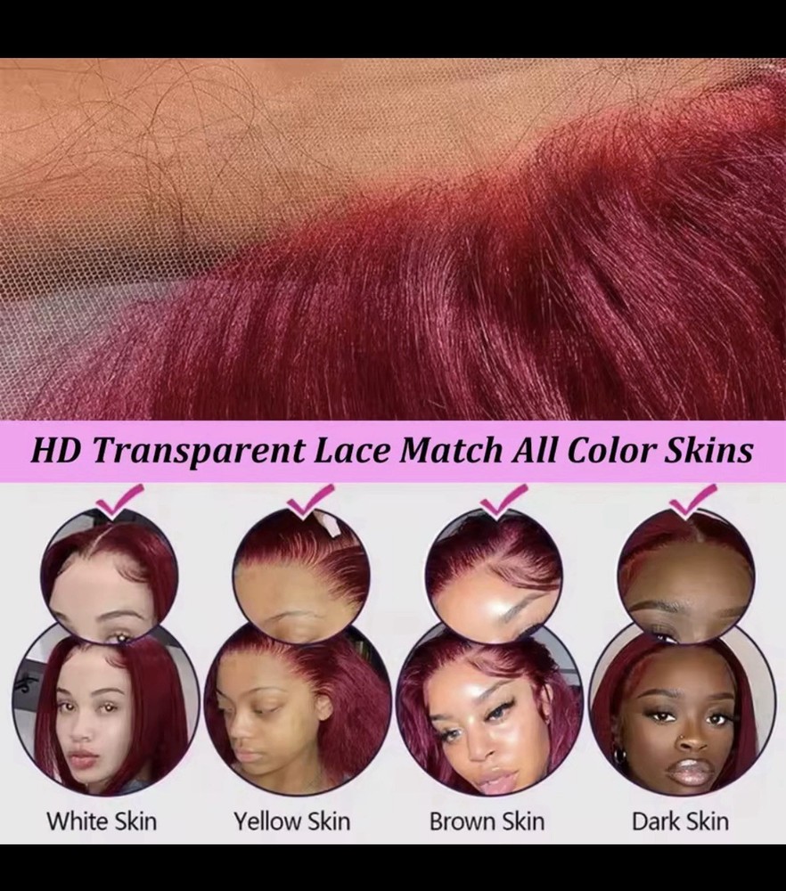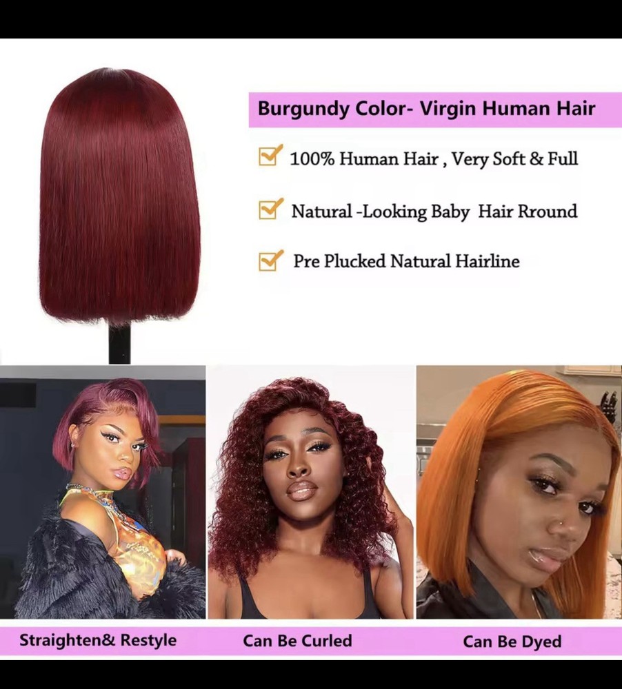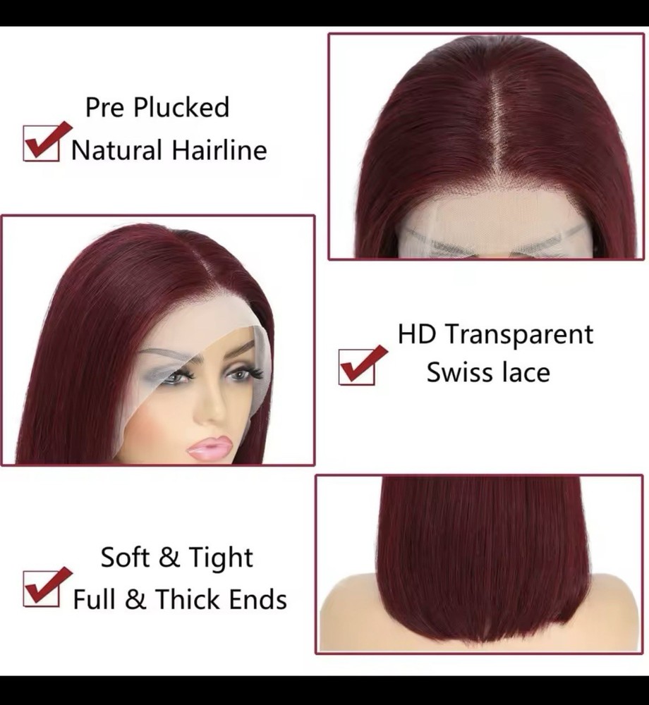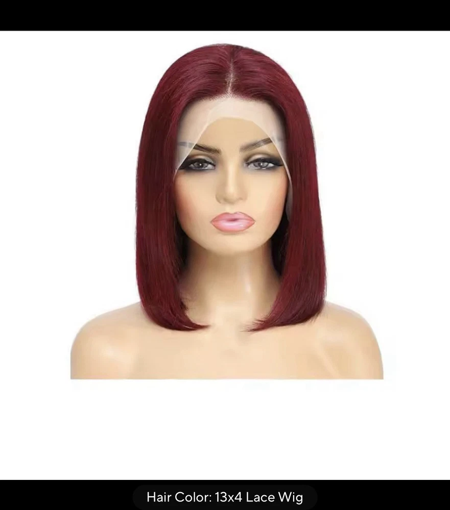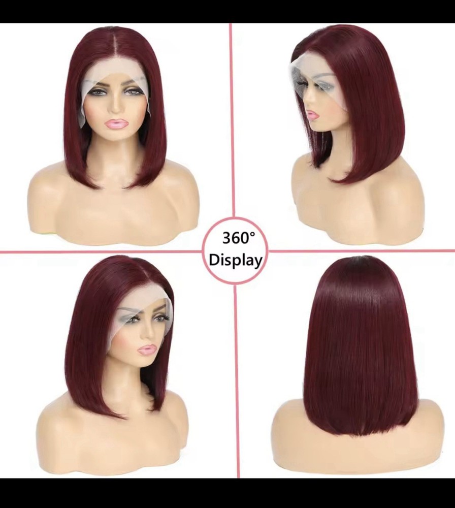 99J Short Wigs Human Hair Bob Straight Hair Wigs Burgundy 13x4 HD Transparent Lace Front Wig 180% Density Hair —12 inch