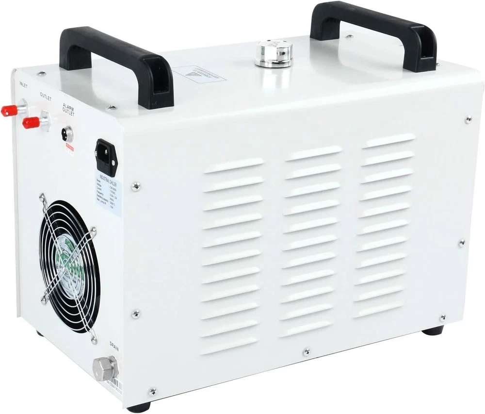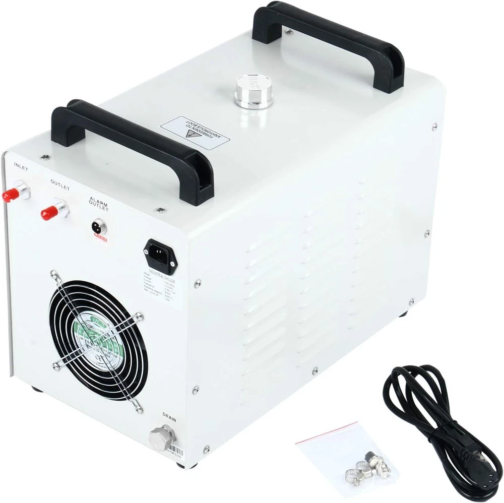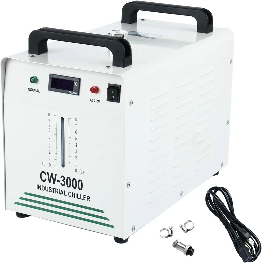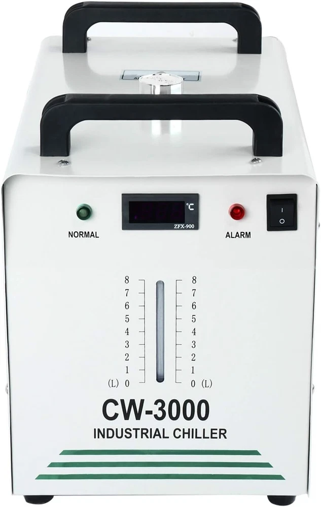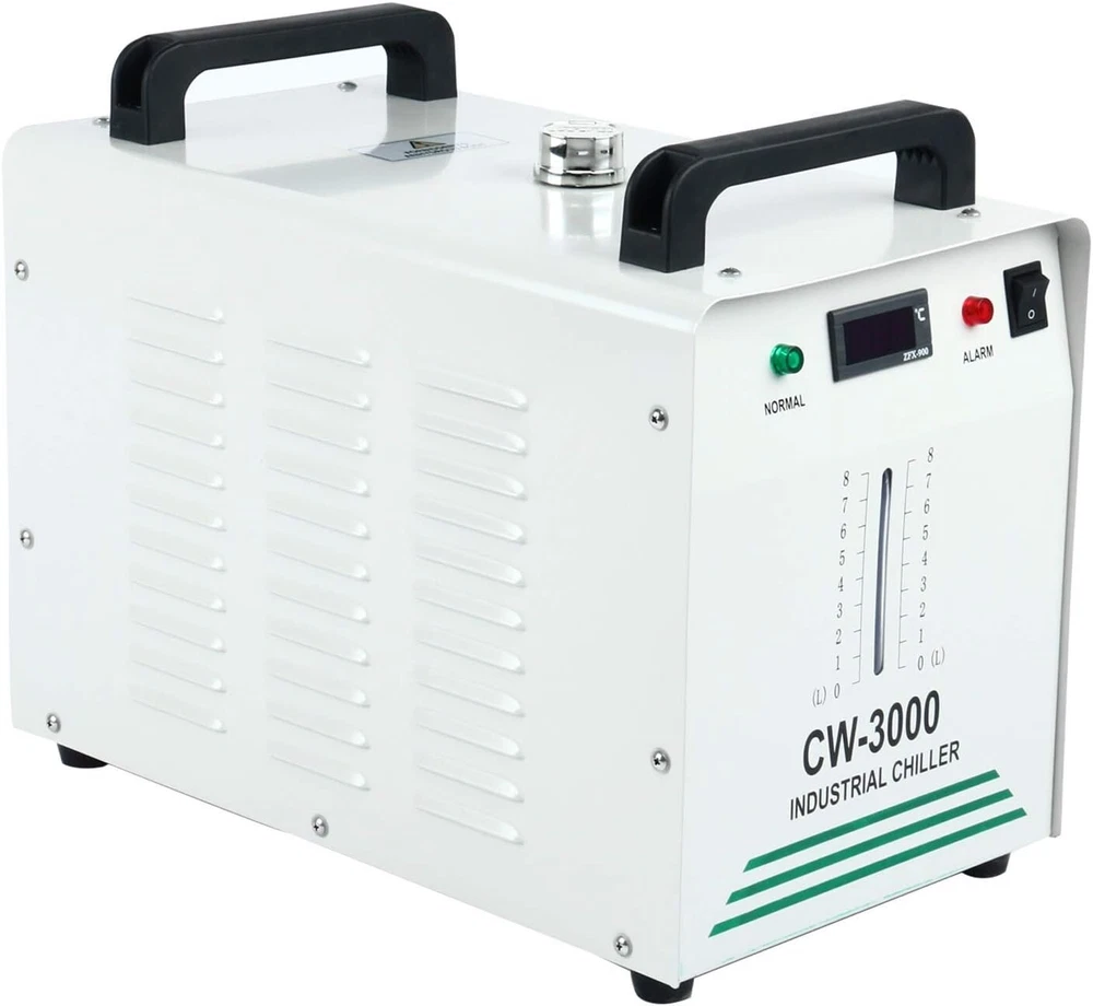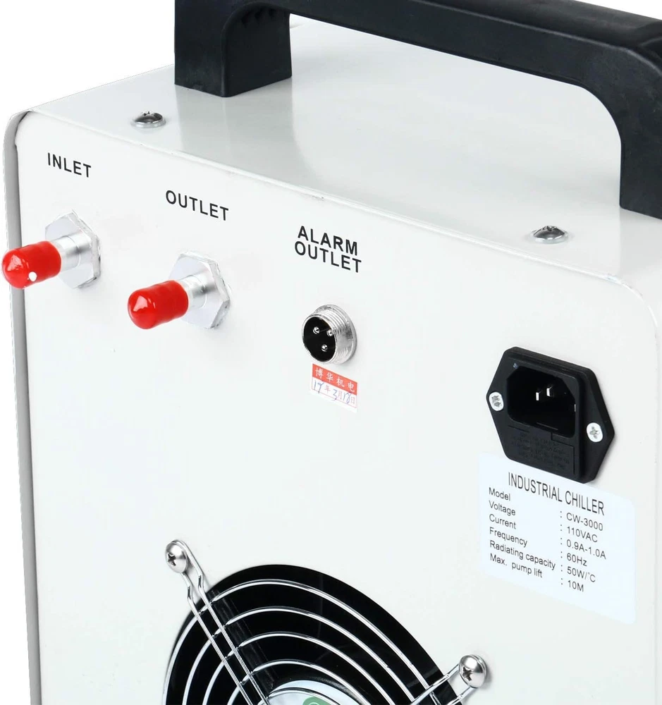 Product Description The item was actually CW-3000, pls kindly rest assured to purchase. Specifcation Model:CW-3000AG Industrial Chiller ; Application:Cool a single 80W CO2 glass laser tube or below CO2 laser tube (emitting rate lower than 60%),and for 0.8KW / 1.5KW Spindle Cooling; Amount of Cooling: 50W/℃; Maximum flow:10L/min; Maximum pumping lift:10M. The temperature changes with room temperature and is uncontrollable. It can only reach 1-45 degrees Celsius when used together with a compressor Cw5000 or above. This economic water cooling equipment , a small thermolysis water cooler, can save energy , has long working life and operate simply Professional forced air-cooled radiator,high heat dissipating capacity and not easy to be blocked,and equipped with alarm output port, can quickly protect sensitive components. This CW-3000 water chiller, comprehensive reference to the international radiator - type cooling system, is suitable for small water cooling device.