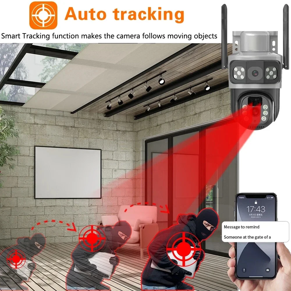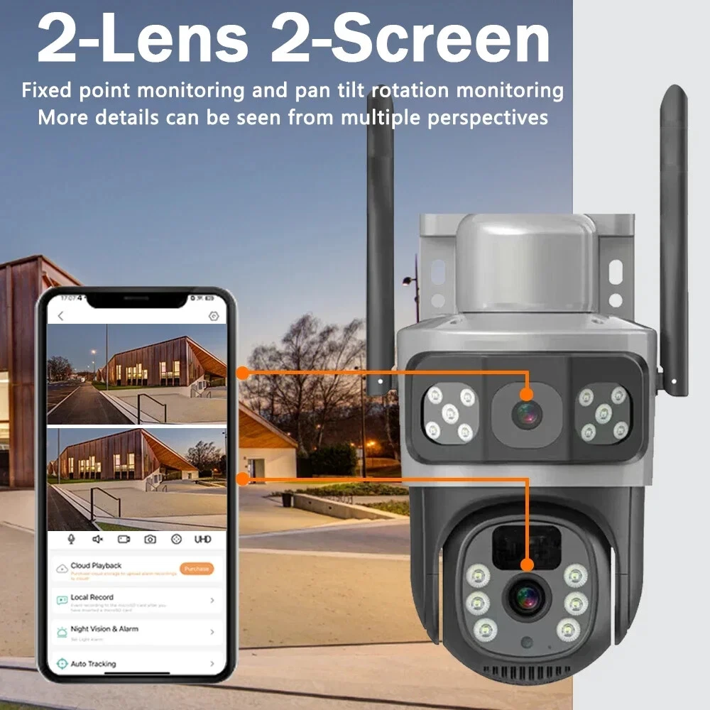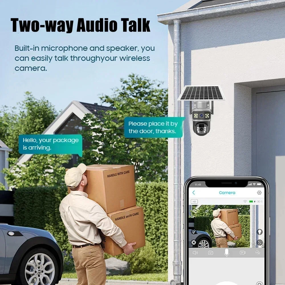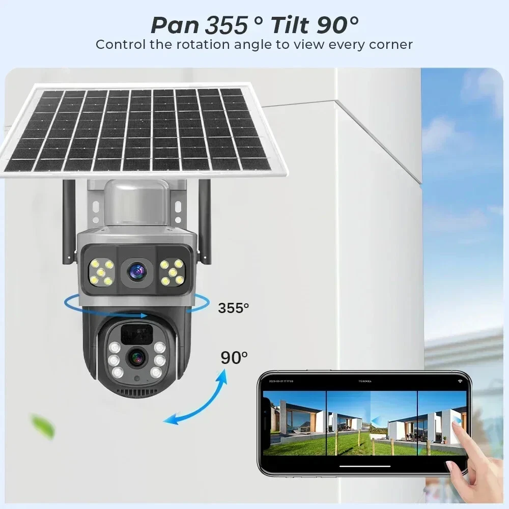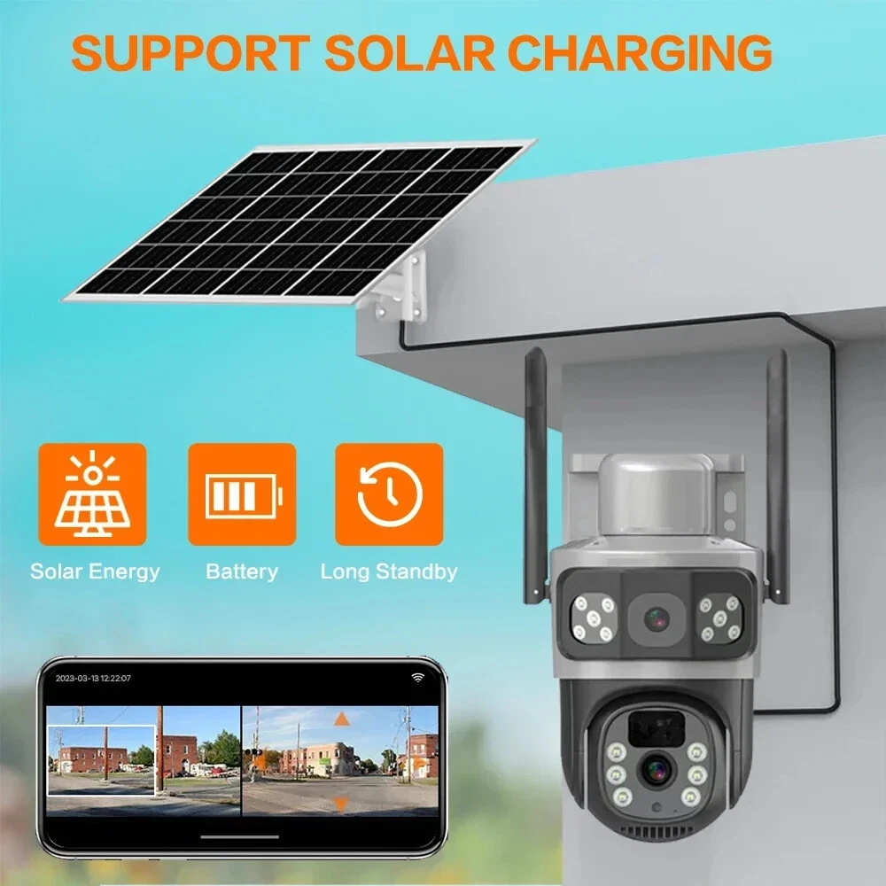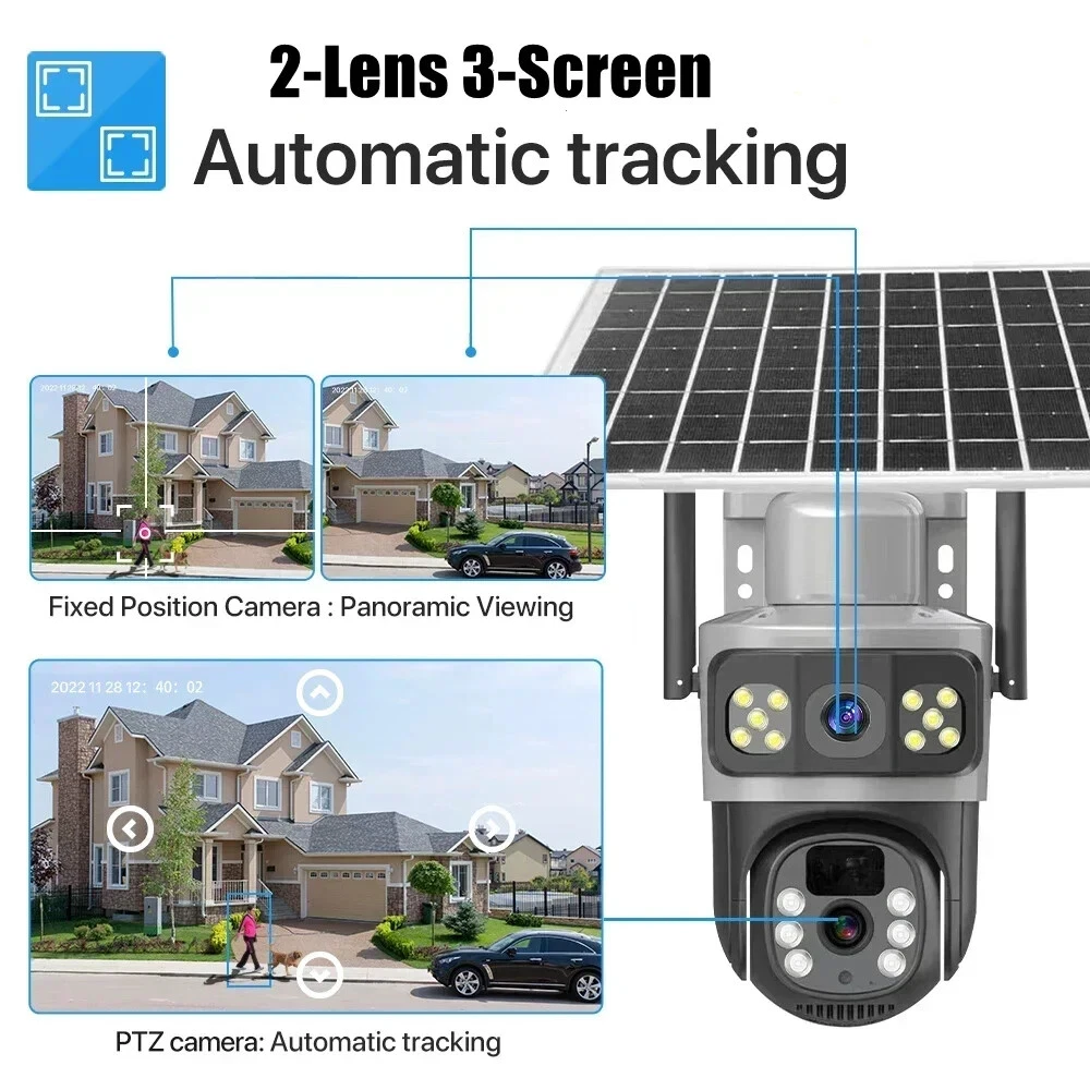 Description Features: dual lens, dual screen viewing Option: WIFI=WIFI 2.4Hz connection 1:3MP+3MP+3MP million pixel outdoor solar monitoring camera 2. High definition: Shoot with a high-definition camera to ensure the effectiveness and quality of video shooting, allowing you to have real-time control of the outdoor environment. 3. Night vision system: optional infrared or color night vision, which can monitor the doorstep in real-time at any time to ensure safe and smooth enjoyment. 4. APP V380 Pro remote operation: functions such as remote operation, photography, and video recording, allowing remote control of the outdoor environment. 5. Voice intercom: With voice intercom function, you can transmit sound to the external environment through your phone or replay the sound to visitors through the device. 6. Custom alerts: supports custom alerts, and when you receive an alert, it will immediately send an alert message to your phone 7. Multi user remote access: Share the same camera with your family, leave everything you protect, and pay more attention to your home. 8. SD card: The maximum size of the SD card is 128GB, 9. Waterproof/Dustproof Ip66: The camera casing is made of high-quality ABS plastic and has waterproof, sunscreen, and dustproof functions. It is suitable for any environment. 10. Motion detection and automatic tracking: After locking the target, the camera will automatically adjust the pan tilt rotation. Track moving objects, cars, pets, humans, and push alert notifications to your smart Phone. Package List: 1x 9MP solar camera 1x bracket 1x solar panel with extension cable 1x installation package 1x instruction manual 1x 32GB card