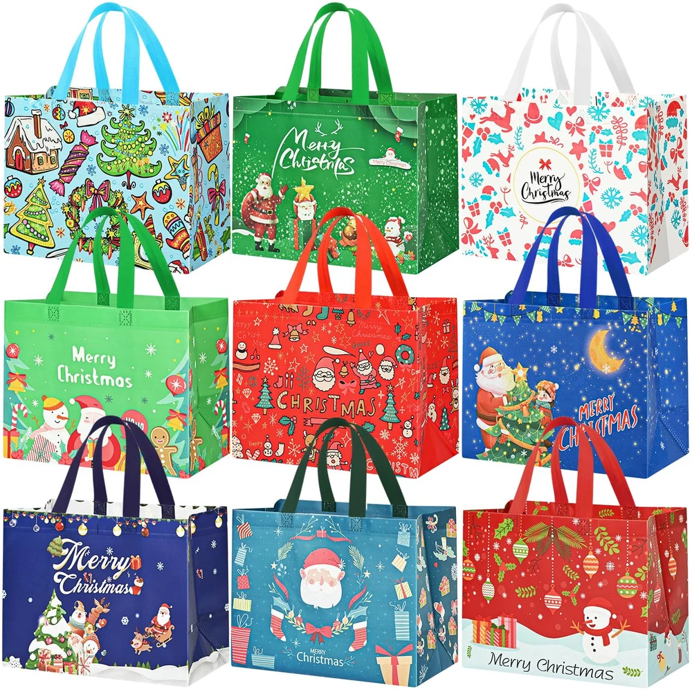 【Fun and Festive Christmas Designs】This set of 9 large christmas gift bags for kids is perfect for bringing Christmas magic to life for everyone. Each christmas gift bag features vibrant, kid-friendly holiday designs, including adorable images of Santa Claus, reindeer, snowmen, gingerbread men, and Christmas trees. With playful motifs and cheerful colors, these bulk christmas bags ensuring that both kids and adults will be delighted by their festive charm. 【Durable and Child-Safe Gift Bags】Crafted from high-quality, non-toxic, and odorless non-woven fabric, these reusable christmas tote bags are completely safe for children to handle. The widened, reinforced handles make it easy to carry even heavier presents, making them perfect for holiday parties or family gatherings. Sturdy and reliable, these xmas bags for gifts will hold up to the excitement of gift-giving without tearing or breaking, offering peace of mind for parents 【Perfect Size for Kids' Gifts】Each medium christmas gift bags measures 12.4 x 9.7 x 6.8 inches, making it an ideal size for a wide variety of children's gifts. Whether you're wrapping toys, books, or clothing, these medium-sized bags provide just the right amount of space. The sleek design ensures that your presents look polished and festive, while still being practical and easy to carry, allowing kids to enjoy unwrapping their gifts in style 【Eco-Friendly and reusable christmas bags】These holiday bags for gifts are as practical as they are fun, offering an eco-friendly alternative to traditional wrapping paper. After the holidays, they can be repurposed as christmas shopping bags or grocery bags, reducing waste and adding long-term value. Ideal for families who want to celebrate the holidays sustainably, these bags are a cost-effective and environmentally conscious choice. 【Make Every Gift Unforgettable This Christmas】Add a sprinkle of holiday magic to your celebrations with these delightful christmas bags for gifts large. Crafted to make every present feel truly unique, these bags are sure to bring joy and excitement to both kids and adults. Order now to make your holiday gift-giving more memorable and fun, while spreading festive cheer to everyone!