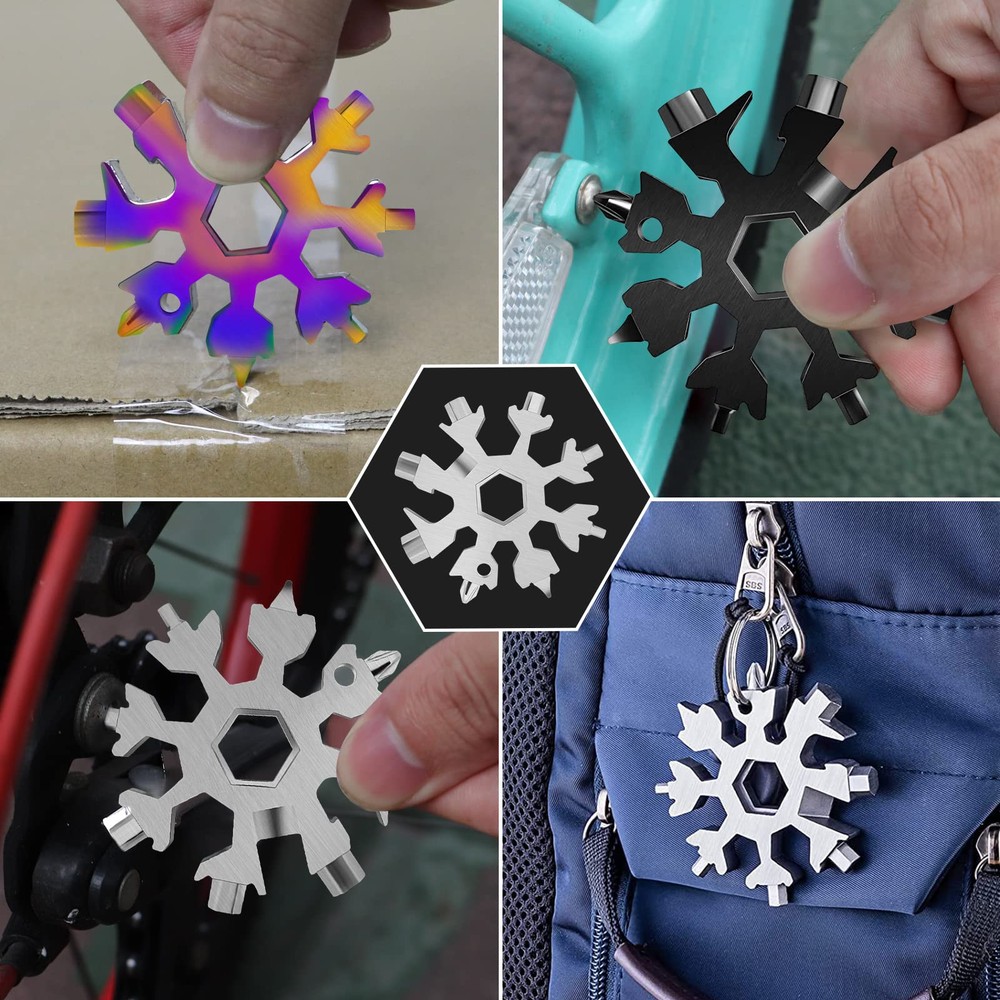 18 in 1 JOLLY SNOW SNOWFLAKE MULTITOOL:Each snowflake tool has more than 18 uses,such as hexagon screwdrivers,wrenches,slotted screwdrivers ,phillips screwdrivers of different sizes.It can be also used ,Bottle Opener, Box Cutter,Rope Cutter,Gift Hanging Drop,etc. SMALL SIZE& KEYRING DESIGN: Our snowflake multi tool is Pocket Size.It just over 2.5" in diameter.It is so easy to be taken along.Because snowflake tool comes with a key ring that can be hung on a key or backpack.Key ring is designed to avoid the possibility of loss. MULTIPLE USES: One snowflake tool to unlock for multiple purposes.One snowflake multitool can be used to open the beer bottle,turn the screw,fix snowboarding,bicycle,Toys and more.It can be also used to open the carton, hung on the key or backpack. Hang on the Christmas tree for decoration or as a gift.When camping,rescue,boarding also be used. BEST CHRISTMAS GIFT: You will get 9 x multi-tool,9 x key rings,1 x Merry Christmas gift card,1 x gift box.It is an excellent gift for Christmas gifts.It's a good choice whether it's for Christmas decorations or as gifts. STURDY&DURABLE:Snowflake tools 18-in-1 multi-tool is made of high quality stainless steel,exquisite workmanship.It is so sturdy and durable.Unique snowflake shaped design.Combine function and design in our compact multi-tool. Practical and beautiful.