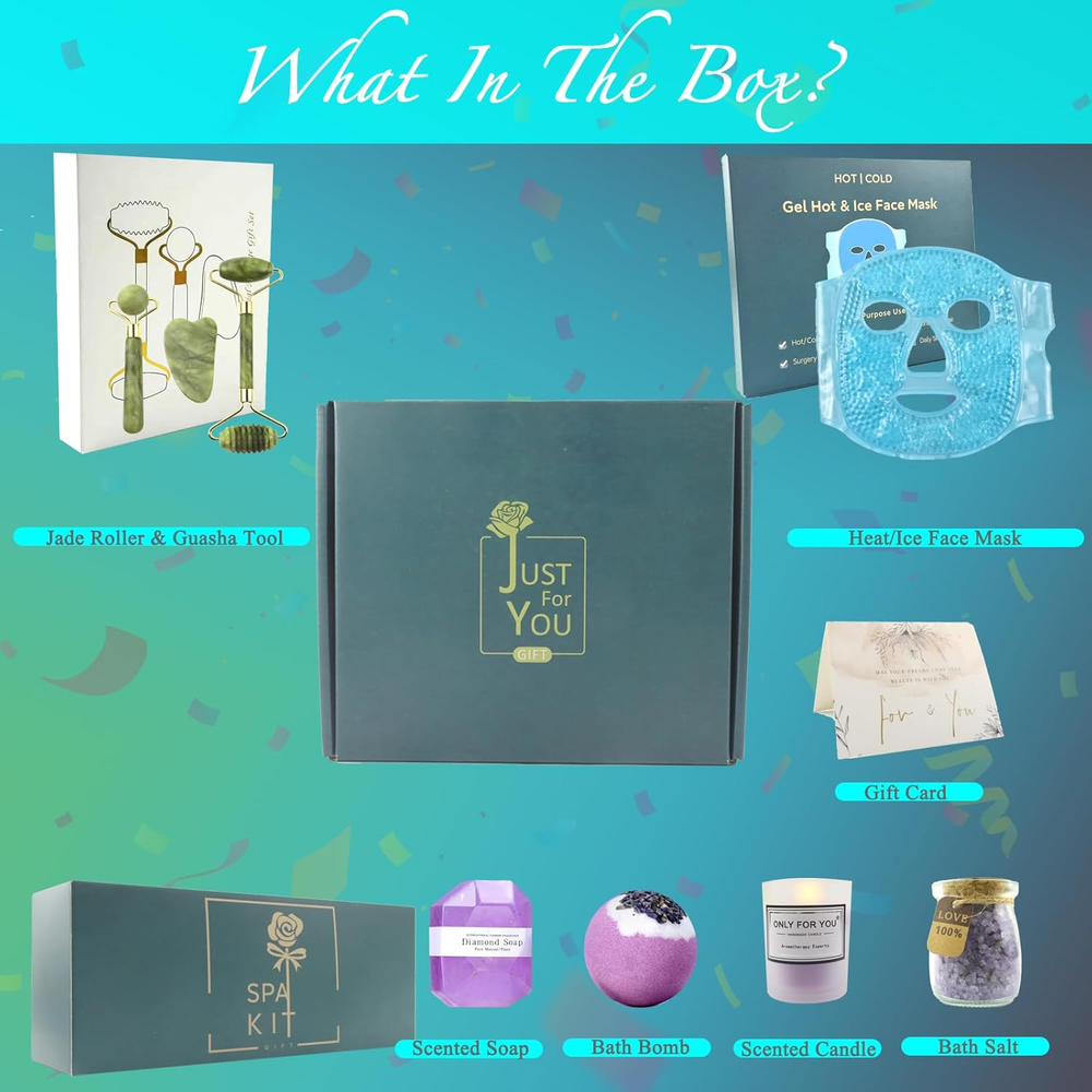 Business is our speciality NEW Birthday Gifts for Women 9Pcs Skin Care Tools Gifts Basket Christmas/Valentine’S Day/Mothers Day Gifts for Girl Friend Sister Mom Wife Girlfriend Coworker FEATURES 🎁 Unique Gifts for Women - Just For You: All items in TEESTOU women gifts basket are specially designed and curated with quote “JUST FOR YOU” to make her felt valued and special and bring her smiles and happiness. It's filled with love, devotion and appreciation. It is an ideal Birthday Gifts, Christmas Gifts, Valentine’s Day Gift, Mother’s Day Gifts, Anniversary Gifts or for any special moment to celebrate 🎁 What In the Gift Box - Skin Care Tools : The gifts basket include 9pcs practical skincare tools for your recipient to do daily skin regimen: 2pcs jade rollers and 1pcs GuaSha tools for face, 1pcs reusable heat & cold therapy face mask, 1pcs scented candle, 1pcs scented soap, 1pcs fizzy bath bomb, 1pcs bath salt, 1pcs greeting card. No matter for self use or gifting her, It's just a very cost-effective investment 🎁 Best Friend Birthday Gifts for Women - Spoil Her: The jade roller and guasha tools for face are 100% handcrafted with authentic Jade Stone, they can offer a host of radiance-boosting benefits to skin, from helping to sculpt and define your jawline to subtly smoothing out wrinkles & fine lines,reducing puffiness,aid lymphatic drainage, and help skincare products better absorbing into skin. Easy to use at home or on travel. It is a perfect gift idea for family/mom/wife/sister/best friend/girlfriend/coworker/employee/aunt/mother-in-law and more 🎁 Self Care Gifts for Women - Comfort Her: Add the ice face mask to daily skin-care regimen, start a cold treatment in the morning to reduce puffiness and tighten the skin; after a day work, end in a cold therapy to reduce inflammation and redness, repair sunburn, relief pain. Get better sleep and wake up with better skin; or get a heat therapy to assists in promoting blood circulation for a more youthful complexion. It is a perfect get well soon gifts/appreciation gifts/thinking of you gifts for the women who have everything 🎁 Gifts for Any Occasion With NO-Risk Shopping: No matter gifting her on small or big occasions, We're confident that this unique skin care gifts basket is sure to bring her happiness and joy. It is a perfect Birthday gifts/Christmas gifts/Valentines Day gifts/Mother’s Day gifts/get well soon gifts/appreciation gifts........We offer a no-questions-asked refund policy if you are not satisfied with this gifts set. So, let’s make her happy Product Description TEESTOU Gifts Set for Women All items in TEESTOU gifts basket are specially designed and curated, it fills with love and care, elegant design box with nice presentation that’s so chic, it requires no gift wrap. Just a perfect beauty gifts for skin care lovers. Delight any woman on your list with this unique skin care tools gifts basket, and make her holiday unforgettable. Perfect as gifts for mom grandma ,birthday gifts for women, valentines day gifts for her, mother's day gifts for mom, anniversary gifts for wife, wedding gifts, Christmas gifts, women gifts. Gifts for Versatile Occasions The jade roller and guasha tools for face combine with ice face mask are the secret to smooth skin all year long. It is great Birthday gifts, Christmas gifts, Mother's Day gifts for mom, Valentine's Day gifts, Anniversary gifts, Appreciation gifts, Thank you gifts, Thinking of you gifts, Get well soon gifts, Mother's day gift for mom women her mother grandma sister ladies............ Also, it suitable for office gift exchanges or a sweet surprise for someone you don't know all that well. Perfect Yankee Swap gift, exchange gift idea, white elephant gift, secret Santa party gift, gag gift, novelty gift, office party gift, funny white gift exchanges, hilarious present What 's in? - 9pcs Skin Care Tool Gifts Box for Women If your friend or special person is still struggling with puffy face, then this skin-care tool set is precisely what she need. It comes with: 1 Elegant gifts box with "Just For You" quote, make your recipient felt special , cared, and loved. 2pcs jade rollers and 1 pcs guasha tool for face 1pcs heat/cold treatment face mask 4pcs spa relaxation gifts kit ( lavender theme scented soap, bath bomb, candle, bath salt) 1pcs greeting card ( express your love, care or appreciation freely) Every time she use them, she'll think of you. Mom birthday gifts, Mom gifts, Mother's day gifts for mother, Mother day gifts from daughter, Great mothers day gifts for mom Jade Roller & Guasha Tool for Face Care The jade roller and guasha tools set marks the beginning of your girl's brand-new face care routine. It come with 2pcs jade rollers and 1pcs guasha tool for face. They help to reduce puffiness, sculpt and define your jawline, smooth fine lines, aid lymphatic drainage, and help skincare products better absorbing into skin. Heat & Ice Therapy Face Mask - Face Spa The Cold Face Mask Ice Pack is designed to be safe and effective for use on the face and eye area with versatile use. The adjustable elastic strip is easy to fix the mask on face but not stick hairs; the velvet fabric is comfortable and soft to touch. It can be used as a cold pack to reduce face puffiness, dark circles, relief stress and repair sunburns. On the other hand, it can be used as a hot pack to soothe migraines, headaches, and promote relaxation. It provides a soothing facial spa experience and is suitable for women of all ages . The facial mask is reusable and has a long lifespan, making it a cost-effective skincare solution. Enjoy the benefits of a cold face mask. The ice face mask is an effective tool to repair sunburns or relief hangovers. It is a perfect gift idea to honor the special women in your life, like mom, wife, sister, best friend, besties, auntie, wife, girlfriend, coworker, employee, and more, funny gifts for women, friend birthday gifts for women, cancer care gifts for women
