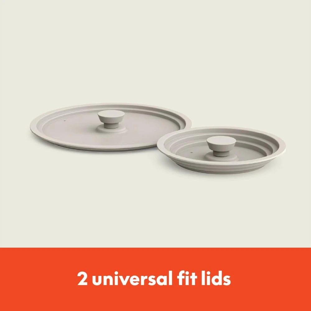 The 9-Piece StoreMore Cookware Set is the perfect blend of functionality and space-saving design, ideal for home chefs who want performance without sacrificing kitchen space. Each piece nests together, saving up to 50% more space, making it perfect for any kitchen, big or small. Available in four stylish colors—Oatmilk, Surf, Plum and Black—this pots and pans set complements any kitchen décor and is a thoughtful addition to wedding registries, housewarming gifts, new apartments, or even college dorms. Crafted with our Ceramic Nonstick Coating, which is free from PFAS, PFOA, PTFE, lead, and cadmium, you can cook with confidence knowing that your meals are healthier and your cookware is eco-friendly. This versatile set includes a 2qt saucepan, a 5qt saucepan, a 10" deep wall fry pan with a helper handle, and a 3.5qt sauté pan—perfect for creating a wide range of dishes. Imagine whipping up a vibrant Moroccan tagine, a rich and creamy Thai coconut curry, or a colorful Spanish paella, all with ease. Compatible with all stovetops, including induction, and oven safe up to 325°F, this non stick pots and pan set offers flexibility and convenience. Plus, cleanup is a breeze with dishwasher-safe pieces, though hand washing is recommended to maintain their pristine condition. The cooking set is not just a practical addition to your kitchen—it’s a stylish, thoughtful gift that’s perfect for any occasion.