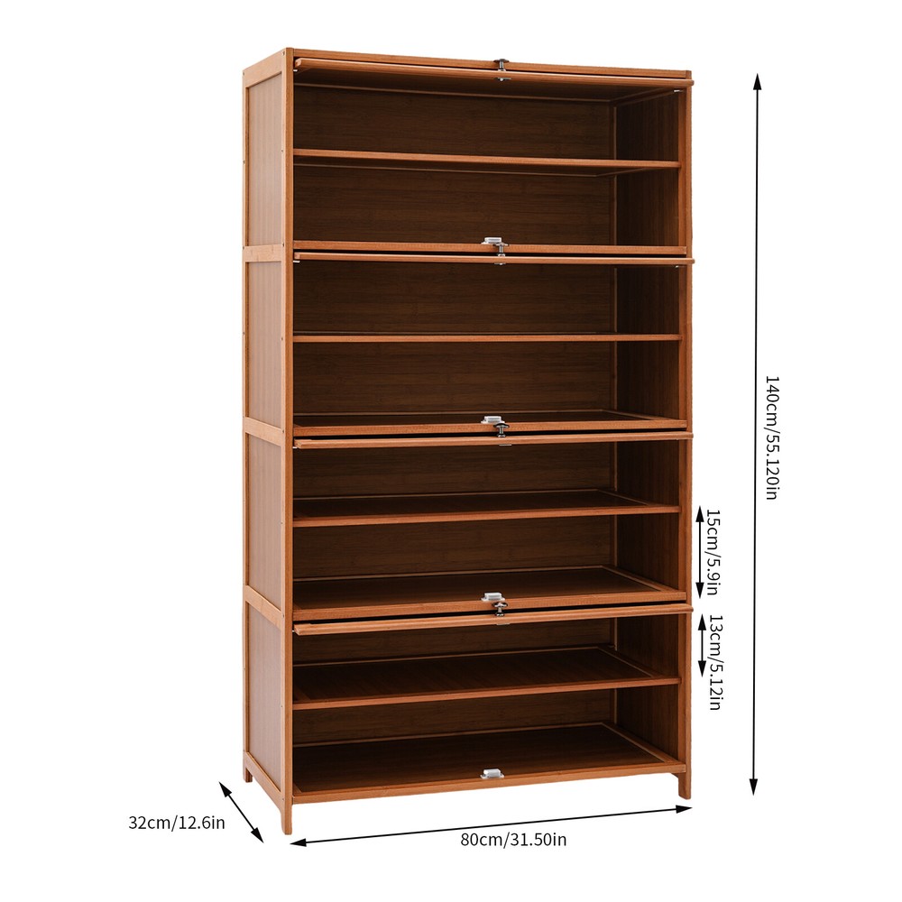 9-Tier Bamboo Shoe Rack Cabinet Shoe Cabinet With Flip Door For Storing Shoe New Description This shoe cabinet is not only sturdy and durable but also thoughtfully designed and powerful. The 8-tier inner design allows you to sort a variety of shoes, while the open space on the outside allows you to store other items such as table lamps, books, and cups. Flip-up doors with handles are easy to open and close, as well as keeping the inside of the product clean, dry, and odor-free . With this product, you can create a neat and cozy environment, so that you can have a good mood every day! Key Features Build to Last : Premium bamboo and composite board make this product environmentally friendly , safe, wear-resistant , corrosion-resistant , and less prone to rusting, so it can maintain aesthetics and practicality for a long time. Spacious Storage Space : The interior of the shoe cabinet features a 8-tier structure that is spacious and has a door on every two tiers, which is enough to accommodate a family's shoes, providing you with the convenience of storing different categories of shoes in separate sections. In addition, the large platform on the top is convenient for storing your bags, keys, umbrellas, toiletries, and more. Ingenious Design : The sealed storage system effectively protects against dust and ensures that the interior space is pure and uncluttered. The flip-up door design allows you to open the door and push it in for storage without taking up too much space. You can keep the inside of the shoe cabinet dry by opening the door to ventilate and dissipate odors. Strong Bearing Capacity : High-quality material, rectangular structure, and multiple sturdy long screws make this product can withstand 22.05-33.07 lbs in each tier, so you can use it with confidence without worrying about collapse. Simple Installation : The simple structure, pre-drilled holes, and complete accessories allow you to complete installation and start using it in a short period. Ideal Gift : Beautiful appearance and practical function make it can be a housewarming gift for family and friends. Effortless Clean : The smooth surface and simple structure make the storage cabinet easy to clean with water and a damp cloth, making this cabinet look brand new. Protective Package : To prevent the product from being damaged during transportation, we packed it with foams to protect your products to the maximum extent possible. Customer Service : We aim to provide quality products and services. If you have any problems, please feel free to contact us. We will reply and solve the problem for you as soon as possible. Details Suitable Tier-spacing : 5.91in and 5.12in tier spacing allow each tier to have enough height to accommodate shoes, which not only avoids the risk of extrusion and deformation but also ensures convenient and smooth access. Handle : It provides a comfortable touch and makes it easy for you to open and close the cabinet door. Raised Bottom : It facilitates air circulation and ensures that the bottom is ventilated and dry. Glove : It will help you to install and protect your hands. Smooth Edges : They not only enhance the aesthetics of the product but also improve safety during installation and use. Application It is suitable for gardens, terraces, porches, living rooms, or bedrooms for storing shoes, trainers, sandals, sundries, toiletries, flower pots, and so on. Specifications Material: Bamboo, Composite Board Process: Painting Color: Brown Style: Modern Shape: Rectangular Mounting Type: Floor Standing Assembly Required: Yes Number of Tiers: 9( Including the Top Floor) Each Tier Bearing Capacity: 10-15kg/22.05-33.07lbs Tier-spacing: 15cm/5.91in, 13cm/5.12in(After Lid Flipped Up ) Product Size: 80*32*140cm/31.5*12.6*55.12in Gross Weight: 15.5kg/34.17lbs Net Weight: 15kg/33.07lbs Package Size: 162*34*12.5cm/63.78*13.39*4.92in Package Included 1*Shoe Cabinet 1*Glove 1*Chinese Manual All Accessories for Assembly Notes Please confirm the installation dimensions before purchasing. We recommend that it be installed by two people and that other items are not included. Please allow the slight color difference caused by the shooting light and 1-3 cm error due to manual measurement, and make sure you do not mind before ordering. Payment Delivery details Terms of sales About us Contact us Payment We accept ebay payment 。 Fees such as import duties, taxes are not included in the item price or shipping costs. These charges are the buyer's responsibility. Delivery details Shipping: 2-9 working days to: USA Terms of sales We maintain high standards of excellence and strive for hundred percent customer satisfaction. Feedback is very important to us. We hope that you contact us immediately before you give neutral or negative feedback, so that we can address your concerns. It is impossible to address issues if we do not know about them! About us Your satis faction is our ultimate goal. We work hard to earn your trust and future business. Our certified technicians have tested each item before shipping. The unit comes with 1 year limited warranty on all manufacturing defects. a) If you receive a defective item, you may return it or ask for a discount. Please contact us within 14 days after you receive the package. b) What you returned must be intact and in its original packaging as re? u. Customer is responsible for shipping costs of the returned item. c) We will cover the cost of shipping back t with the shipping rate indicated in the registration page. We will send you a new unit or refund the full payment you paid. Thank you. Contact us Business Hour Business Hour: Monday To Friday: 8:30 AM to 5:00 PM (Beijing China time) Due to time zones, our reply to your questions may not be immediately. But within above working time, we will reply your email within 24 hours. If it's non-workdays, please kindly be patient and wait till Monday. Please contact us with ebay message. Please feel free to contact us if you have any question
