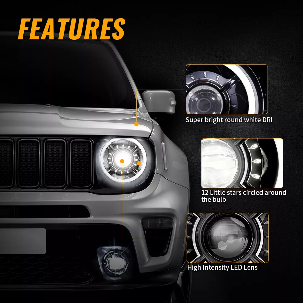 9inch LED Halo Headlights +LED Fog Lights Assembly For Jeep Renegade 2015-2018 FITMENT For Jeep Renegade 2015-2021 9 Inch DOT Approved LED Headlights SPECIFICATIONS Height: 250.4mm/ 9.86inch Width: 237.3mm/ 9.34inch Depth: 203.6mm/ 8.02inch Color Temperature: 6000K Voltage: DC 12V Power:50W@High Beam, 30W@Low Beam Lumens:5000lm@High Beam, 2400lm@Low Beam Position lamp:3.9W Outer Lens Material: PC Outer Lens Color: Clear Housing Material: Die-cast Aluminum Housing Color: Black DESCRIPTION DOT Compliant-- The DOT-compliant headlight lights guarantee your lights are Compliant in the United States Department of Transportation for use in the U.S. & Canada to secure the safety of others. Exclusive Latest Design Headlights-- 12 starry and “X” design with Halo ring. Projector and reflector combination, ensure the lights source pass through the cover in high transmission rate, keep the light steadier concentrated. More brighter 3 times than stock halogen bulbs or other similar led headlights. Provides you the best driving experience. Super Brightness-- High Beam@2600LM Low Beam@1400LM Pure White DRL Daytime Running Lights for 9 Inch LED headlight. Built-in antiflicker harness to avoid any flicker issues. Sharp cut-off line with perfect halo beam pattern gives off a more even light, NOT blind other drivers while providing the brightest and widest vision. High Quality & Durability-- Better Waterproof with 3 rebreather valves on the back to avoid fog get inside the headlights. Die-cast Aluminum Housing and Anti-scratch Polycarbonate lens will resist the test of time up to 50,000 hrs. 4" Round LED Fog Lights SPECIFICATION Diameter: 91.8mm/ 3.61 inch Depth: 76.9mm/ 3.03 inch Color Temperature: 6000K Voltage: 12V DC Power: 27W Lumen:1200lm Outer Lens Material: PC Housing Material: Die-cast Aluminum Housing Color: Black DESCRIPTION Durable Construction-- The steady housing is made of strengthened PC lens and Die-cast aluminum that the lifespan is more than 50,000 hours which it's strong enough to deal with all kinds of bad conditions. Excellent Heat Dissipation System-- Die-cast aluminum alloy housing can efficiently dissipate more heat and keep cool, make the lamp lifespan that more than 50,000hrs; IP waterproof 67 rating ensures all-weather dependability. Easy Installation-- Just Plug and Play. Complete set fog Lights are designed to simply plug into your existing wiring without any cutting or drilling. Safe Driving-- The response speed of LED lights is faster than halogen lights, and it have ultra-high brightness and ultra-wide field of view, so the driver can drive freely in the dark without worrying about driving problems caused by the darkness of the road. PACKAGE INCLUDED 2pcs LED Fog Lights 2 pcs 9 Inch LED Headlights with Daytime Running Light Payment Shipping Returns Contact us Feedback Payment Payment methods : Payment is expected within 7 days of auction close. Unpaid Items will be forfeited per eBay . Immediate payment needs to be processed for items with Add to Cart option so that any promotional discounts can be applied to your order immediately. International Buyers – Please Note: a) Import duties, taxes and charges are not included in the item price or shipping charges. These charges are the buyer's responsibility. b) Please check with your country’s customs office to determine what these additional costs will be prior to bidding /bu ying. Shipping 1.All items will be shipped to your eBay Address .Please update your latest address when you check out,and please make sure to provide us with correct,precise and detailed shipping address. 2.If your shipping address and the item location both are US, it will be shipped by USPS or UPS. All items will ship within 1-2 business days after the we receiving clear payment. 3.Service transit time is provided by the carrier. Transit times may be a little delayed during holiday season. 4.International order will be sent from China within 3 business day after the we receiving clear payment. ---For International Orders. Both are the same products and same warranty. Duties and taxes may apply. Please check with your country's custom and eBay policy for more information. 5.Where is my tracking number? Please log on your account, click "my eBay"-->"my summary", or open your email box and find the shipping notification email. Returns Our 30 days Satisfaction Guarantee assures our customers that they will receive all orders promptly and exactly as described. In addition, we offer FREE RETURNS for US buyers. It allows customers to return faulty and unused products for any reason within 30 days from the date of purchase. *Please contact us first before you sent a return request* The seller is responsible for all return shipping, including those due to customer errors or defective items. 1) If you receive an item that is incorrect, damaged, defective or not as described, please contact us for a partial/full refund or replacement. 2) If you want to return the item, please contact us within 30 days after receiving the package. 3) If you open a return request ,please select the reason for return: Doesn't fit/Changed my mind/Just didn't like it/Order by mistake. 4) We provide the 1 year of product warranty. If your product have quality problem within the warranty period, please contact us to provide repair or replacement services to you. Note: Return products must also be in its original condition: including box, packaging and all other accessories Contact us Our Working Time:(GMT+8)Monday to Friday,9:00-18:00. Have Question or Problem? Please contact us first! 1. We will reply you within 24 hours once we receive your email during business days. There will be some delay on response if you send message or E-Mail on weekend. 2. Describe your question clearly. We have a very professional and attentive customer support team. We will give you the best solution by our great communications. 3. We have always been trying to provide the best service and reliable pro