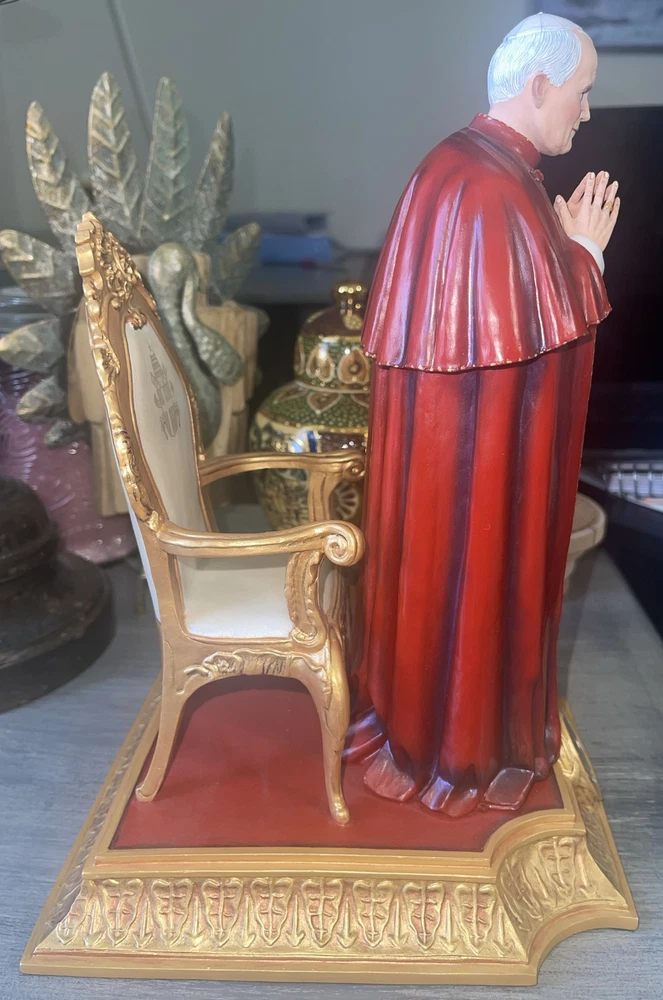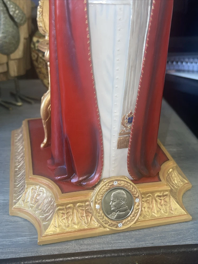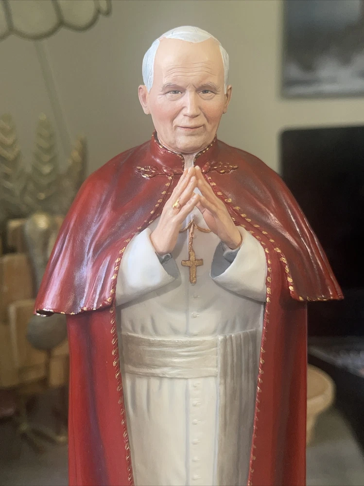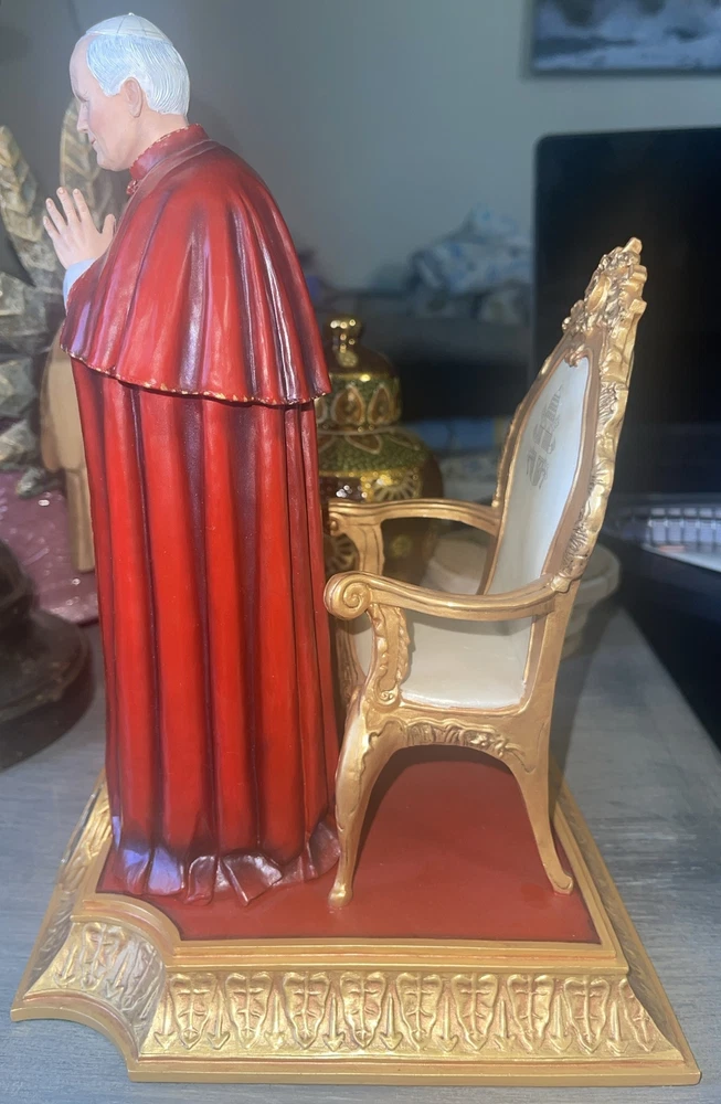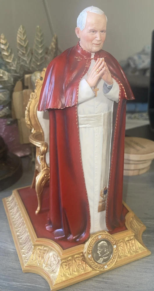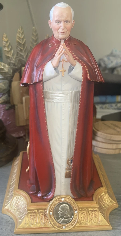 This stunning statue of Pope John Paul II is a must-have for any collector of fine religious art. Crafted by the renowned Danbury Mint, this exquisite piece depicts the beloved Pope in a moment of prayer and reflection. The intricate details of the statue are truly breathtaking, capturing the essence of Pope John Paul II's kind and compassionate spirit. Whether you're a devout Catholic or simply appreciate the beauty of religious art, this statue is sure to be a cherished addition to your collection. Don't miss your chance to own this masterpiece from the Danbury Mint.