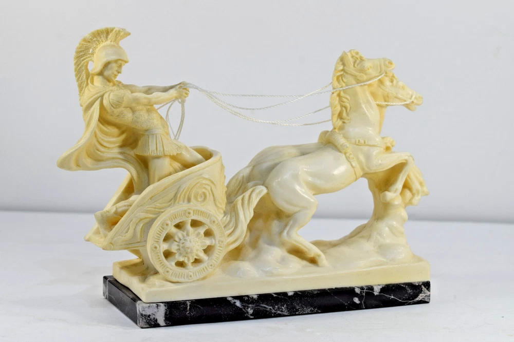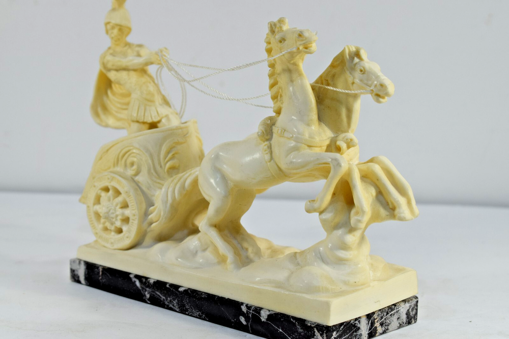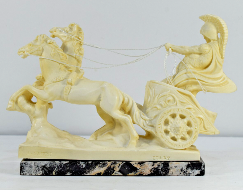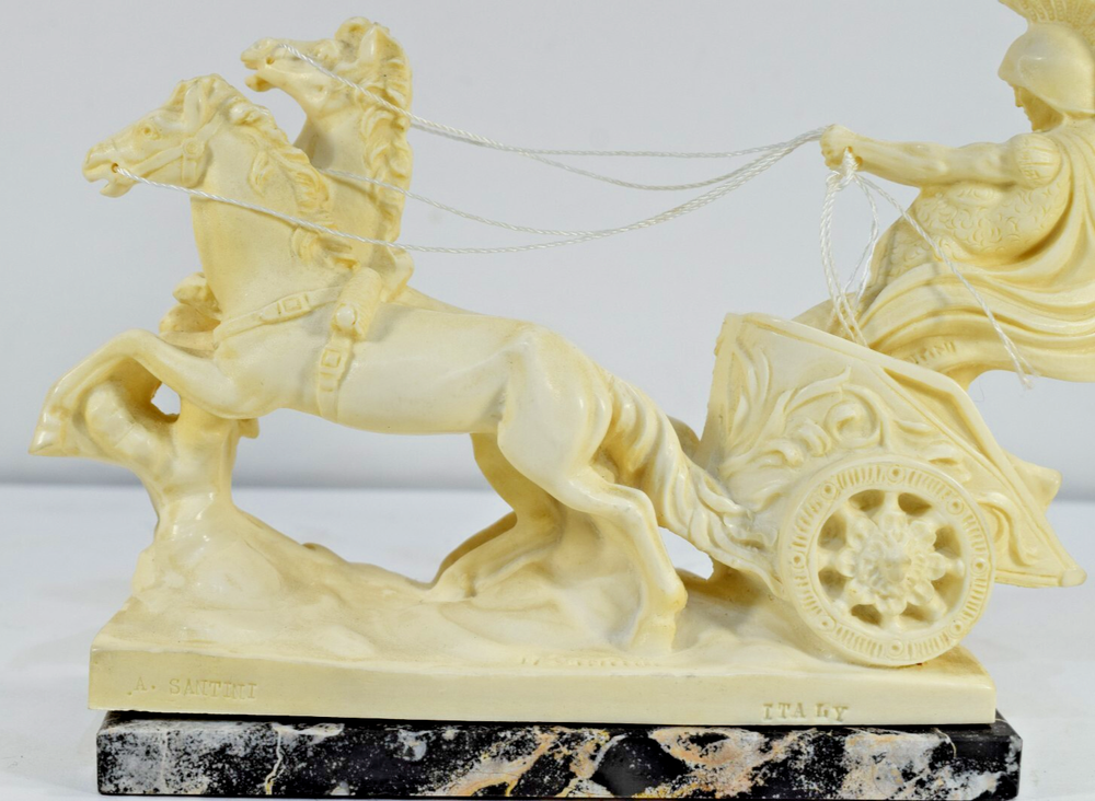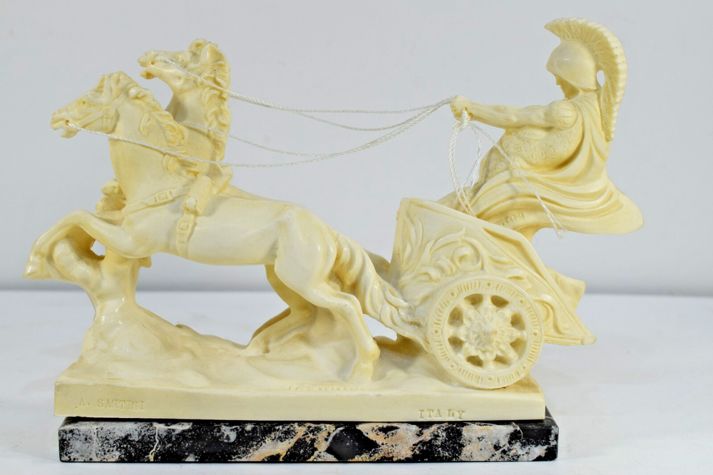 A Santini Classic Figure Roman Gladiator Horse Chariot Sculpture Alabaster Italy