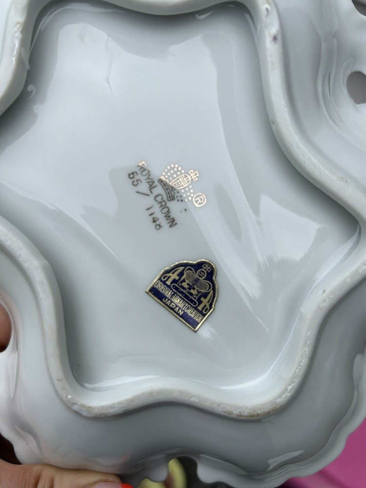 This is a stunning vintage Royal Crown candy dish with scalloped edges. The irredescent color and art deco style make it a great addition to any collection. The dish is made of glass and has a model number of 55/1148. It is a unique and original piece that is perfect for display or use. Whether you are a collector or just looking for a beautiful candy dish, this is the perfect item for you.