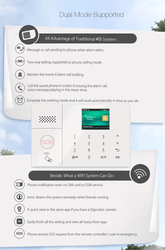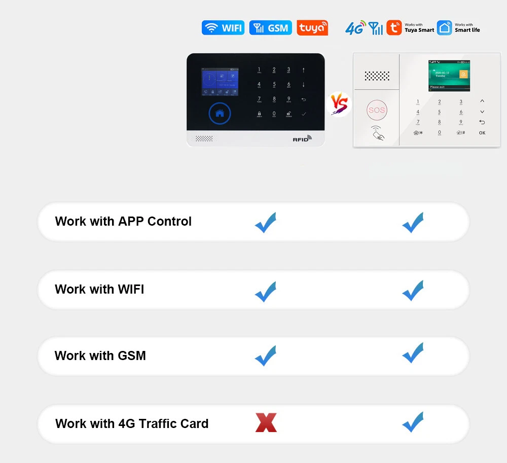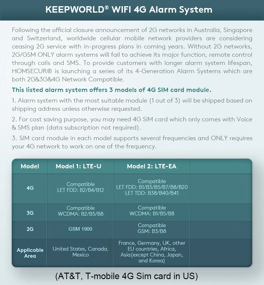 The advantage of 4G alarm system. Following the official closure announcement of 2G networks in United States, Canada, Mexico, Australia, Euro Union, etc. Worldwide cellular mobile network prvoides are considering ceasing 2G service with in-progress plans in coming years. Without 2G networks, 2G/GSM only alarm system will fail to achieve it's major function, remote control through calls and SMS. To provide customers with longer alarm system lifespan, our company is launching a series of it's 4G alarm system which are both 4G/3G/2G(GSM) Network compatible. Applicable Area US 4G alarm system work on United States, Canada, Mexico.(If use in USA, suggest use AT&T, T-mobile 4G Sim card). Euro 4G alarm system work on Euro Union, United Kingdom and other EU countries, Africa, Asia. 4G+WiFi Tuya Home Alarm System Description Payment Shipping Return Policy Feedback Contact Us Description The advantage of 4G alarm system. Because Australia, United States, Canada has cut the 2G sim card service. And United Kingdom, Mexico, Euro Union, ect will cut the 2G sim card in coming years. Without 2G networks, 2G/GSM only alarm system will fail to achieve it's major function, remote control through calls and SMS. To provide customers with longer alarm system lifespan, our company is launching a series of it's 4G alarm system which are both 4G/3G/2G(GSM) Network compatible. The 4G alarm system will work with United States, Australia, United Kingdom, Euro Union, Canada, Mexico, and most countries' 4G Sim card(Except China, Japan and Korea). The 4G alarm system support use 4G sim card to receive SMS message or phone call to remote control the alarm system(2G alarm system not support sim card function). This listed alarm system offers 2 models of 4G sim card module. 1. Alarm system with the most suitable module(1 out of 2) will be shipped based on shipping address unless otherwise requested. 2. For cost saving purpose, you may need 4G Sim Card which only comes with voice and SMS plan(data subscription not required). 3. Sim Card module in each model supports frequencies and ONLY requires you 4G network to work on one of the frequency. Applicable Area USA/Australia 4G alarm system work on United States, Australia, Canada, Mexico, South American, North American. Euro 4G alarm system work on Euro Union, United Kingdom and other Euro countries, Africa, Asia(except China, Japan and Korea). Package Including:(ALL sensor's battery included 4G+WiFi Main Panel(100 Wireless Zone+3 wired zone) * 1 Pcs (Support Connect Amazon Alexa, Google Assistant, IFTTT, etc) Wireless PIR Infrared Detector * 4 Pcs Wireless Door / Windows Sensor * 16 Pcs Wireless Remote Control Key * 4 Pcs RFID Tags * 4 Pcs Wired Siren * 1 Pcs(110dB) Built-in Siren * 1 Pcs(85dB, the siren is built-in main panel) AC Adapter * 1 Pcs English User Manuel * 1 Pcs (NOT Including Sim Card) Frequently Qustion & Answer: Q: What kind of Sim Card support? A: The alarm system is 4G version, it support 4G+3G+2G(GSM) Sim Card, the sim card detailed I have writed in the description. Q: Can this alarm system work with Amazon Alexa or Google Home? A: Compatible with Alexa and Google home: This alarm sysetm works with Amazon Alexa and Google Home for voice control ( Alexa and google home devices not included ). Just ask app Alexa on your phone to Arm / Disarm/ the whole system in a specific instruction like "Alexa, please arm the alarm system". Remote control your Alarm system anywhere in the world with your smart cell phone, no need repeated operation! Q: Can this alarm system work with WIFI and 4G Sim Card together? So if the WIFI failure, can switch Sim Card mode to work. A:Yes. User can connect alarm system with WIFI and 4G Sim Card to work. And when Alarm System be triggered, it will push alarm message to the APP via WIFI. And if the WIFI failure, will change Sim Card mode auto Dial Out. Q: It just with WIFI in my house and without 4G Sim Card,can I use this alarm system? A: Yes. Alarm System can work in WIFI mode only. The alarm system only support 2.4G WiFi, NOT support 5G WiFi. Q: Can I add additional remote controllers, door sensors, pir sensors, smoke detectors, gas detectors or other sensors to work with this alarm system? A: Yes. Alarm system can work up to 99 wireless sensors(wireless freq 433MHz) and wireless Siren, unlimited Wifi Camera. Q: Does the alarm panel with backup battery? A: Yes. Alarm system with internal rechargeable backup battery. It can support work when AC Adapt is cut. Q: What's the function of RFID Tags? A: It used to touch the main panel to arm or disarm soon and easily. Main Function And Feature: 1. 2.4 inch TFT display screen, concise user interface and menu hint design 2. Main interface status bar, date/clock indication, fairly obvious alarm host status. 3. Built-in powerful performance CPU master based on 32-bit Cortex-M3 core 4. Based on u cos C III operating system with multitasking design, great user operation experience 5. WiFi/4G/3G/2G(GSM)/GPRS intranet alarm system, support different alarm channels, like APP push/SMS/voice monitoring/intranet center etc. to ensure the alarm performance stable and reliable 6. Support SMS arm/disarm and voice arm/disarm 7. Support up to 99 learning/storage location for remote control, RFID cards and wireless detector 8. Support many defense zones, such as gate, SOS, bedroom, window, balcony, perimeter, smoke, gas, carbon monoxide, water leaking, etc. 9. Support the main power malfunction, backup power shortage, tamper alarm and other extended alarm. 10 .Support entry/exit zone, indoor zone, perimeter zone, 24-hour zone, etc 11. Up to 5 groups preset alarm phone numbers, SMS on/off and dial on/off can be set respectively 12. Support external wireless siren, Support timing arm and disarm 13. Can store and inquire daily operation records and alarm records. 14. GSM network clock synchronization, to ensure accurate color, and support country time zone setting. 15. Support multi-language menu display, vo