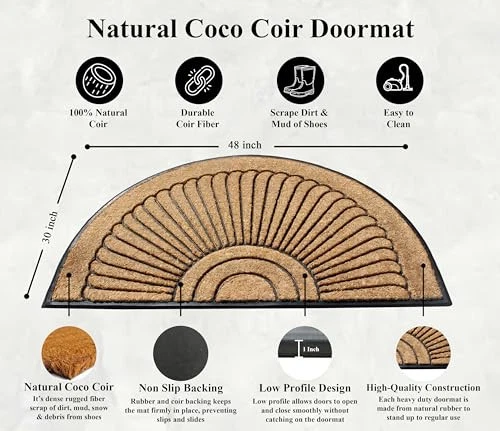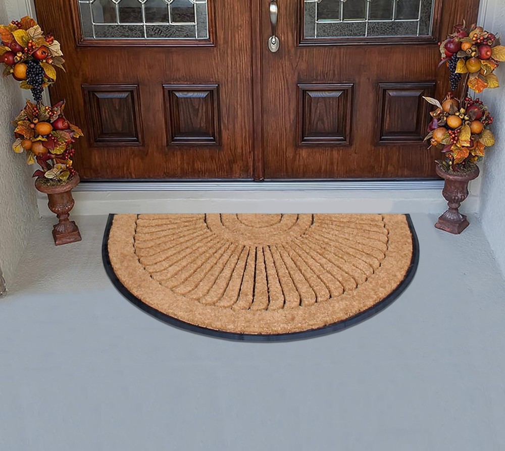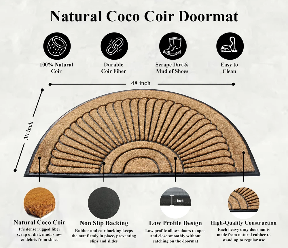More than a decorative enhancement this rubber & coir molded doormat is made With a heavy rubber backing that anchors it in place while you brush dirt & debris from shoes & boots. The tufted coco-fiber facilitates scrubbing soles clean. Keeps your floor clean when you decorate your entryway with this beautiful doormat, which includes a sturdy rubber backing to help in keep the mat in place & prevent slips. The attractive design of this Coir Door Mat creates a welcoming entrance for your guests & the durable coir material holds up to lots of foot traffic. This Welcome Mat Recommended for outdoor use in covered areas. Vacuum or shake the mat regularly for longer life. NEWLY DEVELOPED RUBBER & COIR DOOR MAT: This is a completely newly designed door mat with a large wipe area. The large size door mat is made of Natural coir fiber & high quality rubber.This mat has a large coir area to clean & wipe your shoes which keeps your house clean. Each outdoor rug is QC inspected for 20 quality check points. HEAVY-WEIGHT RUBBER BORDER DOOR MAT: The heavy rubber backing makes sure the doormat in anchored to its place and does not get blown away by wind or tear apart by aggressive wiping. SUPER TOUGH DOOR MAT: Constructed with thick coir bristles on the topside with rubber base, the doormat is built tough by nature; its strong bristles create a wiping area and the rubber base adds to the sturdiness. This premium outdoor rug will help stop dirt, debris, moisture and other particles from being tracked into your home and will last at least 3 times longer than regular door mats. PLACE WELCOME MAT BEFORE EVERY EXTERIOR DOOR: Use this welcome mat on a patio, in a garage, laundry room, entryway, and anywhere there is high traffic from outside. Recommended to be used in covered outdoor areas. PERFECT SIZE DOORMAT FOR YOUR LARGE ENTRYWAY: Front doormat measures 24" x 36" and is 1" thick to allow your door to easily pass over the mat without getting stuck. This outdoor mat is ideal for both single and double door entrances and comes in Artist inspired prints which are anti fade will last even if used in high traffic areas.