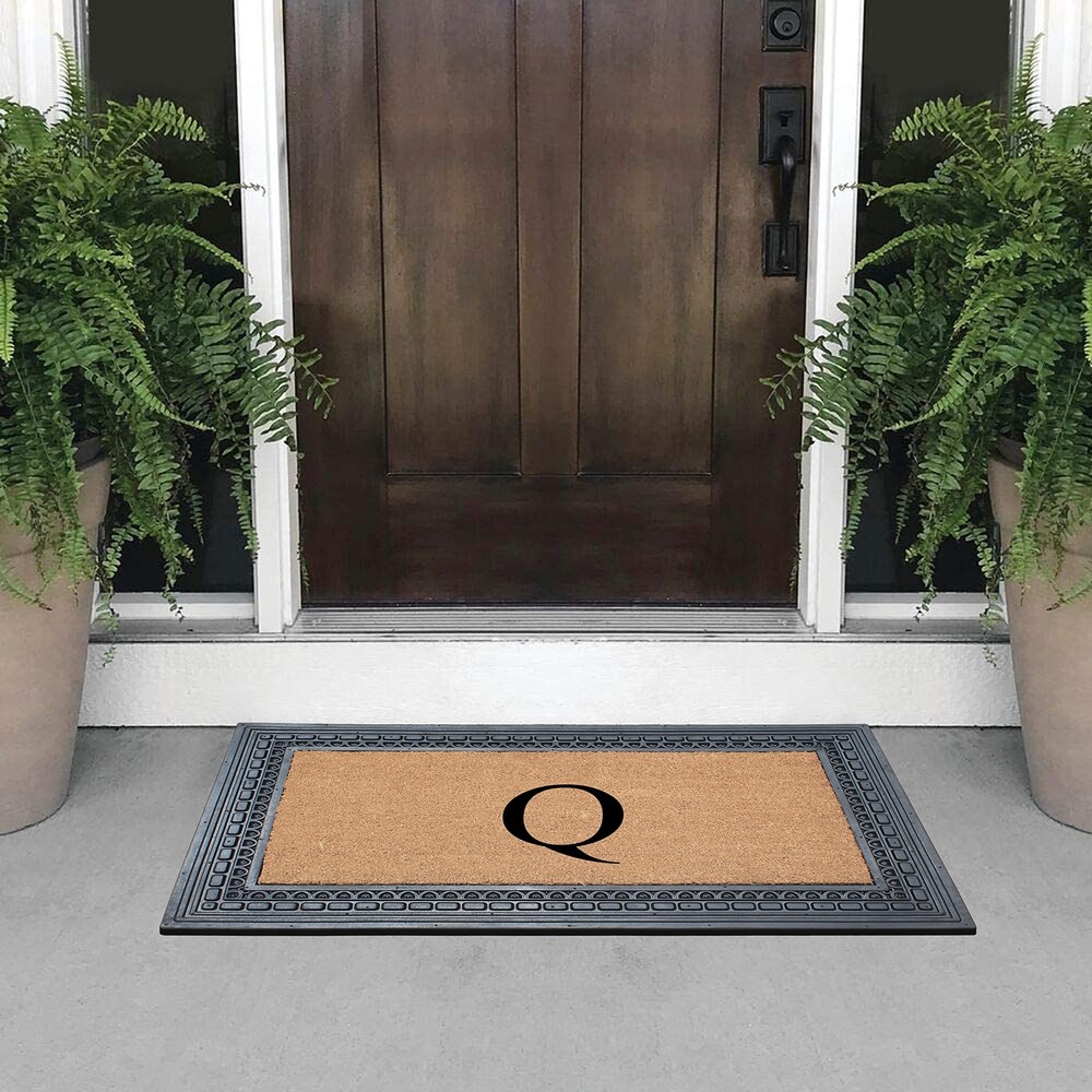 Like all of our door mats, our Monogrammed Coco Door Mat is as durable as it is beautiful. Handmade from 100% coir, an all-natural material known for its scrubbing power and resistance to the elements. Dyes saturate the fibers for vibrant color. Specify you single-letter monogram for the perfect finishing touch, or enjoy the classic border motif alone NEWLY DEVELOPED RUBBER AND COIR MONOGRAMMED DOOR MAT : This is a completely newly designed door mat, suitable for both single and double doors. The large size monogrammed door mat is made of Natural Coir fiber and high quality rubber. This coir door mat has a large coir area to clean and wipe your shoes which keeps your house clean. Molded door mats are stronger and more durable lasting thrice as long as regular door mats. Each outdoor rug is QC inspected for 20 quality check points. NATURAL COIR PILE MONOGRAMMED FRONT DOOR MAT: This Door mat is made from 100% natural coir fibers which are of the strongest fibers and they naturally trap dust and other particles. The biodegradable coir fiber material is environmentally friendly and compostable. HEAVY DOOR MAT WITH RUBBER BACKING: This Doormat is heavy weight with a solid rubber backing. This door mat doesn’t get easily blown away by wind and anchors to the ground to prevent slipping. ATTRACTIVE DESIGN AND ANTI SHED TREATED FRONT DOOR MAT: This is a personalized designed door mat and every door mat is Hand monogrammed individually in the USA. The coir portion of this door mat is treated with Anti Shed dyes to minimize shedding. The rubber molded doormat easily lasts 3 times longer than usual doormats since the rubber adds to the durability making it suitable for high traffic areas. LOW MAINTENANCE OUTDOOR MAT: Coconut coir is naturally resistant to unwanted substance, making this the most low-maintenance door mat possible.
