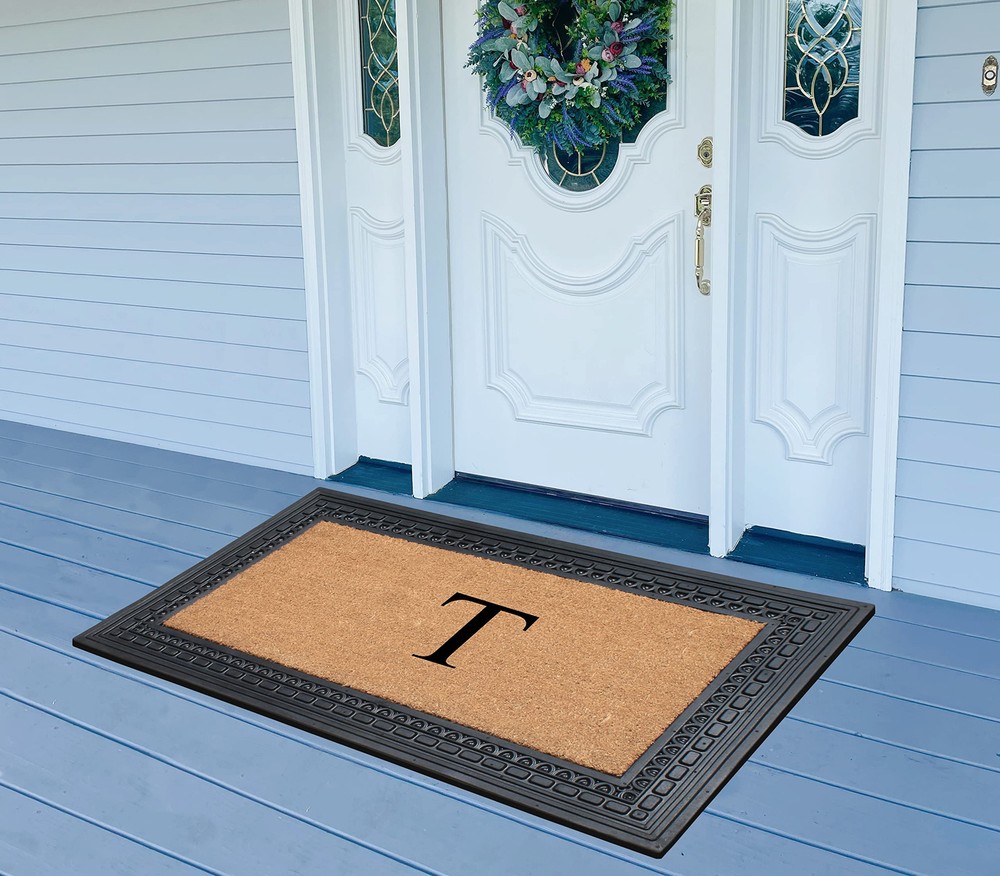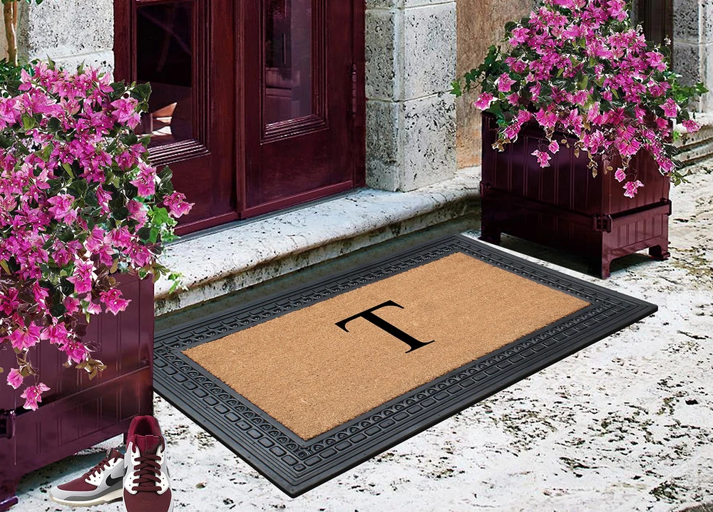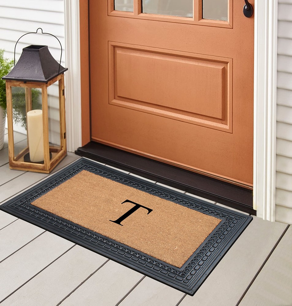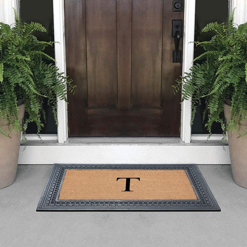 Like all of our door mats, our Monogrammed Coco Door Mat is as durable as it is beautiful. Handmade from 100% coir, an all-natural material known for its scrubbing power and resistance to the elements. Dyes saturate the fibers for vibrant color. Specify you single-letter monogram for the perfect finishing touch, or enjoy the classic border motif alone NEWLY DEVELOPED RUBBER AND COIR MONOGRAMMED DOOR MAT : This is a completely newly designed door mat, suitable for both single and double doors. The large size monogrammed door mat is made of Natural Coir fiber and high quality rubber. This coir door mat has a large coir area to clean and wipe your shoes which keeps your house clean. Molded door mats are stronger and more durable lasting thrice as long as regular door mats. Each outdoor rug is QC inspected for 20 quality check points. NATURAL COIR PILE MONOGRAMMED FRONT DOOR MAT: This Door mat is made from 100% natural coir fibers which are of the strongest fibers and they naturally trap dust and other particles. The biodegradable coir fiber material is environmentally friendly and compostable. HEAVY DOOR MAT WITH RUBBER BACKING: This Doormat is heavy weight with a solid rubber backing. This door mat doesn’t get easily blown away by wind and anchors to the ground to prevent slipping. ATTRACTIVE DESIGN AND ANTI SHED TREATED FRONT DOOR MAT: This is a personalized designed door mat and every door mat is Hand monogrammed individually in the USA. The coir portion of this door mat is treated with Anti Shed dyes to minimize shedding. The rubber molded doormat easily lasts 3 times longer than usual doormats since the rubber adds to the durability making it suitable for high traffic areas. LOW MAINTENANCE OUTDOOR MAT: Coconut coir is naturally resistant to unwanted substance, making this the most low-maintenance door mat possible.