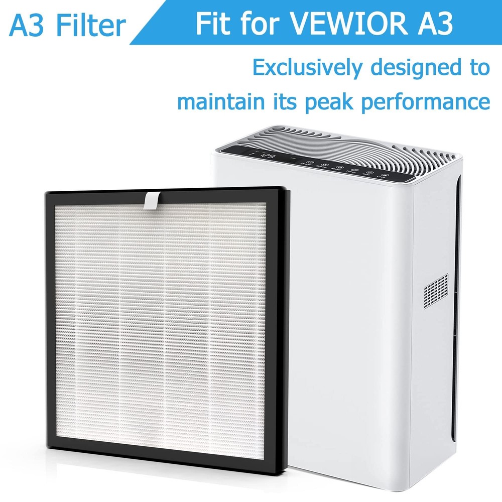 A3 H13 HEPA Replacement Filter, Compatible with VEWIOR A3 Air Purifier, 2 Pack - Buy Now with Fast Shipping! A3 H13 HEPA Replacement Filter, Compatible with VEWIOR A3 Air Purifier, 2 Pack Product Details Brand: Vegebe Material: Polypropylene Product Dimensions: 10.6"L x 10.5"W x 1.1"Th MERV Rating: 13 Compatible Devices: Vegebe Filter, Fit for VEWIOR A3 Air Purifier Item Weight: 0.8 Kilograms Number of Items: 2 Manufacturer: Vegebe Unit Count: 2.0 Count Brand Name: Vegebe Model Info: A3 Filter - 2 Pack Item Weight: 1.76 pounds Product Dimensions: 10.6 x 10.5 x 1.1 inches Item model number: A3 Filter - 2 Pack Part Number: Verwior A3 Filter - 2 Pack Compatible Device: Vegebe Filter, Fit for VEWIOR A3 Air Purifier Material Type: Polypropylene Included Components: A3 H13 HEPA Filter - 2 Pack Batteries Included?: No Batteries Required?: No Date First Available: January 15, 2023 Key Features ✅ Compatible: Vegebe A3 Replacement Filter, Compatible with VEWIOR A3 Air Purifier. Exclusively designed to maintain its peak performance. 2 Pack. ✅ 3-in-1 H13 True HEPA Filter: A3 Filter features a 3-stage filtration design: Pre-Filter Captures Hair, Pet Dander and Fiber; H13 TRUE HEPA Filter Captures Smoke, Dust; Activated Carbon Filter Quickly captures and neutralizes Bad Smells, Pet Odor and VOC to freshen the air quality. ✅ Filtration Performance: A3 Filter Replacement uses H13 True HEPA PP electrostatic electret melt-blown filter. Filters out 99.97% of particles as small as 0.3 microns and air pollution PM 2.5 (particulate matter). ✅ Filter Life: For best performance, recommended filter replacements once every 3-6 months, will depend on the environmental air quality around you. ✅ Reliable: Our responsive customer service team is fully committed to ensuring you have the best experience possible! If you have any questions or concerns, please contact us and we will answer ASAP! Product Description A3 Replacement Filter - 3-in-1 H13 True HEPA - 2 Pack Vegebe A3 Filter Exclusively designed fit for A3 Air Purifiers to maintain its peak performance. Storage: It should be stored in a dry location protected against moisture. Important: A3 Filter is sealed to preserve shelf life. Please remove the plastic packaging of the new filters before placing them into air purifier. Reliable: Our responsive customer service team is fully committed to ensuring you have the best experience possible! If you have any questions or concerns, please contact us and we will answer ASAP! Package Contents: 2 x A3 3-in-1 H13 True HEPA Filter element