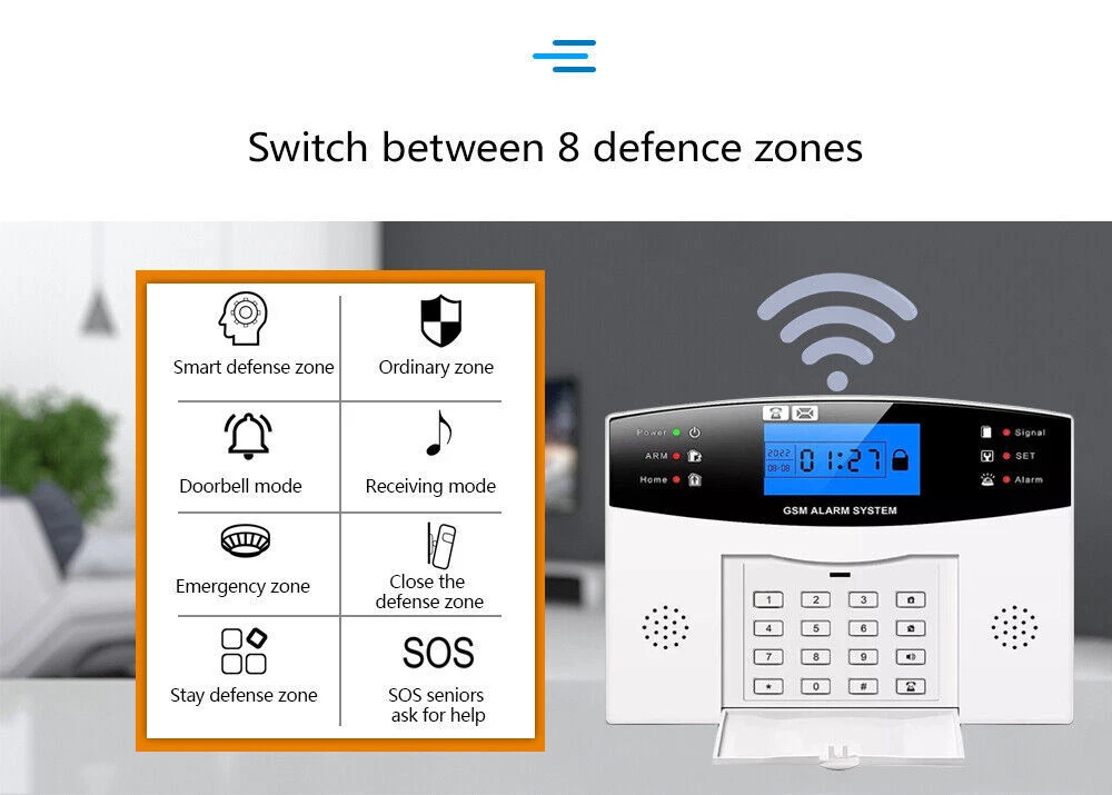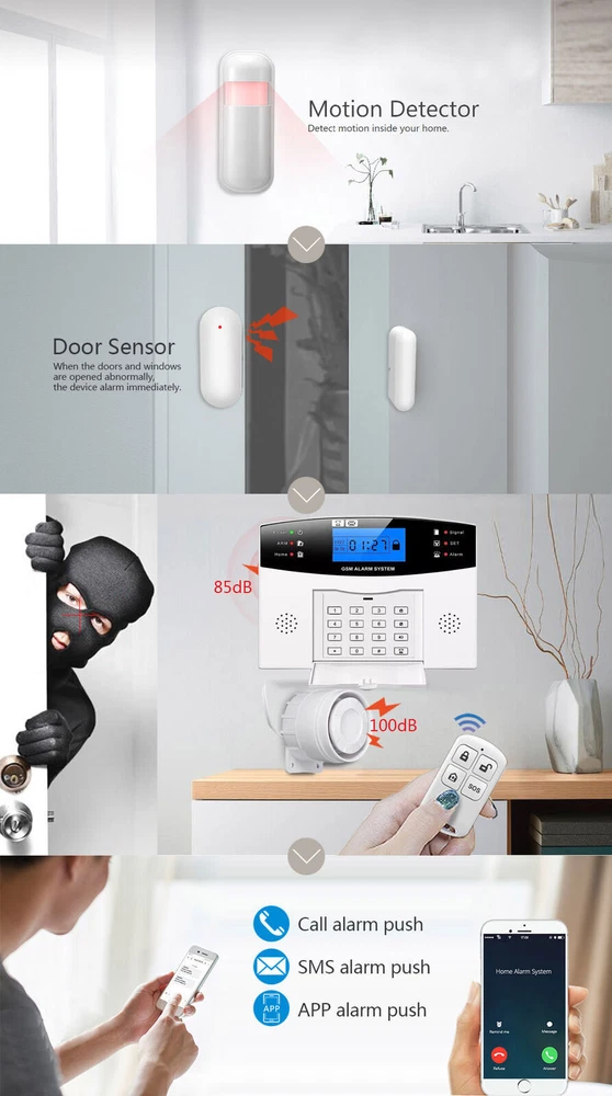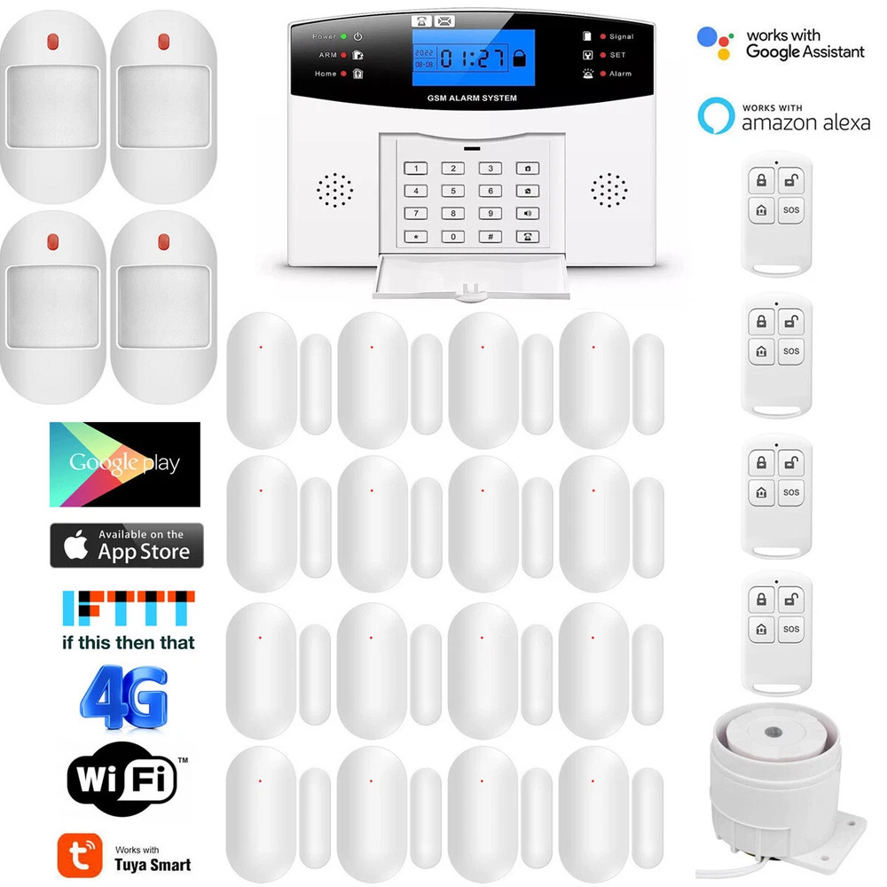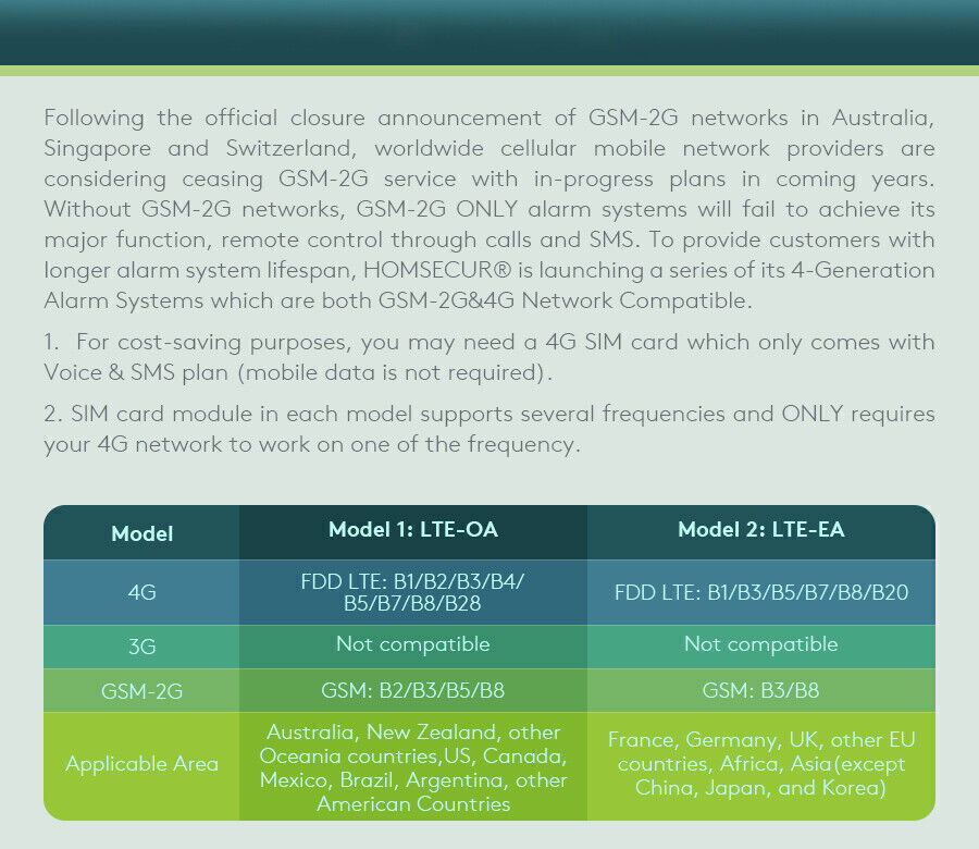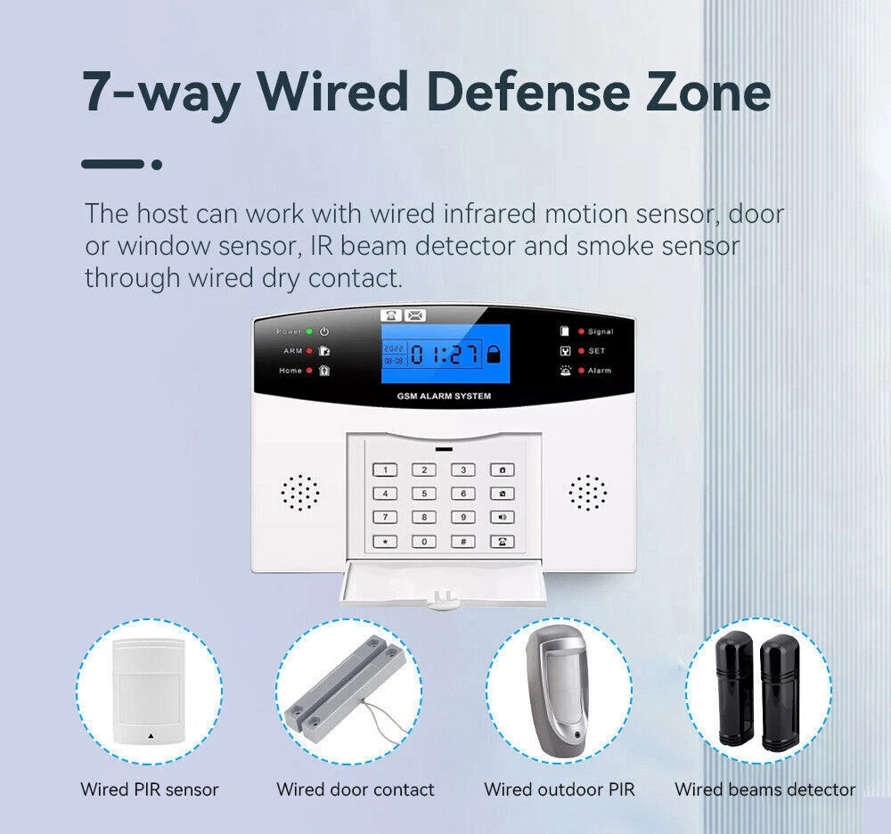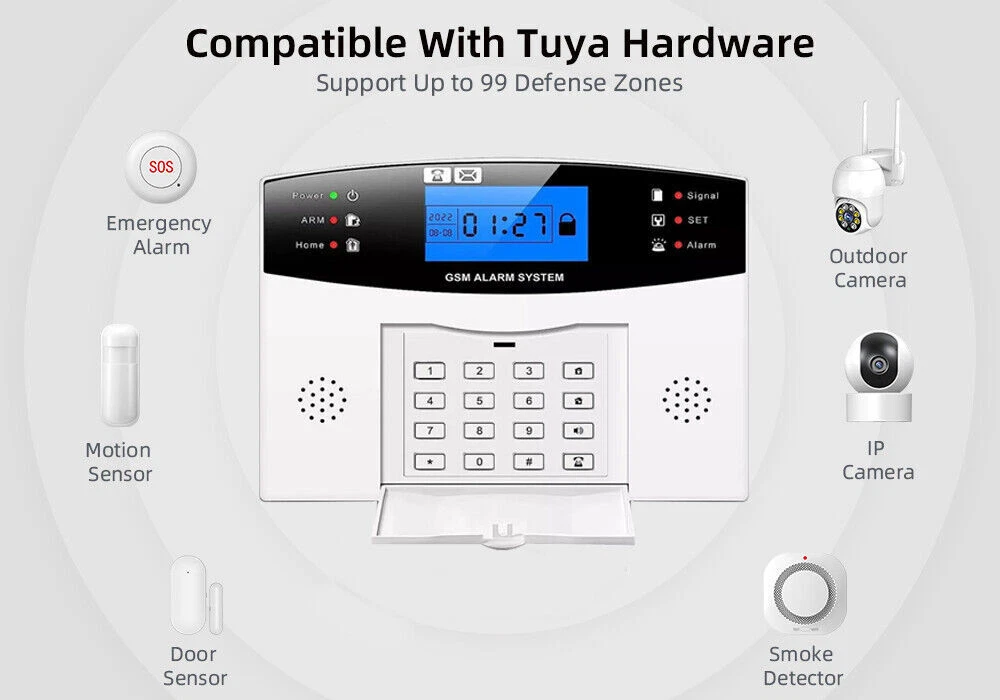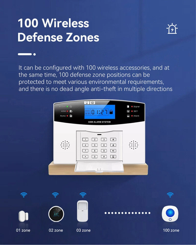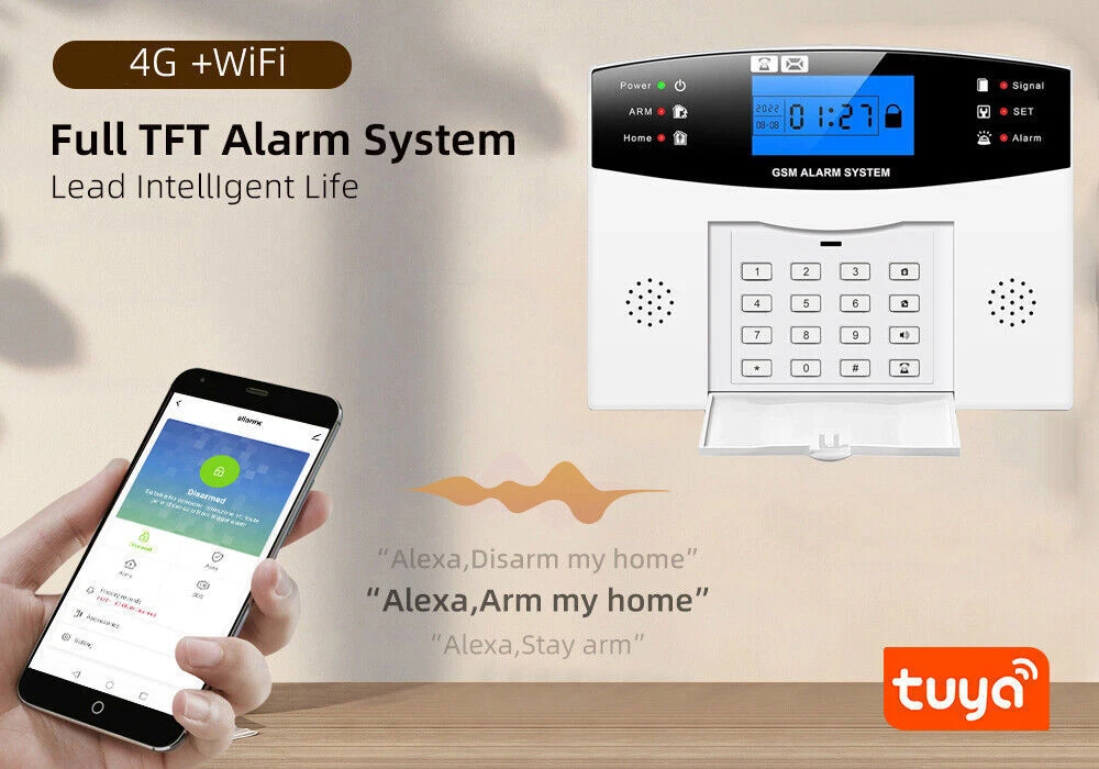 The advantage of 4G alarm system. Following the official closure announcement of 2G networks in United States, Canada, Mexico, Australia, Euro Union, etc. Worldwide cellular mobile network prvoides are considering ceasing 2G service with in-progress plans in coming years. Without 2G networks, 2G/GSM only alarm system will fail to achieve it's major function, remote control through calls and SMS. To provide customers with longer alarm system lifespan, our company is launching a series of it's 4G alarm system which are both 4G/3G/2G(GSM) Network compatible. Applicable Area US 4G alarm system work on United States, Canada, Mexico.(If use in USA, suggest use AT&T, T-mobile 4G Sim card). Euro 4G alarm system work on Euro Union, United Kingdom and other EU countries, Africa, Asia. 4G+WiFi Tuya Home Alarm System Description Payment Shipping Return Policy Feedback Contact Us Description The advantage of 4G alarm system. Because Australia, United States, Canada has cut the 2G sim card service. And United Kingdom, Mexico, Euro Union, ect will cut the 2G sim card in coming years. Without 2G networks, 2G/GSM only alarm system will fail to achieve it's major function, remote control through calls and SMS. To provide customers with longer alarm system lifespan, our company is launching a series of it's 4G alarm system which are both 4G/3G/2G(GSM) Network compatible. The 4G alarm system will work with United States, Australia, United Kingdom, Euro Union, Canada, Mexico, and most countries' 4G Sim card(Except China, Japan and Korea). The 4G alarm system support use 4G sim card to receive SMS message or phone call to remote control the alarm system(2G alarm system not support sim card function). This listed alarm system offers 2 models of 4G sim card module. 1. Alarm system with the most suitable module(1 out of 2) will be shipped based on shipping address unless otherwise requested. 2. For cost saving purpose, you may need 4G Sim Card which only comes with voice and SMS plan(data subscription not required). 3. Sim Card module in each model supports frequencies and ONLY requires you 4G network to work on one of the frequency. Applicable Area USA/Australia 4G alarm system work on United States, Australia, Canada, Mexico, South American, North American. Euro 4G alarm system work on Euro Union, United Kingdom and other Euro countries, Africa, Asia(except China, Japan and Korea). Package Including:(ALL sensor's battery included 4G+WiFi Main Panel(100 Wireless Zone+7 wired zone) * 1 Pcs (Support Connect Amazon Alexa, Google Assistant, IFTTT, etc) Wireless PIR Infrared Detector * Select on ebay option Wireless Door / Windows Sensor * Select on ebay option Wireless Remote Control Key * Select on ebay option Wired Siren * 1 Pcs(110dB) Built-in Siren * 1 Pcs(85dB, the siren is built-in main panel) USB Adapter * 1 Pcs English User Manuel * 1 Pcs (NOT Including Sim Card) Frequently Qustion & Answer: Q: What kind of Sim Card support? A: The alarm system is 4G version, it support 4G+3G+2G(GSM) Sim Card, the sim card detailed I have writed in the description. Q: Can this alarm system work with Amazon Alexa or Google Home? A: Compatible with Alexa and Google home: This alarm sysetm works with Amazon Alexa and Google Home for voice control ( Alexa and google home devices not included ). Just ask app Alexa on your phone to Arm / Disarm/ the whole system in a specific instruction like "Alexa, please arm the alarm system". Remote control your Alarm system anywhere in the world with your smart cell phone, no need repeated operation! Q: Can this alarm system work with WIFI and 4G Sim Card together? So if the WIFI failure, can switch Sim Card mode to work. A:Yes. User can connect alarm system with WIFI and 4G Sim Card to work. And when Alarm System be triggered, it will push alarm message to the APP via WIFI. And if the WIFI failure, will change Sim Card mode auto Dial Out. Q: It just with WIFI in my house and without 4G Sim Card,can I use this alarm system? A: Yes. Alarm System can work in WIFI mode only. The alarm system only support 2.4G WiFi, NOT support 5G WiFi. Q: Can I add additional remote controllers, door sensors, pir sensors, smoke detectors, gas detectors or other sensors to work with this alarm system? A: Yes. Alarm system can work up to 99 wireless sensors(wireless freq 433MHz) and wireless Siren, unlimited Wifi Camera. Q: Does the alarm panel with backup battery? A: Yes. Alarm system with internal rechargeable backup battery. It can support work when AC Adapt is cut. Main Function And Feature: 1. 2.4 inch TFT display screen, concise user interface and menu hint design 2. Main interface status bar, date/clock indication, fairly obvious alarm host status. 3. Built-in powerful performance CPU master based on 32-bit Cortex-M3 core 4. Based on u cos C III operating system with multitasking design, great user operation experience 5. WiFi/4G/3G/2G(GSM)/GPRS intranet alarm system, support different alarm channels, like APP push/SMS/voice monitoring/intranet center etc. to ensure the alarm performance stable and reliable 6. Support SMS arm/disarm and voice arm/disarm 7. Support up to 99 learning/storage location for remote control and wireless detector 8. Support many defense zones, such as gate, SOS, bedroom, window, balcony, perimeter, smoke, gas, carbon monoxide, water leaking, etc. 9. Support the main power malfunction, backup power shortage, tamper alarm and other extended alarm. 10 .Support entry/exit zone, indoor zone, perimeter zone, 24-hour zone, etc 11. Up to 5 groups preset alarm phone numbers, SMS on/off and dial on/off can be set respectively 12. Support external wireless siren, Support timing arm and disarm 13. Can store and inquire daily operation records and alarm records. 14. GSM network clock synchronization, to ensure accurate color, and support country time zone setting. 15. Support multi-language menu display, voice prompts and alarm SMS setting. 16. Can record 20 seconds voice message and alarm voi