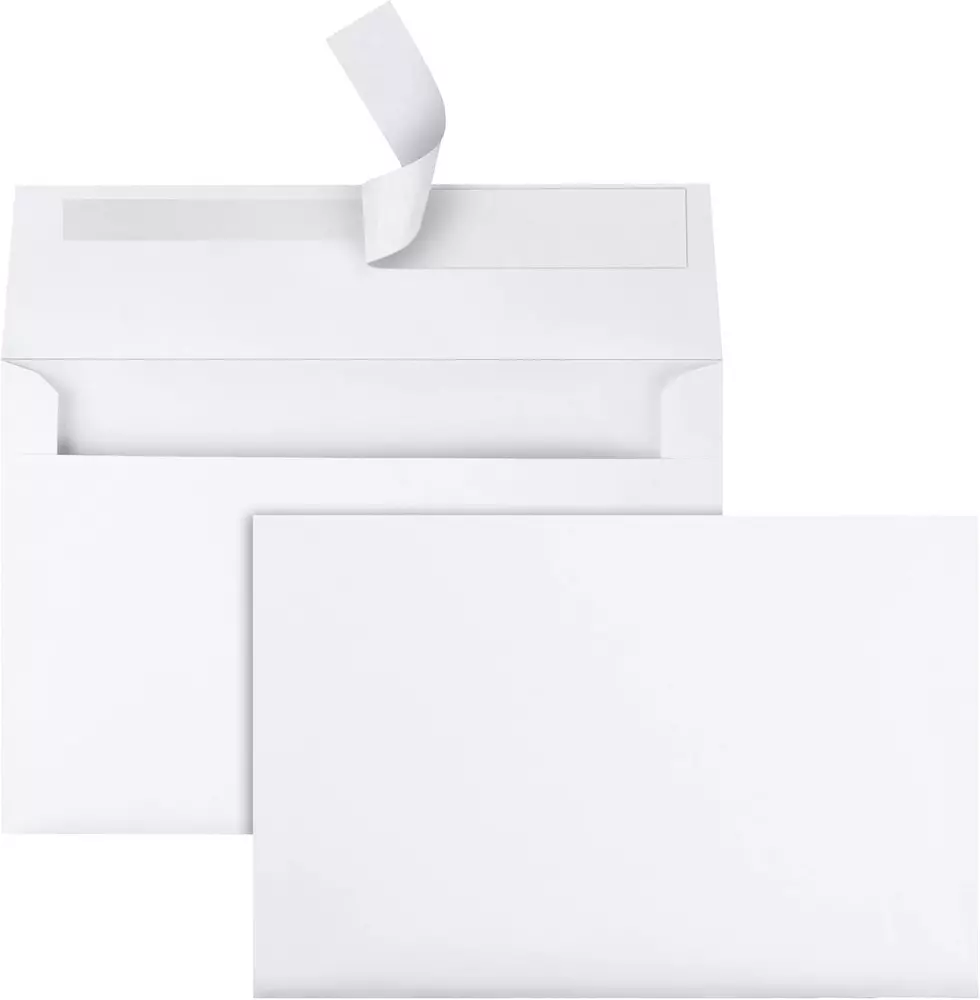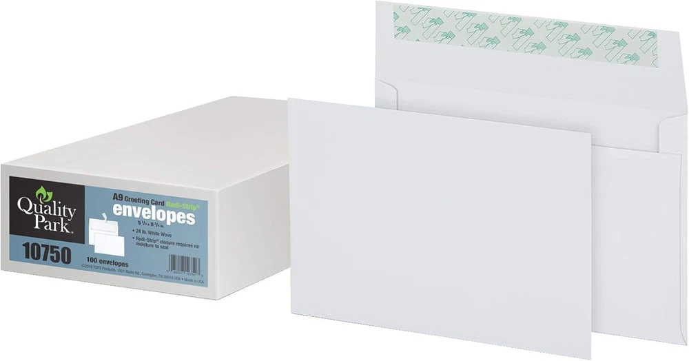 A9 sized 5-3/4 x 8-3/4 Blank Greeting Card Envelopes; Invitation envelopes fit half-fold cards, invites or photos Redi-Strip closure that does not require moisture; just peel and press for a safe, dry, sanitary seal Use for invitations and replies; A9 envelopes can stand on their own or tuck neatly inside larger envelopes for reply cards Printer friendly envelopes; feed directly into your laser or inkjet printer for fast printing Quick and economical solution for event invitations; 100 count box in white Half-Fold 5 3/4 x 8 3/4 Greeting Card/Invitation Envelope Color: White Redi-Strip closure requires no moisture to seal Greeting/invitation cards are ideal for use with computer-generated cards and invitations. Redi-Strip closure on included matching envelopes requires no moisture to seal. Peel-away strip keeps adhesive free from dust.