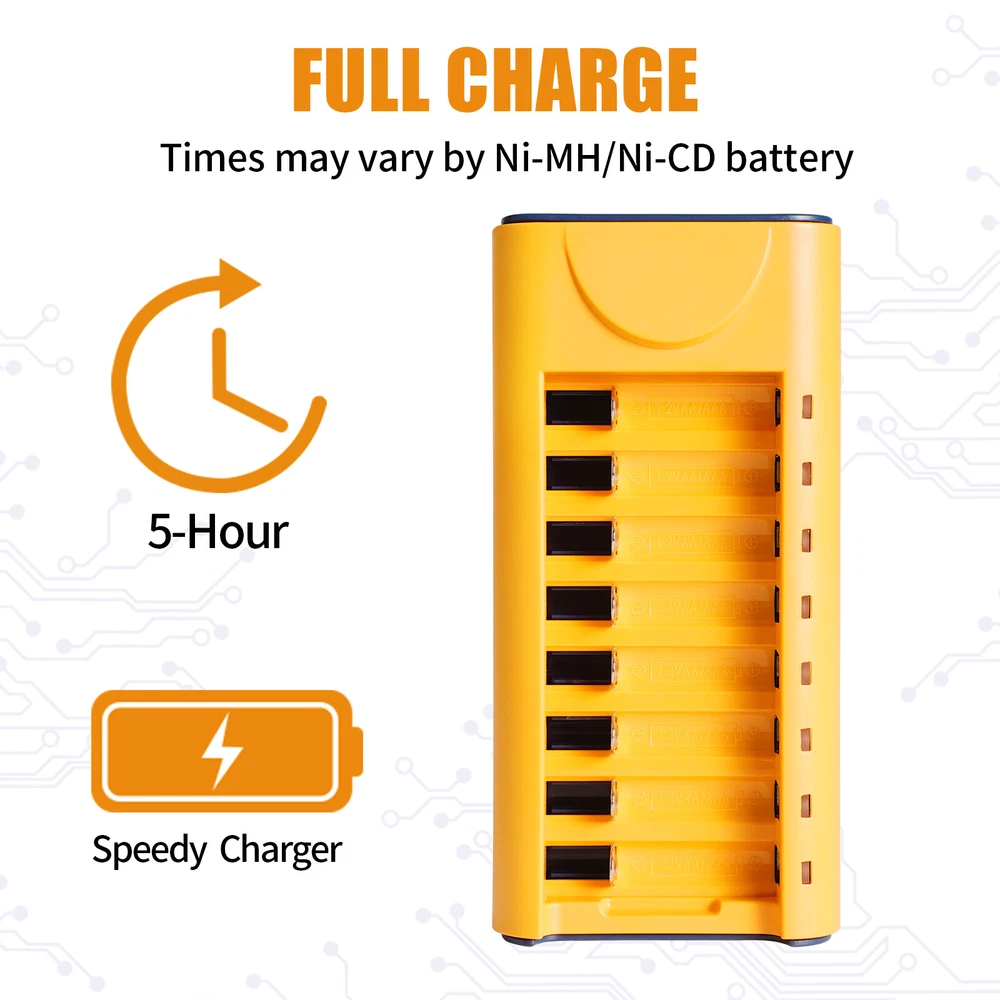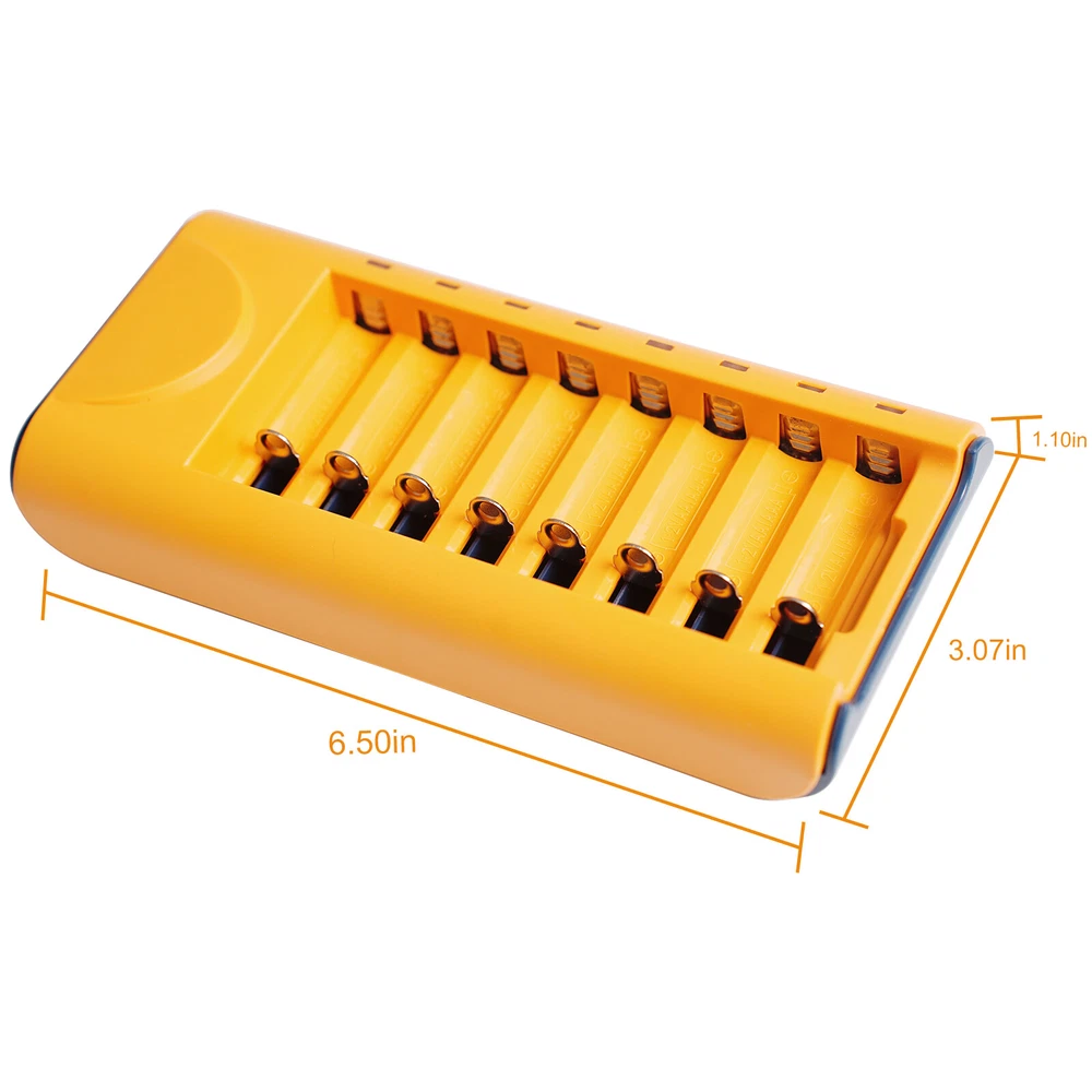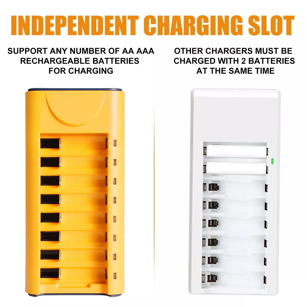 AA AAA Rechargeable Battery Charger 8-Slot For AA AAA Rechargeable Batteries US Features: 1. 【Smart Rechargeable AA Battery Charger】 AA AAA battery charger 8 bay for Ni-MH Ni-CD rechargeable batteries can charge any quantity in any slot. Single, double or triple ones can be charged, and not necessary to put them in neighboring slots. Besides, you can also mix charge AA and AAA batteries, as long as they are Ni-MH or Ni-CD batteries. 2.【Safety Protection】 Comes with special charge and discharge management circuit. With multiple security protection settings, battery charger aa can effectively prevent reverse, short circuit, overcharge, over discharge, over-current damage to the battery, which makes users using the product without any safety concern. 3.【LED Indicators Charging Display】 This aa aaa battery charger with Red/Green led light display, And the aa rechargeable battery charger will display the status of each rechargeable battery when you insert a battery to charge, the light will turn solid red, only on the port(s) containing the battery, to indicate the battery is charging. The light turns solid green when charging is complete. 4.【USB AA Battery Charger】 USB Powered Universal Intelligent Battery Charger, allows for on the go worldwide portability.the USB charging line can be connected to USB socket, car charger, computer, phone adapter, other USB output equipment to charge. 5. Note: Products with electrical plugs are designed for use in the US. Outlets and voltage differ internationally and this product may require an adapter or converter for use in your destination. Please check compatibility before purchasing. Specification: 1. LED state the charging statues: Power connection, no battery, Green light is always on. Charging - Red light Full charged- Green light 2. Compatible: Can both charge AA and AAA Ni-MH Ni-Cd rechargeable batteries (Do not charge alkaline or Lithium batteries) 3. Input and Output: Input: DC 5V 1A, Worldwide voltage Output: DC 1.2V 200mA, faster for charging 4. Individual fast-charging,LED indicator light, Easy to use AA/AAA/ Ni-MH Ni-CD rechargeable batteries,Perfect Fit 6. Can charge any number of batteries at the same time, independent charging channels 7. Safety Charging, Offer over-voltage over-current protection, short-circuit protection, over-charge protection, over-heat protection, Good Protection Package Included 1 x AA Battery Charger 8 Slot 1 x USB Cable On Jan 26, 2025 at 23:39:29 PST, seller added the following information: