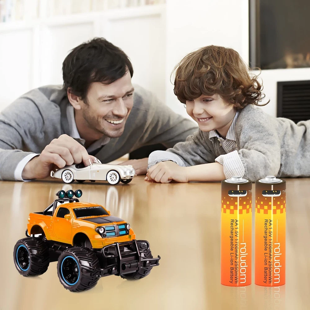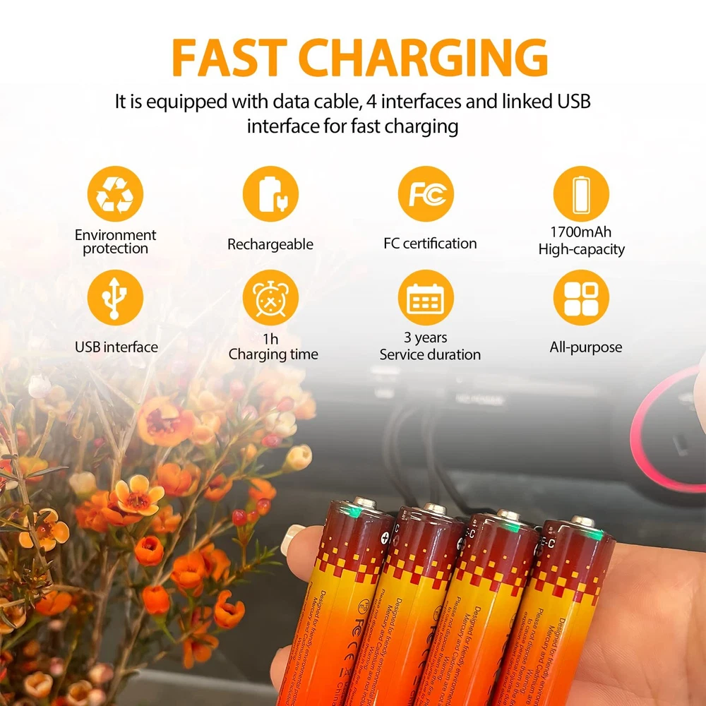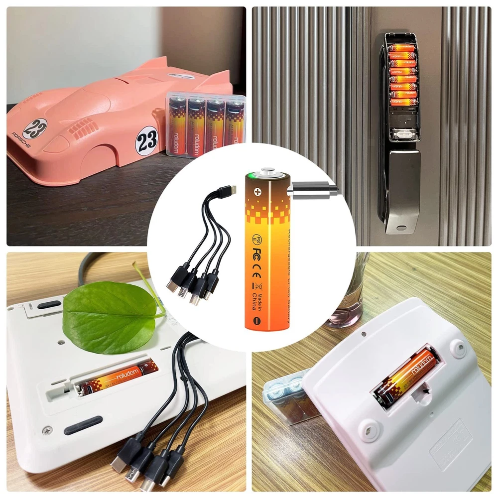 Why Should Choose Lithium Ion Rechargeable Batteries? 1.The Advantages of Lithium-ion Batteries Are Large Capacity And Constant Operating Voltage. 2600 mWh AA batteries 1.5V USB-C rechargeable aa batteries.This Type C Port Charging Rechargeable Battery Only Plug a USB-C Cable Into A Port On The Side Of The Battery To Charge. 2.Widely Used: AA lithium batteries are widely used in household devices like toys, remote controls, flashlights, alarm-clock, wireless mouse, toothpaste, and other devices that need batteries aa size. 3.High Safety, Safe Fast Charging And Discharging. Lithium-Ion Batteries Have The Characteristics Of Resistance To Short Circuit, Resistance To Overcharge, Over-discharge, Shock Resistance, Vibration Resistance, Acupuncture, No Fire, No Explosion, Etc 4.The Lithium-ion Battery Has Excellent High And Low-temperature Discharge Performance, Can Work At -20ˉ+60℃, And Its High-temperature Discharge Performance. 5.Long Cycle Life. Lithium-ion Batteries Use Carbon Anodes. During The Charging And Discharging Process, The Carbon Anodes Will Not Generate Dendrite Lithium, Which Can Prevent The Battery From Being Damaged Due To The Short Circuit of Internal Dendrite Lithium. After 1200 Times of Continuous Charging And Discharging, The Battery Capacity Will Still Not Be Lower Than 70% of The Rated Value, And It is Economical For Long-term Use. 6.No Pollution. The Battery Does Not Contain Harmful Substances Such As Cadmium, Lead And Mercury, And Is A Clean "Green" Energy Source. 7.Small Size, Light Weight, High Specific Energy. No Memory Effect. It Can Be Used Repeatedly At Any Time, Especially In Wartime And Emergency Situations, Showing Its Excellent Performance. 8.These New Stylish Type C Port Charging Lithium-Ion Batteries Are Also Better Than The Older Style Rechargeable Battery Which Required a Normal Multi-function Lithium Battery Charger. Package include: 4 x AA Rechargeable Lithium Ion Batteries ♥[Rechargeable and Money-Saving]: 2600 mWh AA batteries 1.5V USB-C rechargeable aa batteries, The 4 Packs High-capacity Lithium-Ion AA Batteries Can Provide Almost The Same And Stable Voltage Until The Entire Battery Is Exhausted. Compatible with various 1.2-1.5V devices. Our goal is to help you save money and get a green life. ♥[Rechargeable and Money-Saving]: 2600 mWh AA batteries 1.5V USB-C rechargeable aa batteries, The 4 Packs High-capacity Lithium-Ion AA Batteries Can Provide Almost The Same And Stable Voltage Until The Entire Battery Is Exhausted. Compatible with various 1.2-1.5V devices. Our goal is to help you save money and get a green life. ♥[1 Hour USB-C Fully Fast Charged]: USB-C Port Fast Charged can save your time, The aa lithium battery can be easily charged; no additional charger or adapter is required. The LED indicator clearly shows the charging progress, and the lithium batteries aa can be easily charged through the power bank of the adapter, laptop USB port, and USB cable. ♥[ENERGY SAVING & ECO FRIENDLY USB BATTERY]: The lithium ion battery can be charged up to 1200 cycles, which is more environmentally friendly. After three years of non-use, aa lithium battery can maintain 80% of the initial capacity; each battery can store 85% of the initial capacity after being produced in the factory. ♥[Multiple safety protection]: Designed by high-quality intelligent lithium battery chip, through innovative technology to transfer the working voltage from 3.7V battery chip to 1.5V, aa lithium battery maintain a constant working voltage of 1.5V, battery charger aa can improve the charging efficiency, outstanding charging Long maintenance life, automatic safety function, overcharge protection.