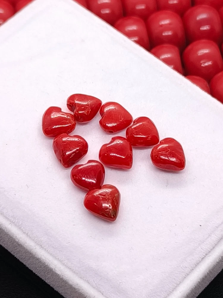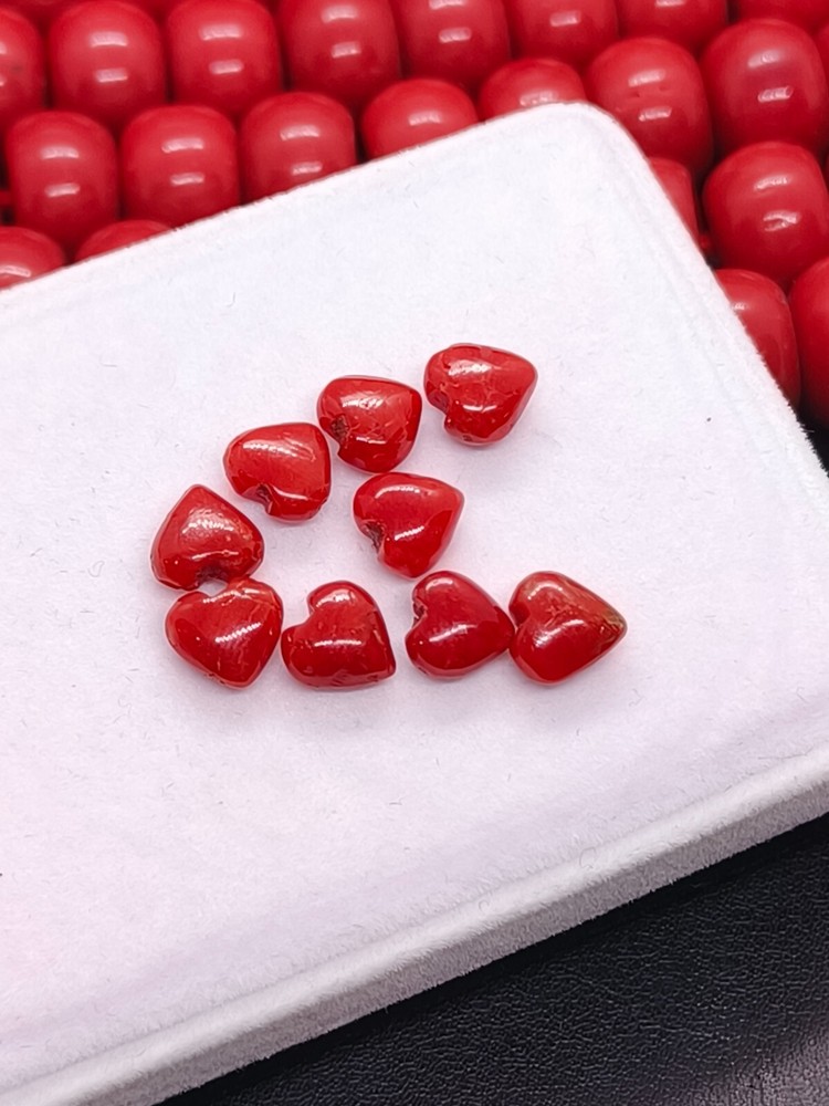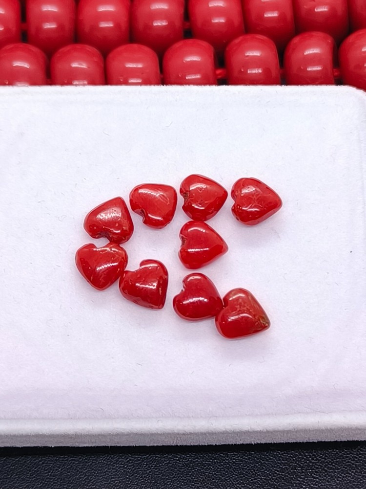 Discover the vibrancy and allure of our AAA Quality Red Coral Heart Shape Cabs, an exquisite selection for making jewelry. Sourced from the rich cliffs of Italy, each piece showcases the natural beauty of coral in a stunning heart cabochon form. The opaque gemstone, boasting an eye-clean clarity grade, measures 7/8mm in length and weighs 16 Crt, composed of nine individual pieces that exude a warm, orange hue. Crafted with excellent cut grade precision, these natural, non-enhanced coral gems are a testament to Italian craftsmanship. The polished cabochons, unbranded and eye-catching, are ideal for creating bespoke jewelry or adding to a discerning collector's array. With the inclusion of IGI certification, these coral cabs are a genuine and luxurious addition to any gemstone collection.