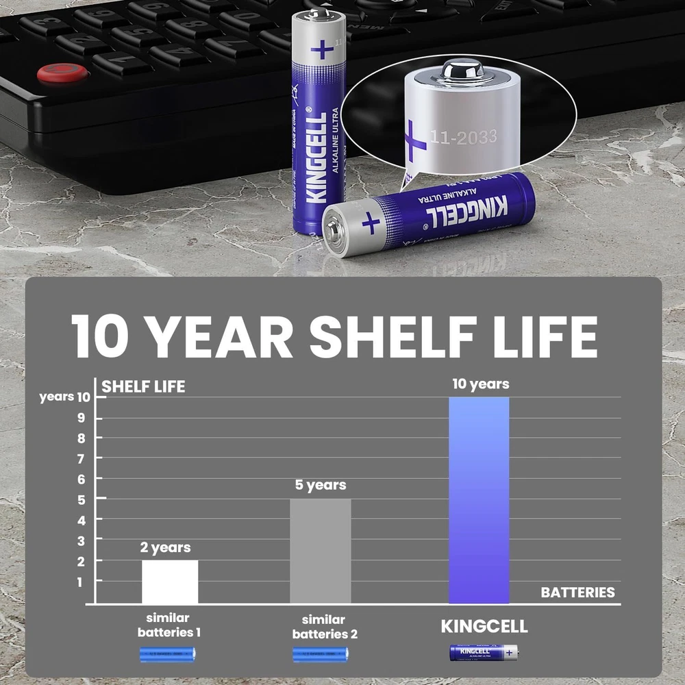 【KINGCELL 36 Pack AAA Batteries】Bundled in a recloseable package for easy storage and organization.Meeting the daily needs of families. 【Dual Leakproof Technology】Multi-seal anti-leakage design can effectively prevent leakage, don‘t have to worry about corrosion damage to your equipment, has a strong protective effect 【10-Year Shelf Life】KINGCELL AAA Batteries High performance battery technology can make KINGCELL maintain power for up to 10 years in proper storage. 【Ultra Long-Lasting】Higher capacity and more cost-effective than regular batteries.No need to replace batteries frequently 【Widely Used】KINGCELL AAA batteries are perfect for various devices, including remotes, flashlights, kid toys, wireless keyboards, and more. 【Environmentally Friendly】Free from harmful substances such as mercury and cadmium, making them safe for your family and the environment. By choosing KINGCELL Batteries, you're making a sustainable choice while enjoying reliable power.