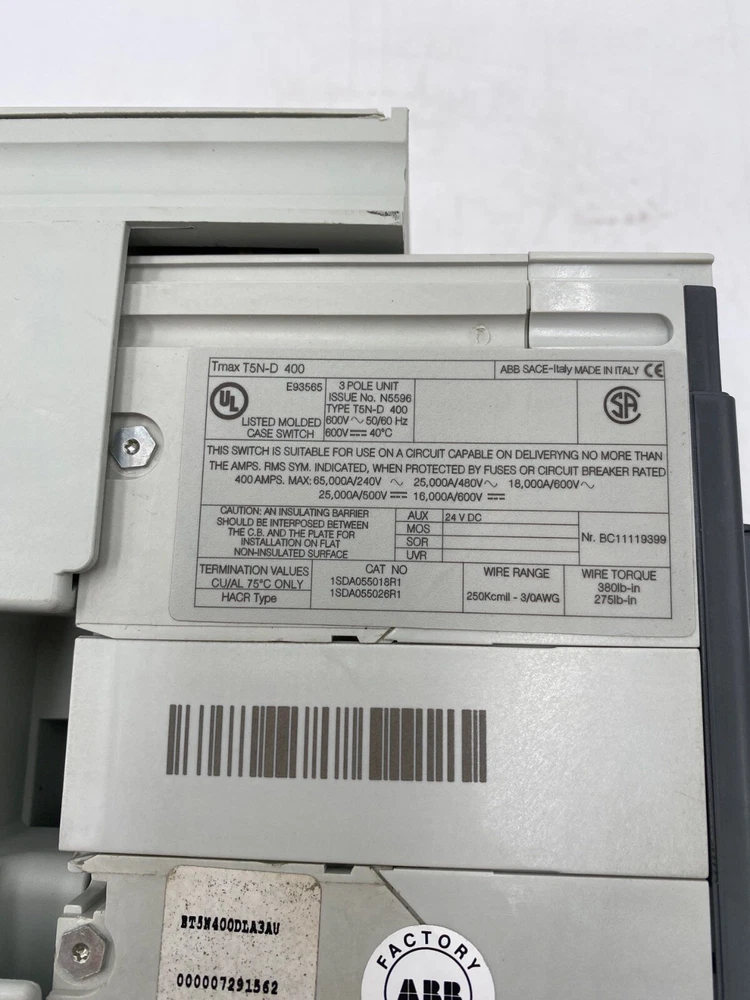 ABB T5N-D400 Circuit Breaker 400A 3P 600V 3PH SACE Tmax T5N D400 400 Amp 3 Pole Condition Notes: On bracket RA7970 Cady Tray Sled Item pictured will be exact item you receive unless multiple quantities listed. Please review all pictures carefully. Please ask any questions prior to purchase.