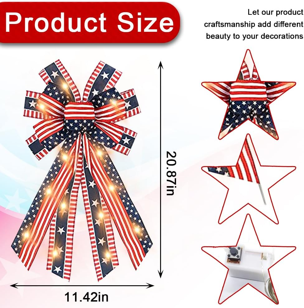 Store New Arrivals Add to Favorite View Feedback Contact ABTOLS Large LED Patriotic Wreath Bow for Front Door, 4Th of July Red Blue White Stars and Stripes Bows for Wreath American Flag Star Bows for Indoor Outdoor Memorial Day Party Door Wall Fence Decor Description Item Weight 2.08 ounces Batteries required No Manufacturer ABTOLS Color Bow5 Led Package Dimensions 11.1 x 3.62 x 2.99 inches Patriotic style bow: you will get 1 piece of 4th of July LED patriotic star wreath bow, which is designed to be multilayered and three-dimensional, featuring an atmosphere of rejoicing and festivity and bringing you lots of fun to your July 4th party. Patriotic Tree Topper Bow Material: This decorative wreath bow is made of premium plaid cloth, with big bowknot shape, simple but fashion, durable and handmade, lightweight and long-term for you to apply, also not easy to break or fade. Appropriate dimensions: This Veterans Day bow measures 11.42 inch wide and 20.87inch long, which is large and prominent, suitable as centerpiece decoration. Red Blue White Stripe Bows Easy to Use: take out the Memorial Day America flag wreath bows, organize the details, you can restore perfection. Put down the ribbon, then put it on the door, Ideal hanging accessories for archway or wall while Veteran's Day, Christmas,Thanksgiving, Memorial Day, 4th of July, Independence Day Decorations. Can be used for prom, party, church meetings, dancing party, summer picnic, wedding or any other special soiree decoration. Farmhouse Large Gift Bow Wide Application: DIY yarn ornament bows are suitable for kinds of occasions, can be widely applied in 4th of July party or activities, home decors,attach the bow to wreaths, arches, stairways, chairs and other DIY craft projects.Use and satisfy your various decoration requirement in daily life, you can also share them with others. Specifications: Material: polyester,yarn Color: as the pictures shown Size: approx. 20.8 x 11.4 inch (L x W) Quantity: 1 piece Package includes: 1 x Independence Day LED Wreath Bow Warm notes: Manual measurement, please allow slight errors on size. The color may exist slight difference due to different screen display. Please keep the 4th of July wreath bow away from fire. ABOUT US We offer the best prices around on high quality products. Our E-store includes media such as books, movies, music and games while offering electronics, toys, sporting apparel, clothing, tools, general home, garden items and more. SHIPPING We are always working hard to ensure your package arrives as soon as possible. Please understand that some factors like weather, high postal traffic, and the performance of shipping companies are outside of our control. We offer free shipping to the lower 48 states and ship within 2 business days of payment, usually sooner. We do not accept P.O. Boxes. Please provide a physical address. RETURNS We offer a 30-Day Return Policy on items which you are not completely satisfied with. You have the option for a full-refund or an exchange of the item. No returns are available on items shipped outside of the USA. PAYMENT We accept PayPal. CONTACT US This page content is yet to come Please ad us to your favorite seller and visit again later Thank You CUSTOMER SATISFACTION We try our very best to make sure every customer is completely satisfied. If there's a problem, message us! We're happy to help.