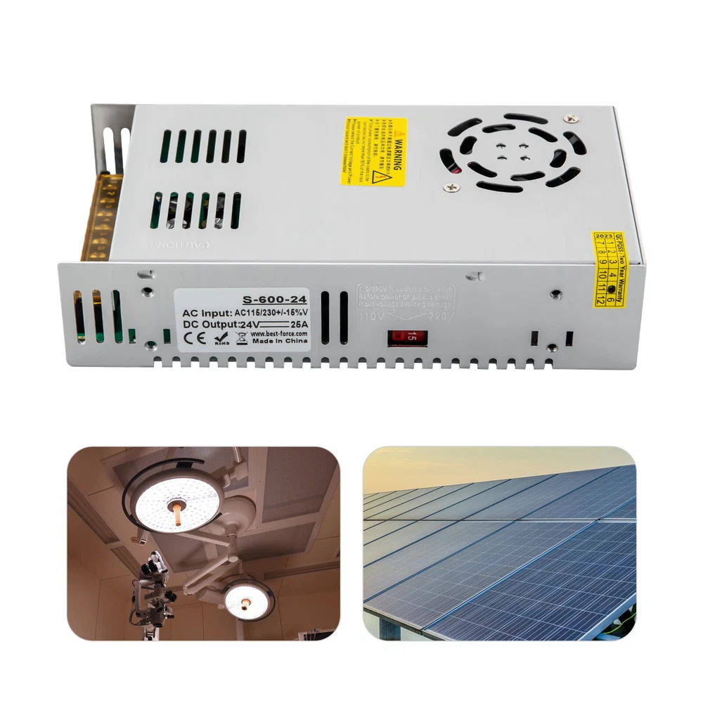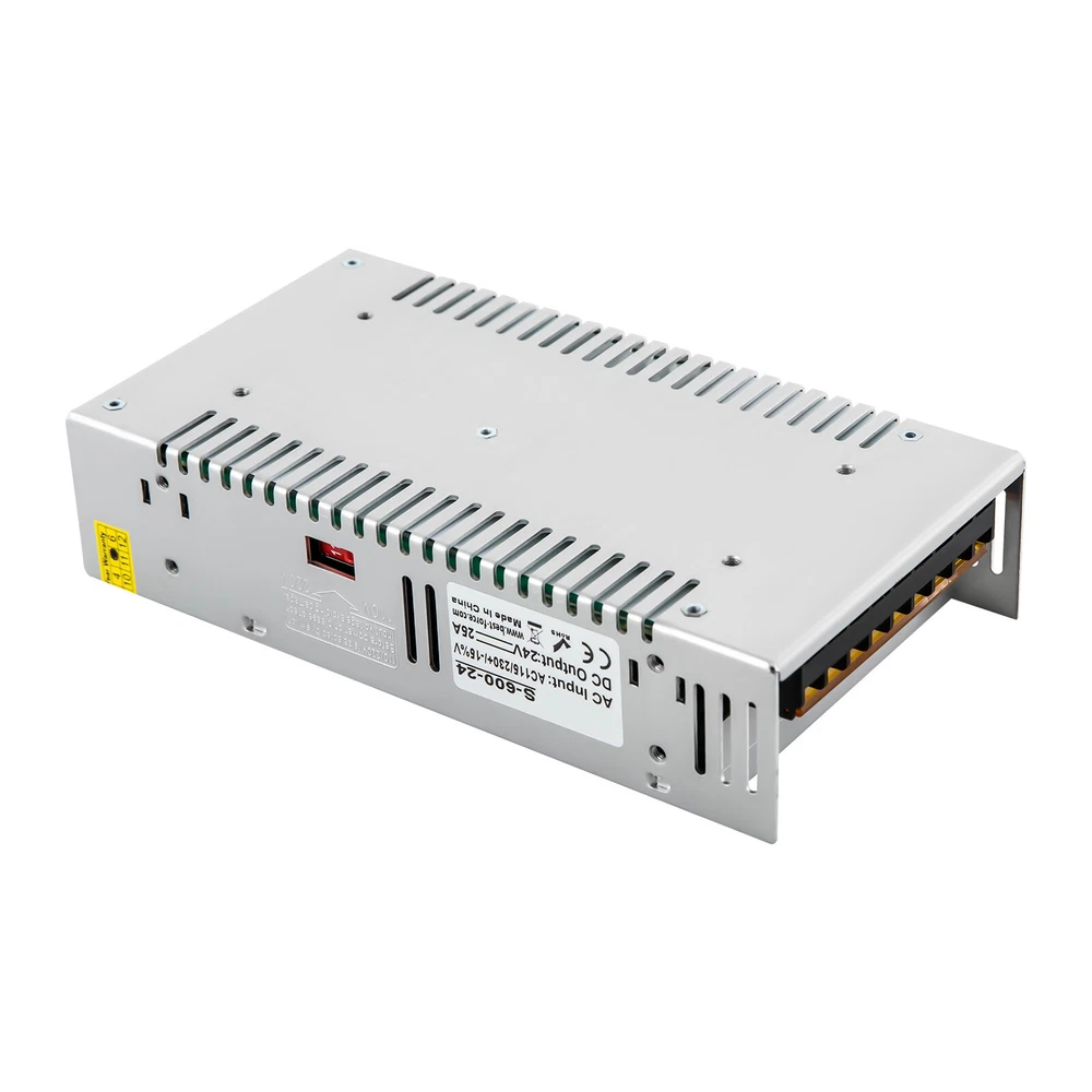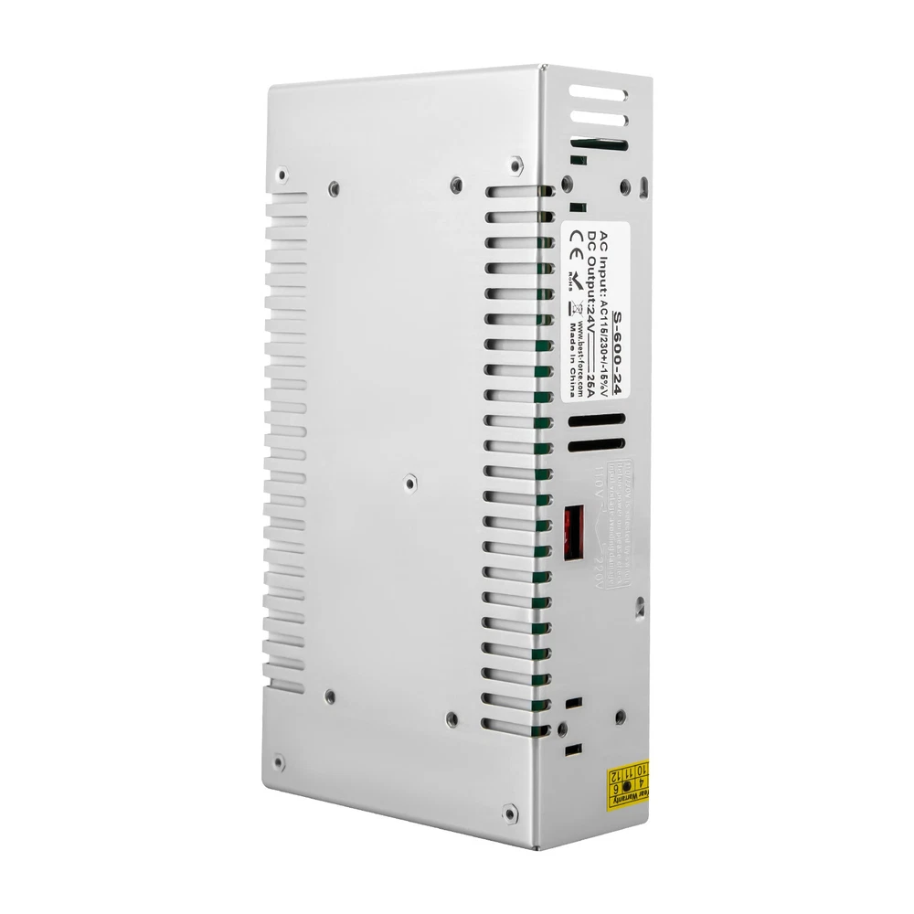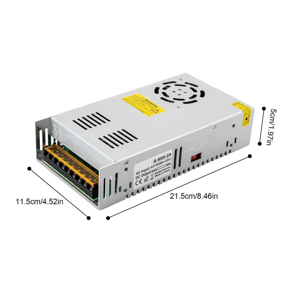 AC 110Volt TO DC 24V Voltage Transformer Switch Power Supply Converter 25A 600W Description If you are troubled with situations such as poor safety performance of electrical appliances, frequent tripping due to unstable voltage, and electrical appliances brought back from abroad cannot be used normally, then you should get our switch power supply that can effectively realize voltage convert from 110V to 24V. It uses high-quality aluminum and pure copper coils , ensuring durable use and stable performance. It is widely applicable for various appliances to meet your daily needs. Key Features Stable Output: Using the pure copper coils/transformer, EMI filter capacitor, premium chip, high-performance IC, and the soft start current design, this switch power supply has stable performance converting AC voltage to stable DC voltage while effectively reducing electromagnetic interference. It has 2 output ports and each port outputs 0~25A automatically to match your device. The default output voltage is 24V, but it can be regulated by 5%. Premium Material: The high-quality aluminum housing and premium interior materials such as PCB fiberglass board and pure copper make this product strong, wear-resistant , and durable. The wiring terminal has anti-rust and anti-corrosion functions. High Safety: Adopting a cooling fan with heat-sink holes, temperature detector, pure copper transformer, high-temperature-resistant capacitor, auto-reset or fuse function, surge protection, over-voltage protection, short-circuit protection, over-current protection, and overload protection, this product is safe to use. A Great Helper: Once in operation, this SMPS can effectively convert AC 110V to DC 24V and provide different currents per watt for multiple devices, which is a great helper in your daily life. Compact Size: The compact size(8.46*4.52*1.96 inches) means this machine won't occupy your space, so you can put it in any small corner. Simple Installation : The simple structure and pre-drilled holes allow for easy and convenient installation. Protective Package: To prevent the product from being damaged and bumped during transportation, we packed it with foam cotton to protect your products to the maximum extent possible. Buy with Confidence: We have been working hard to provide better service and quality for our customers, which is our goal. If there is any problem with our products. Please contact us in time. Details Indicator Light: The indicator light shows the normal work condition of this switch power supply when it works for your convenience. Clear Cover: The safety protection cover is dustproof and better avoids accidental electric shock during power operation. Application It is suitable for LED power supplies, medical power supplies, display screen power supplies, industrial control systems, power equipment, instruments, solar photovoltaic power supplies, stepper motors, PLC control systems, surveillance cameras, LED light boxes, LED lamps, luminous characters, communication equipment, home appliances, industrial equipment, building lighting, medical equipment, traffic signal control, etc. How to Calculate Support Max. LED Strip Length Assumption: Your LED strip is 60LEDs/m and each LED 0.2W, then calculate max LED strip length: 0.2W/LED × 60LEDs/m=12W/m, 24W(this listing)÷12W/m=2m. So, it supports the LED strip(60LEDs/m, 0.2W/LED) length (Max)=2m light. Wiring Description L, N: AC Power Input GND: Ground Wiring -V: DC Power Output "-" +V: DC Power Output "+" ADJ: Adjust the Output Voltage(±5%) Specifications Model: S-600-24 Color: Silver Style: Modern Shape: Rectangular Mounting Type: Wall Mount Housing Material: Aluminum Power Source: Corded Electric AC Input: 110V DC Output: 24V, 25A Power: 600W Frequency: 50-60Hz Error Accuracy: ±1% Efficiency: >80% Output Adjustable Voltage Range: ±5% Leakage Current: <1mA/230V Temperature Coefficient: ±0.03%/℃(0~50℃/32~122 °F ) Operating Temperature&Humidity: -10℃~+60℃/14~140 °F , 20%~90%RH Environment Temperature&Humidity: -20℃~+85℃/-4~185 °F ,10%~95%RH Start/Up/Maintain Time: 200ms, 50ms, 20ms Shock Resistance : 10~500Hz, 2G 10min /Period, 60min, Each Axis Pressure Resistance between Input and Output: 1.5KvAC Input and Shell; 1.5KvAC Output and Shell; 0.5KvAC Installation Hole Diameter: 2.5mm/0.01inch Product Size: 21.5*11.5*5cm/8.46*4.52*1.96inch Package Size: 23*13*6cm/9.05*5.12*2.36inch Gross Weight: 0.75kg/1.65 lbs Package Included 1* Switch Power Supply Notes This item does not include the power cord and screws. Please refer to the corresponding model "output voltage, current, and power". It does not apply to the battery, speed-regulating motor, heater, and engraving machine. The testing condition for the parameter above is 110VAC input, rated load, 25℃ temperature, and 70% RH. The error includes the setting error, ling stability, and load stability(The test of the load is from 0% to 100%.). The wave test adopts A12 double wires for 30MHZ and 0.1uF847uF capacitor short-circuit for interrupting. The inlet voltage stability test: when it is overloaded, the lowest voltage of the inlet is up to the highest voltage. Please calculate the actual power before using the product to make sure of its lifespan. It‘s suggested that the total power consumption of the loads to be connected be not more than 75% of the rated power of the product. Please make sure your device has a voltage of 24V and uses power less than 600W. If it runs 24*7 hours, the power consumed should not exceed 40% of the full load. Applied to the motor: 2 times the power of the device = the nominal power of the transformer unit. Please switch to a suitable voltage before use. When working at 110V, please keep the load under 70%; When working at 220V, the load can reach 100%. Professional installation by a licensed electrician is highly recommended. Please check if the wiring is correct before wiring. It supplies less than 25A. For example, if your device draws 7.5A, then 7.5A w
