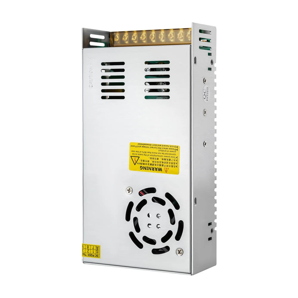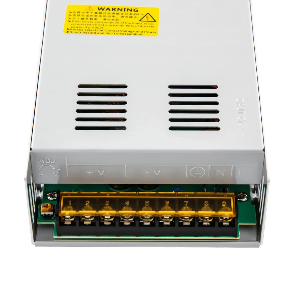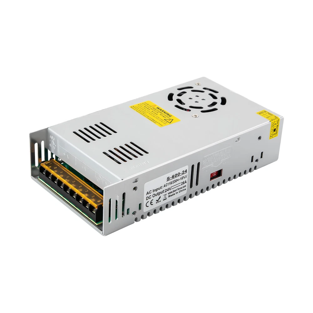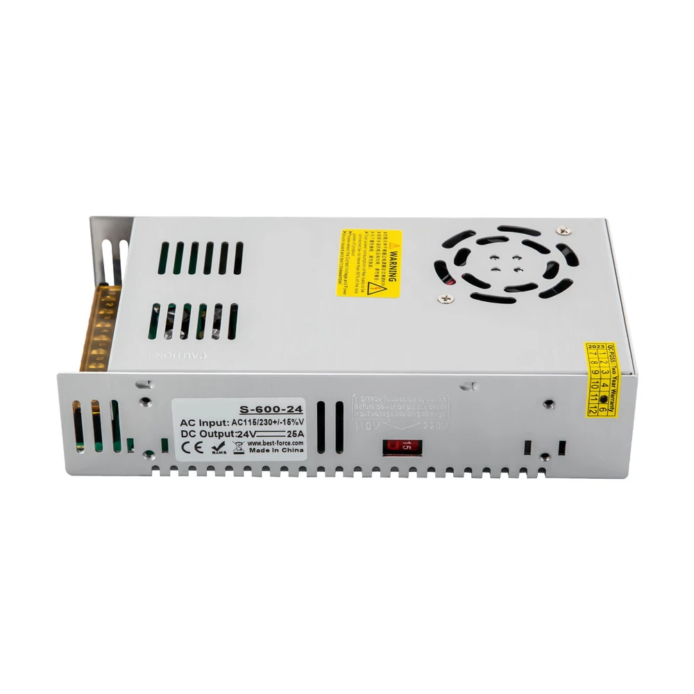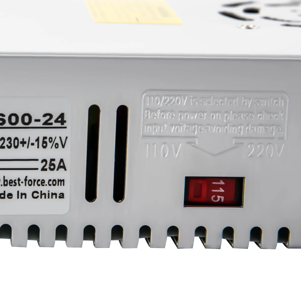 AC 110Volt TO DC 24V Voltage Transformer Switch Power Supply Converter 25A 600W Description If you are troubled with situations such as poor safety performance of electrical appliances, frequent tripping due to unstable voltage, and electrical appliances brought back from abroad cannot be used normally, then you should get our switch power supply that can effectively realize voltage convert from 110V to 24V. It uses high-quality aluminum and pure copper coils , ensuring durable use and stable performance. It is widely applicable for various appliances to meet your daily needs. Key Features Stable Output: Using the pure copper coils/transformer, EMI filter capacitor, premium chip, high-performance IC, and the soft start current design, this switch power supply has stable performance converting AC voltage to stable DC voltage while effectively reducing electromagnetic interference. It has 2 output ports and each port outputs 0~25A automatically to match your device. The default output voltage is 24V, but it can be regulated by 5%. Premium Material: The high-quality aluminum housing and premium interior materials such as PCB fiberglass board and pure copper make this product strong, wear-resistant , and durable. The wiring terminal has anti-rust and anti-corrosion functions. High Safety: Adopting a cooling fan with heat-sink holes, temperature detector, pure copper transformer, high-temperature-resistant capacitor, auto-reset or fuse function, surge protection, over-voltage protection, short-circuit protection, over-current protection, and overload protection, this product is safe to use. A Great Helper: Once in operation, this SMPS can effectively convert AC 110V to DC 24V and provide different currents per watt for multiple devices, which is a great helper in your daily life. Compact Size: The compact size(8.46*4.52*1.96 inches) means this machine won't occupy your space, so you can put it in any small corner. Simple Installation : The simple structure and pre-drilled holes allow for easy and convenient installation. Protective Package: To prevent the product from being damaged and bumped during transportation, we packed it with foam cotton to protect your products to the maximum extent possible. Buy with Confidence: We have been working hard to provide better service and quality for our customers, which is our goal. If there is any problem with our products. Please contact us in time. Details Indicator Light: The indicator light shows the normal work condition of this switch power supply when it works for your convenience. Clear Cover: The safety protection cover is dustproof and better avoids accidental electric shock during power operation. Application It is suitable for LED power supplies, medical power supplies, display screen power supplies, industrial control systems, power equipment, instruments, solar photovoltaic power supplies, stepper motors, PLC control systems, surveillance cameras, LED light boxes, LED lamps, luminous characters, communication equipment, home appliances, industrial equipment, building lighting, medical equipment, traffic signal control, etc. How to Calculate Support Max. LED Strip Length Assumption: Your LED strip is 60LEDs/m and each LED 0.2W, then calculate max LED strip length: 0.2W/LED × 60LEDs/m=12W/m, 24W(this listing)÷12W/m=2m. So, it supports the LED strip(60LEDs/m, 0.2W/LED) length (Max)=2m light. Wiring Description L, N: AC Power Input GND: Ground Wiring -V: DC Power Output "-" +V: DC Power Output "+" ADJ: Adjust the Output Voltage(±5%) Specifications Model: S-600-24 Color: Silver Style: Modern Shape: Rectangular Mounting Type: Wall Mount Housing Material: Aluminum Power Source: Corded Electric AC Input: 110V DC Output: 24V, 25A Power: 600W Frequency: 50-60Hz Error Accuracy: ±1% Efficiency: >80% Output Adjustable Voltage Range: ±5% Leakage Current: <1mA/230V Temperature Coefficient: ±0.03%/℃(0~50℃/32~122 °F ) Operating Temperature&Humidity: -10℃~+60℃/14~140 °F , 20%~90%RH Environment Temperature&Humidity: -20℃~+85℃/-4~185 °F ,10%~95%RH Start/Up/Maintain Time: 200ms, 50ms, 20ms Shock Resistance : 10~500Hz, 2G 10min /Period, 60min, Each Axis Pressure Resistance between Input and Output: 1.5KvAC Input and Shell; 1.5KvAC Output and Shell; 0.5KvAC Installation Hole Diameter: 2.5mm/0.01inch Product Size: 21.5*11.5*5cm/8.46*4.52*1.96inch Package Size: 23*13*6cm/9.05*5.12*2.36inch Gross Weight: 0.75kg/1.65 lbs Package Included 1* Switch Power Supply Notes This item does not include the power cord and screws. Please refer to the corresponding model "output voltage, current, and power". It does not apply to the battery, speed-regulating motor, heater, and engraving machine. The testing condition for the parameter above is 110VAC input, rated load, 25℃ temperature, and 70% RH. The error includes the setting error, ling stability, and load stability(The test of the load is from 0% to 100%.). The wave test adopts A12 double wires for 30MHZ and 0.1uF847uF capacitor short-circuit for interrupting. The inlet voltage stability test: when it is overloaded, the lowest voltage of the inlet is up to the highest voltage. Please calculate the actual power before using the product to make sure of its lifespan. It‘s suggested that the total power consumption of the loads to be connected be not more than 75% of the rated power of the product. Please make sure your device has a voltage of 24V and uses power less than 600W. If it runs 24*7 hours, the power consumed should not exceed 40% of the full load. Applied to the motor: 2 times the power of the device = the nominal power of the transformer unit. Please switch to a suitable voltage before use. When working at 110V, please keep the load under 70%; When working at 220V, the load can reach 100%. Professional installation by a licensed electrician is highly recommended. Please check if the wiring is correct before wiring. It supplies less than 25A. For example, if your device draws 7.5A, then 7.5A w