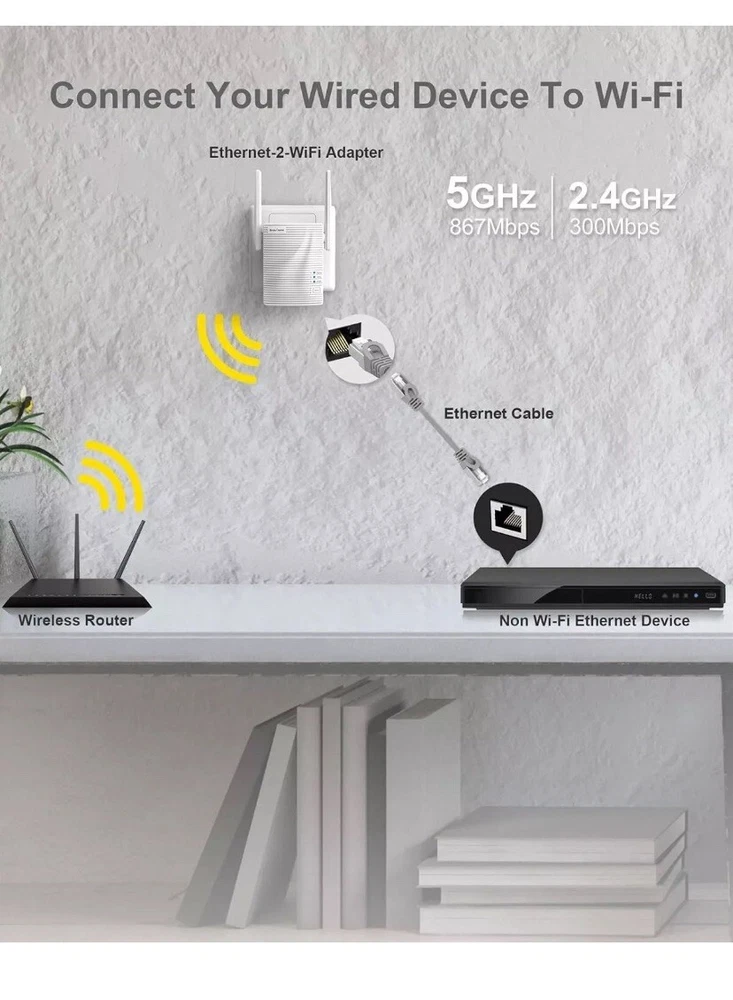 CONNECT YOUR WIRED DEVICE TO Wi-Fi: by Using this Dual Band Ethernet to Wireless Adapter, your Ethernet-enabled Devices can Access the Internet via Wireless Connection, Powered by Electrical Outlet WORK WITH ANY ETHERNET ENABLED DEVICES: This Wireless to Ethernet Adapter Supports Smart TV, Game Console, Blu-Ray Player, Network Printer, Raspberry Pi, Ethernet Switch or Computer etc., No Driver Installation or Update Needed AC1200 FASTER WIRELESS SPEED: Up to 867Mbps on 5GHz WiFi or 300Mbps on 2.4GHz WiFi, Excellent for Online Video Streaming, Gaming, High Quality Music and Facebook by Using this 802.11ac WiFi to Ethernet Adapter, 4 X Speed of N300 UNIVERSAL COMPATIBILITY: This 5GHz Universal Wireless Adapter Works with Any 802.11ax/ac/a/b/g/n WiFi Routers BETTER WIFI SIGNAL: The Ethernet Wireless Adapter comes with 2X Angle Adjustable External Smart WiFi Antennas which Pick up Stronger WiFi Signal than Internal Ones
