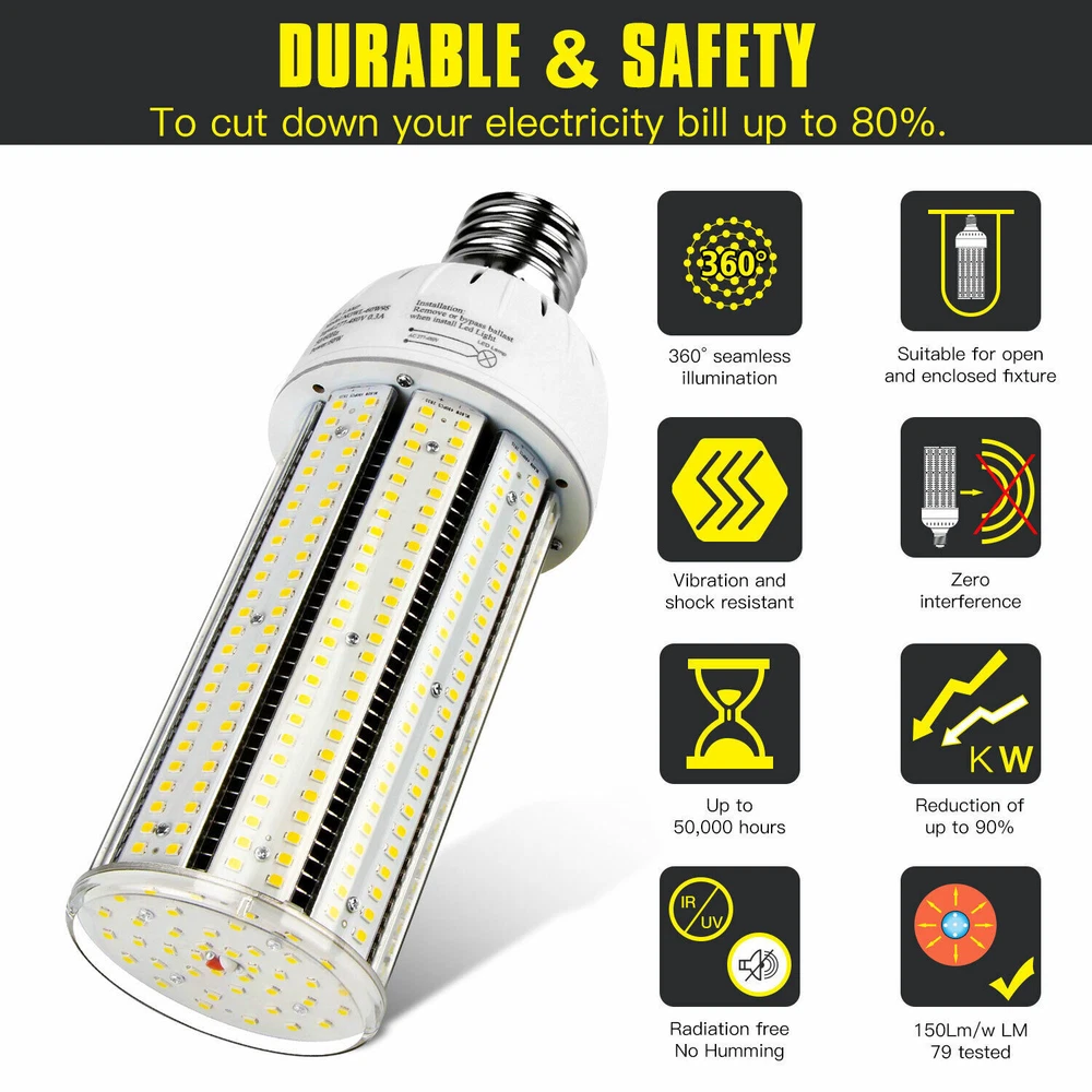 Product Description AC480V 347V LED Corn Cob Light Bulb 60W E39 Mogul Base Led Bulbs 5000K Daylight 【Super Bright】60W led corn cob with 8,400 lumens and 360 degree beam angle fits to be 250W HID Replacement retrofit. The installation height is recommended between 7ft and 12ft. 【90% Energy Saving】The LED corn light reduce more than 90% electricity consume than traditional light. Available for working voltage from 277VAC to 480VAC 【Quality Listed】The industrial quality light passed ETL certification. It offers a safer using at home, commercial, industrial area. 【Easy Installation】E39 Base is easy to Connect directly a screw base. Must be remove or bypass the ballast in your electric circuit before installation. 【Long Lifespan】This bulb has 50,000 hours lifespan. Offering at least 11 years of lighting time if used 12 hours a day. 【Warranty】We provide with 5 years warranty for all our bulbs. If any problem or question about bulbs please contact us by email. We will reply within 24 hours. Product Description The LED cob bulb are ETL listed with outstanding industrial quality, superb energy efficiency, long lifespan and easy installation. Compared with traditional light bulbs, we provide brighter lighting and wider applications, but we have achieved up to 90% energy saving. So our LED light bulbs can help you save more than 90% of electricity bills. The design of Non-flickering No UV or IR radiation can provide higher stability and reliability when using the bulbs. Feature: 1. ETL Listed 2.Replace 250W HID bulb 3.Instant lighting 4.6K high voltage surge protection 5.Non-flickering No UV or IR radiation Technical Data: 1.Lighting Technology: LED 2.Bulb Shape: Corn Cob 3.Rated Power: 60 watts 4.Input Voltage: AC277-480V 5.Bulb Base: E39 Base 6.Power Factor: >90% 7.Power Efficacy: 140 Lm/W 8.Color Temperature: 6,000K 9.Color Rendering Index (RA) : >80 10.PC Cover: Transparent 11.Materials:Aluminum+ASA 12.Lifespan: 50,000 hrs Wide Application: Indoor High Bay Area: warehouse, factory, workshop, shopping mall, church, garage, grocery, car wash-shop, gym, basketball court, tennis court, office, garden, community, back-yard, aircraft storage, farm, restaurant, airport, subway, convention center, swimming pool etc. Outdoor: Parking lot: shoebox, pole/box fixture. Street: cobra head, pole fixture. Gas station: canopy/High bay fixture. Yard/Garden: post top, floodlight/wall pack fixture, Billboard etc. About Us Payment Shipping Returns Contact Us SHENZHEN NUOGUAN TECHNOLOGY CO. LTD founded in 2010. We are high-technology comany specialized in manufacture Commercial and industrial LED light. Advanced production equipment and excellend R&D ability help us to combining service ,production sell together provide top-level products to our customers. 1. Payment is expected within 7 days of auction close. Or Unpaid Items will be forfeited per eBay . 2. Taxes may be applicable at checkout as states adopt new laws and regulations regarding sales tax collection. 1. We ONLY ship to USA . 2. Orders processed within 1-2 business day of payment verification. There’s no Delivery service or courier service on Saturdays, Sundays or Public Holidays. 3. We have 3 different warehouse in US,so due to stock status and time differences, we will choose to ship your item from our first available warehouse for fast delivery. 4. We offer Free Shipping within the Lower 48 states! All packages are sent via UPS or USPS.The delivery time for UPS Ground is typically 2-5 business days. We strive to ensure 100% satisfaction for each and every one of our customers. we offer a 30-day 100% money-back guarantee on all eBay orders. If your item isn't just as you wished, simply send it back to us and we'll refund or replace your item. Please note that all returns must be authorized by our Customer Service department. please contact us though message first if you have any problem. USA Warehouse. Fast shipping! We are appreciated your purchasing form our eBay store. Office Time: 9:30 - 18:30, Monday - Saturday (UTC+8) Please contact us with eBay Message. We will respond you within 24 hours on business day. About Us SHENZHEN NUOGUAN TECHNOLOGY CO. LTD founded in 2010. We are high-technology comany specialized in manufacture Commercial and industrial LED light. Advanced production equipment and excellend R&D ability help us to combining service ,production sell together provide top-level products to our customers. Payment 1. Payment is expected within 7 days of auction close. Or Unpaid Items will be forfeited per eBay . 2. Taxes may be applicable at checkout as states adopt new laws and regulations regarding sales tax collection. Shipping 1. We ONLY ship to USA . 2. Orders processed within 1-2 business day of payment verification. There’s no Delivery service or courier service on Saturdays, Sundays or Public Holidays. 3. We have 3 different warehouse in US,so due to stock status and time differences, we will choose to ship your item from our first available warehouse for fast delivery. 4. We offer Free Shipping within the Lower 48 states! All packages are sent via UPS or USPS.The delivery time for UPS Ground is typically 2-5 business days. Returns We strive to ensure 100% satisfaction for each and every one of our customers. we offer a 30-day 100% money-back guarantee on all eBay orders. If your item isn't just as you wished, simply send it back to us and we'll refund or replace your item. Please note that all returns must be authorized by our Customer Service department. please contact us though message first if you have any problem. Contact Us USA Warehouse. Fast shipping! We are appreciated your purchasing form our eBay store. Office Time: 9:30 - 18:30, Monday - Saturday (UTC+8) Please contact us with eBay Message. We will respond you within 24 hours on business day. You may also like 100W LED Barn Light with Dusk To Dawn Photocell Outdoor Garden Yard Night Light 69.05 USD Free shipping 200W UFO LED High Bay Light In