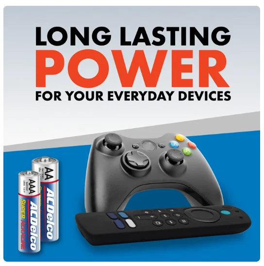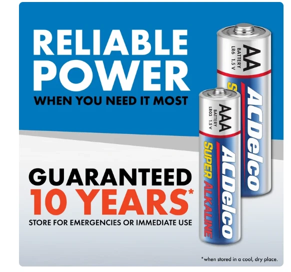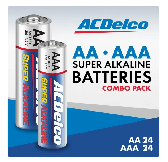 ACDelco AA and AAA Super Alkaline Batteries are equipped with advanced technology you can count on. ACDelco alkaline batteries perform better than the competition in high-drain and super high-drain devices, and they provide consistent discharge performance. ACDelco alkaline batteries are designed for long shelf-life with stainless steel pre-coating that prevents leakage and advanced ingredient formulation that helps maintain power over time. This set includes 24 AA batteries and 24 AAA batteries. AA and AAA batteries are great for a variety of household devices, including clocks, remote controls, and toys. The 1.5-volt batteries contain no mercury or cadmium, making them a smart choice for your family and for the environment. A trusted national brand, ACDelco offers a wide variety of batteries you can count on, including alkaline batteries, lithium coin cell batteries, rechargeable batteries, and car batteries. 48 Batteries: 24 AA batteries and 24 AAA batteries in recloseable storage pack High Performance: Performs better than the competition in high-drain and super high-drain devices 10-Year Shelf Life: Holds power and will not vent or leak when stored in a cool, dry place No Mercury: Contains no mercury or cadmium; safe for the home and better for the environment Everyday Electronics: ACDelco alkaline batteries area a household essential for all your electronic devices, toys, remote controls, gaming devices, flashlights and more On Feb 25, 2025 at 00:58:21 PST, seller added the following information: