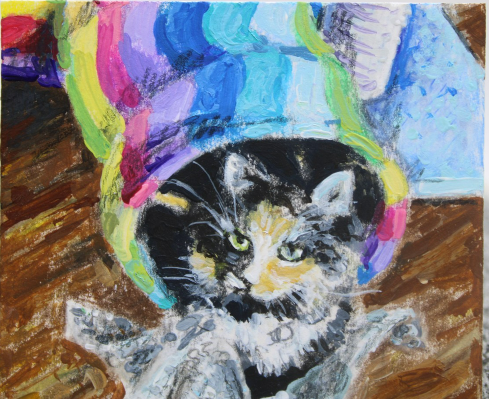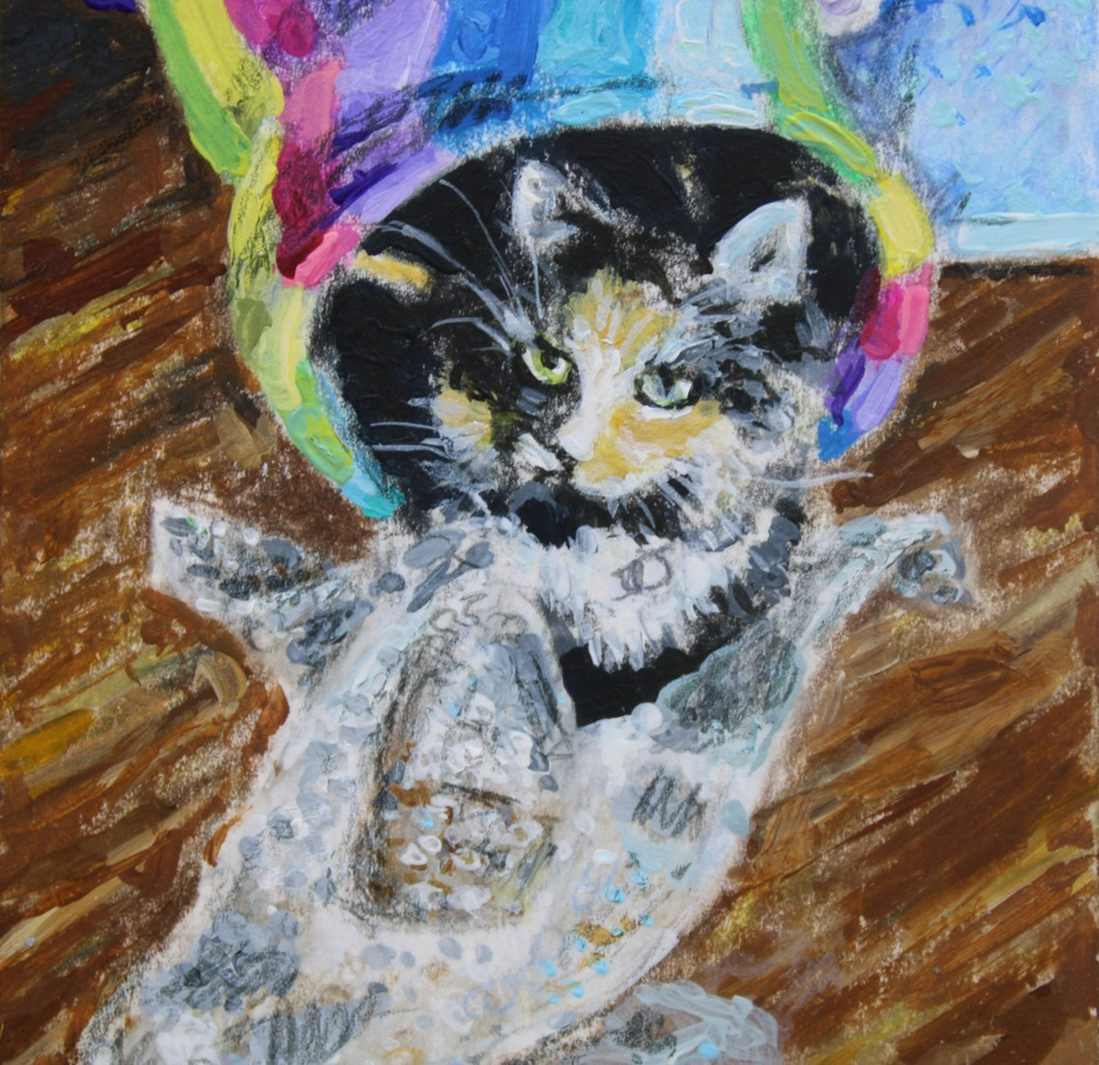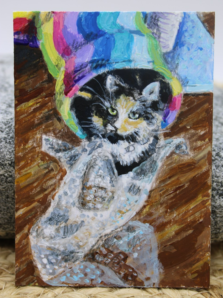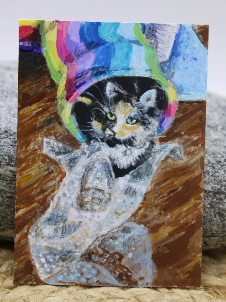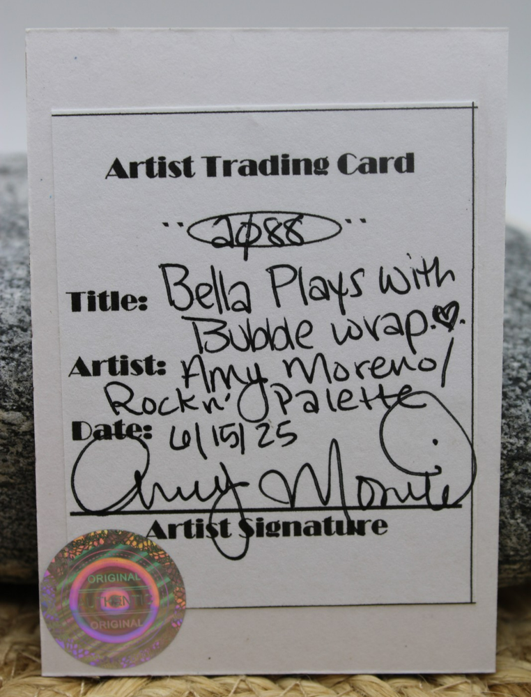 This is a cute original artwork done by me, Rockn Palette/ Amy Moreno. This artwork is of Miss Bella, resting in her rainbow tube, while playing with bubble wrap. This artwork is made with (mixed media) colored pencil and acrylic paint on mixed media paper. It is signed on the back with COA attached. Title: Bella plays with bubble wrap. ❤️ . Size: 3.5" by 2.5" Date: 6/15/25 This will ship in a regular envelope with stamps. I will make sure artwork in protected in envelope.