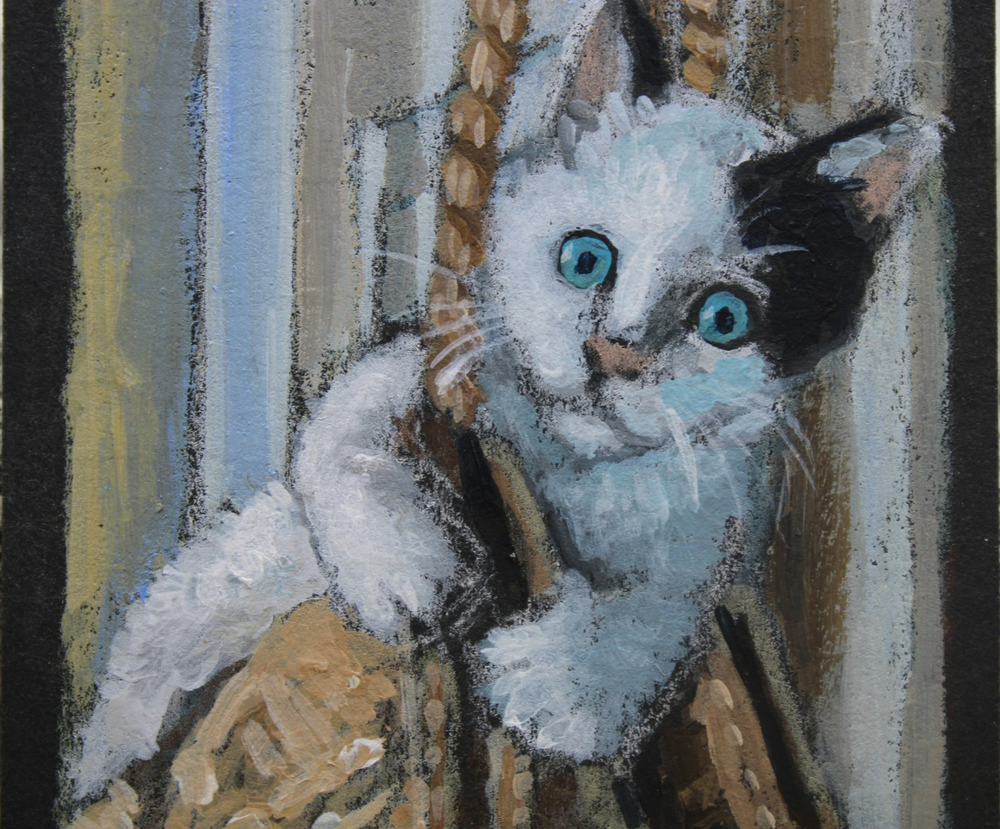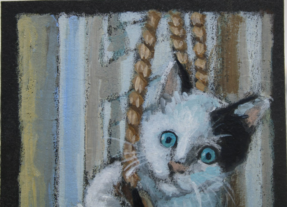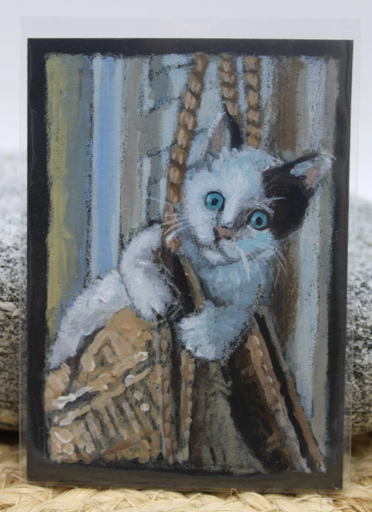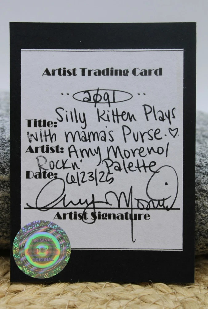 This is a cute original artwork done by me, Rockn Palette/ Amy Moreno, of a black and white kitten playing in mamma's purse that is hanging on the door. This artwork is made with (mixed media) colored pencil and acrylic paint on black mixed media paper. It is signed on the back with COA attached. Title: Silly kitten plays with mama's purse. . ❤️ . Size: 3.5" by 2.5" Date: 6/23/25 This will ship in a regular envelope with stamps. I will make sure artwork in protected in envelope.