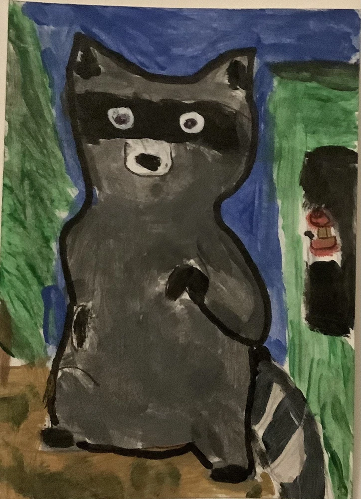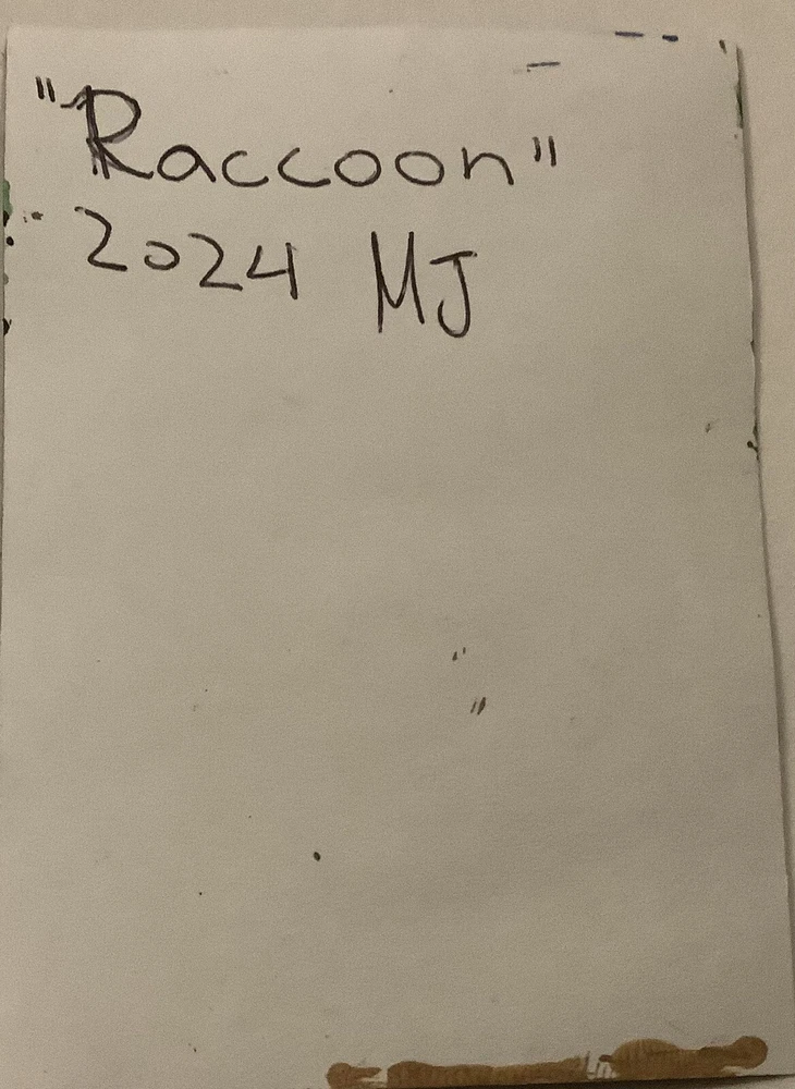 This is an original ACEO painting created by MJ in 2024. The artwork features a raccoon and elements of nature in a cartoon and abstract style. It is made with acrylic paint on paper and measures 2.5x3.5 inches. The painting is signed by the artist and is a single piece for sale. The unit type is a unit and the unit quantity is one. The artwork is from Tennessee, USA and is handmade.