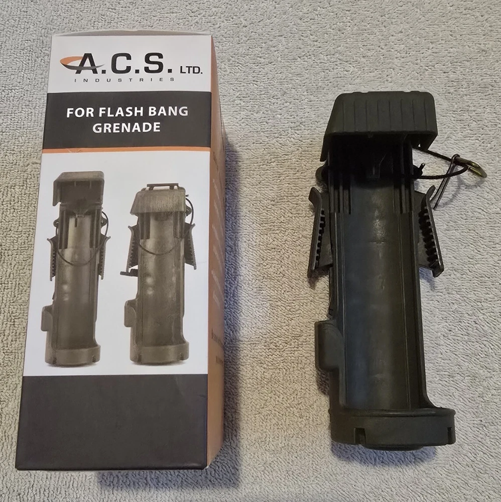This is an ACS Flashbang grenade holster made for the Safariland Low Roll style grenade. It is a real product for real grenades but will work perfectly with airsoft use. It is a quick release holster where you squeeze the sides and simply pull the grenade free. Pulling it free also pulls the pin for you.