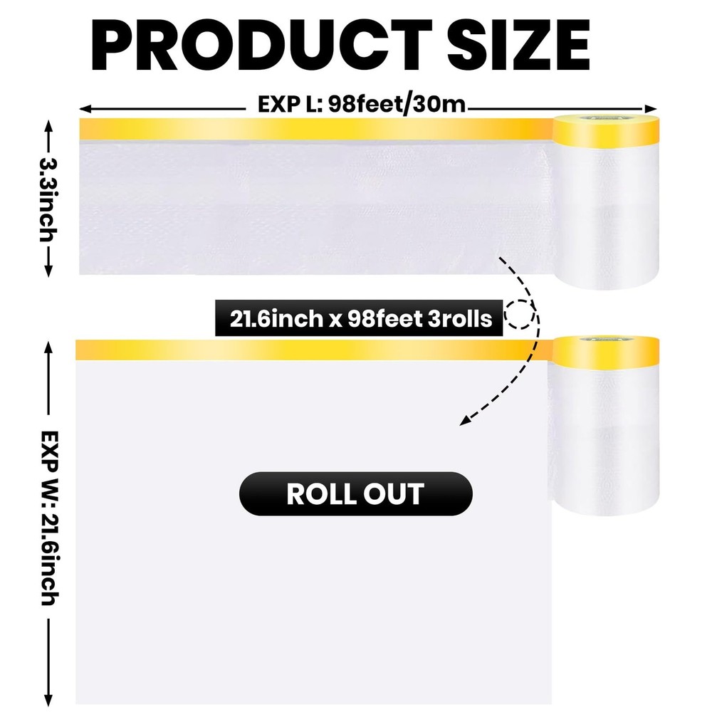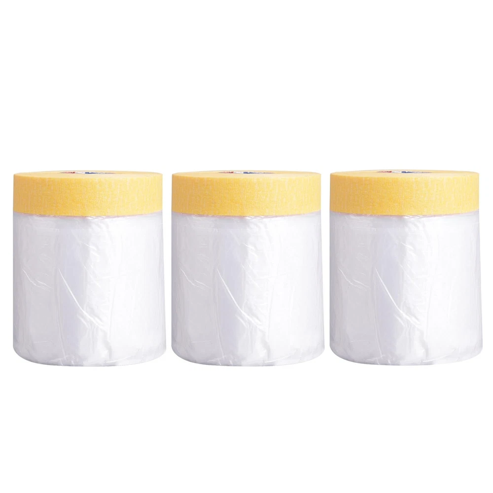 High density tape and drape is lightweight and tear resistant, and not easy to scratch, with premium quality dust-proof effect. Lightweight protective sheeting ideal for car automotive paint, household appliance, house decoration, furniture protection and drop cloth protection from dust and paint, water. 【Surface Protection】The pre-Taped Masking Film is the transparent tear-resistant paintable plastic overspray protective masking film, and can cover your furniture, carpet, floor, sofa, table, bed, closet, car when you renovate your house or travel. It can prevent household appliances and furniture from dust and paint during home decoration or painting. Can also be used as car dust cover, car paint spray paint protective film. 【Drop Down Design】Roll design for quick and convenient unfold the film and cover various small appliance. You can cut plastic tape of different lengths according to different items. It is perfect protector cover for moving supplies, packing supplies. 【Tough and Tear Resistance】Made of high quality material, waterproof, durable. Easy to unpack and spread out. The film is lightweight and highly resistant to tearing, ensuring complete surface protection by attracting dust and debris. 【Easy To Use】You just stick the tape side in right place, unravel the plastic film, it will slowly spread the plastic film to cover the object. Light weight, easy to roll out, paste and tear. Single person can do it and save you time, money, and effort. 【Masking Film Size】: Includes 3 rolls of protective film, each roll of 22" W x 33 Yds Long.