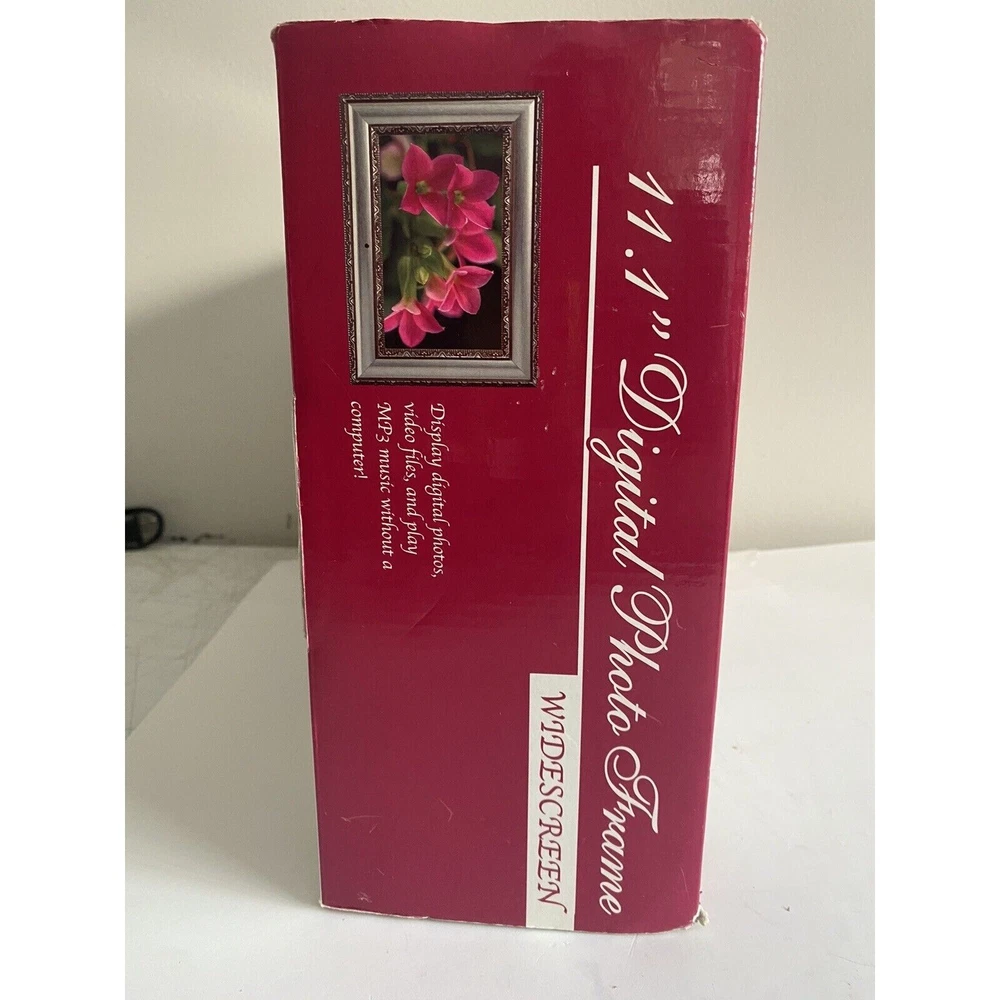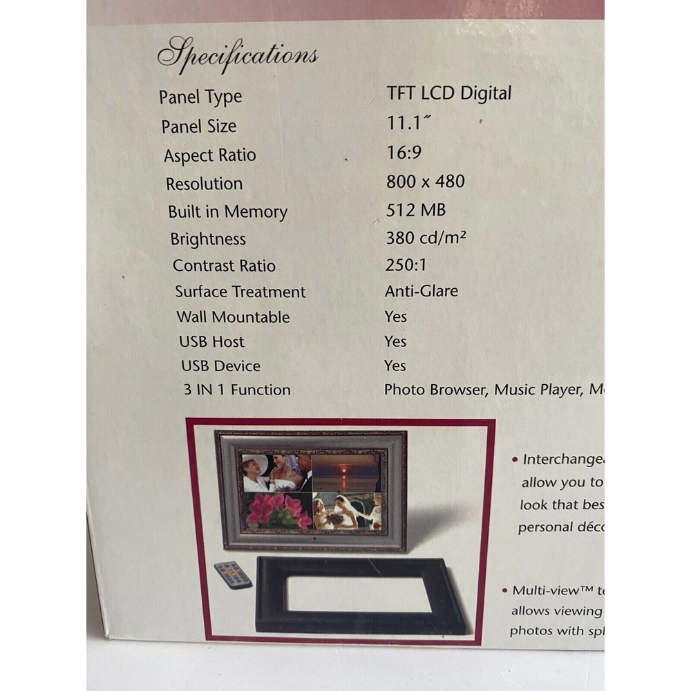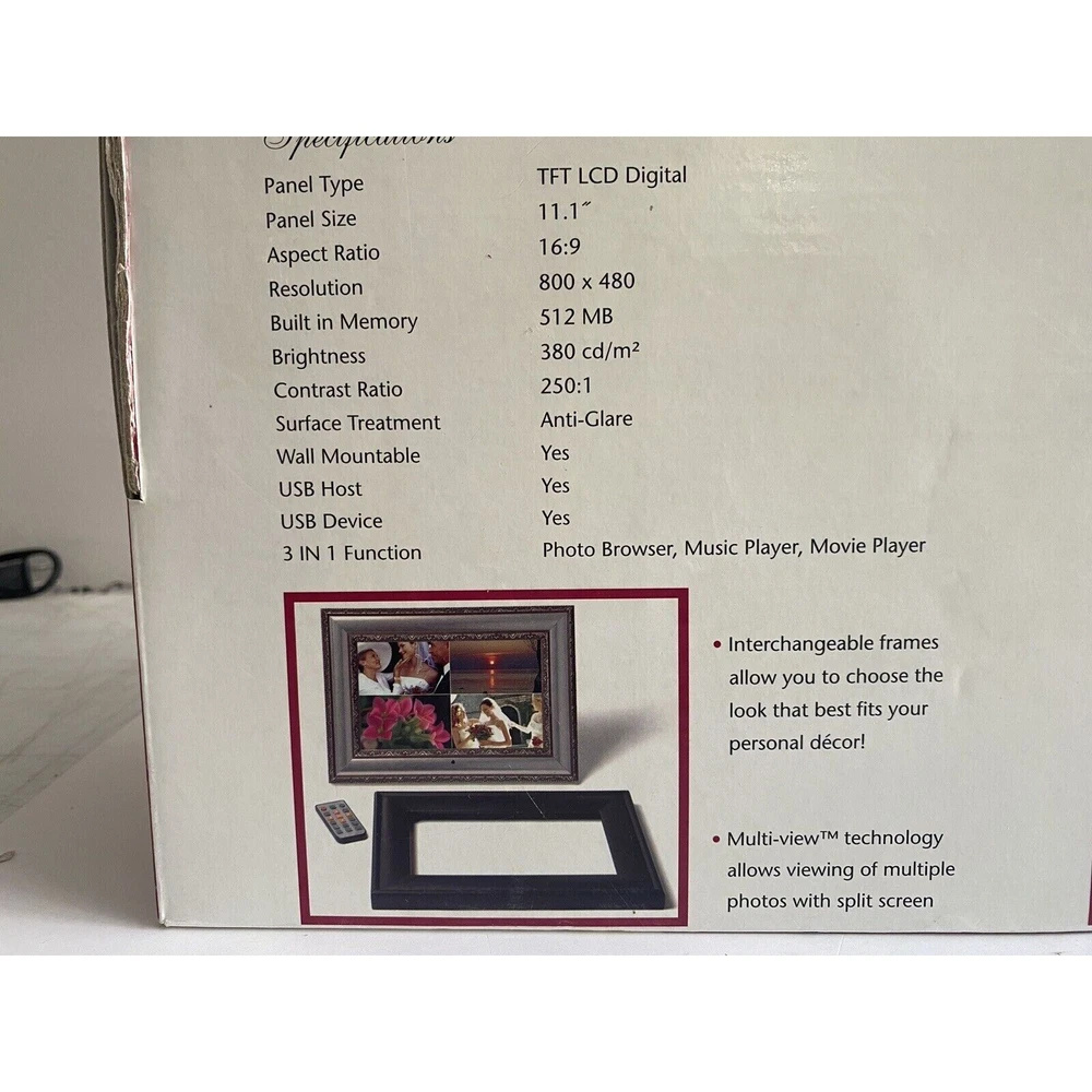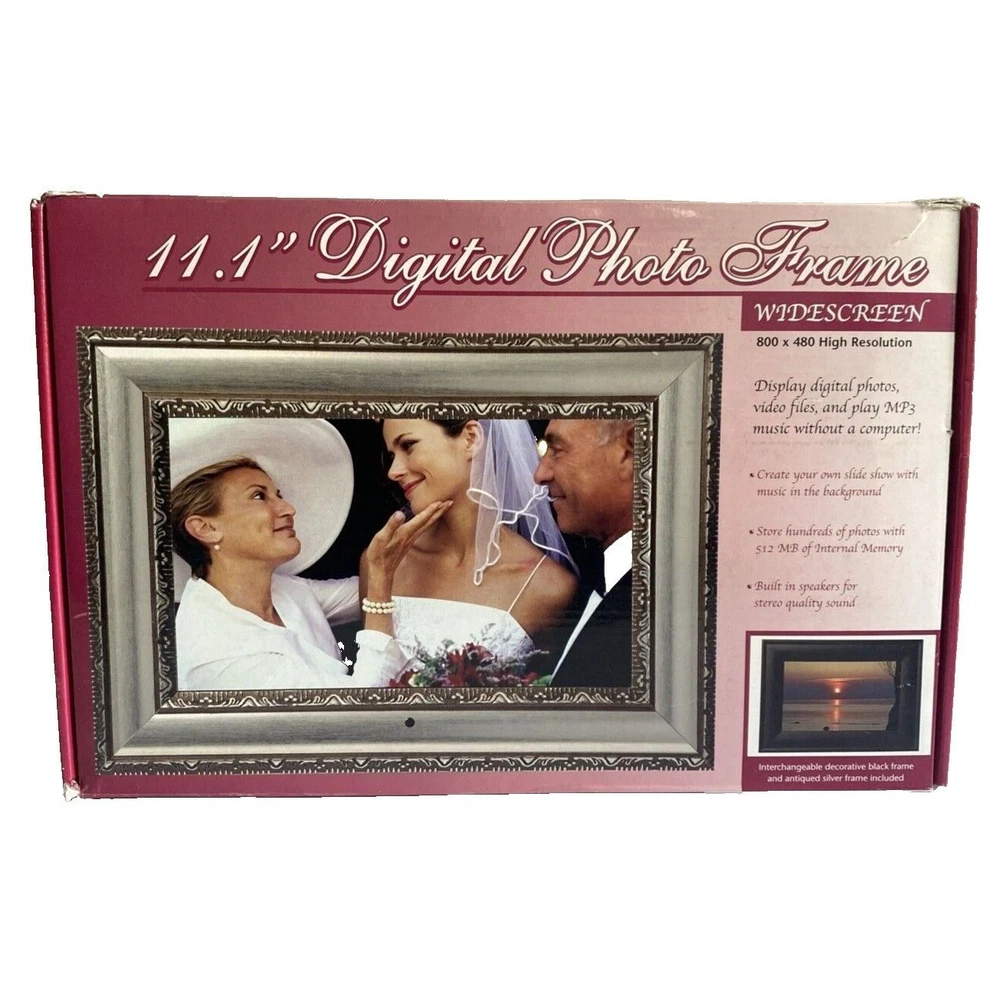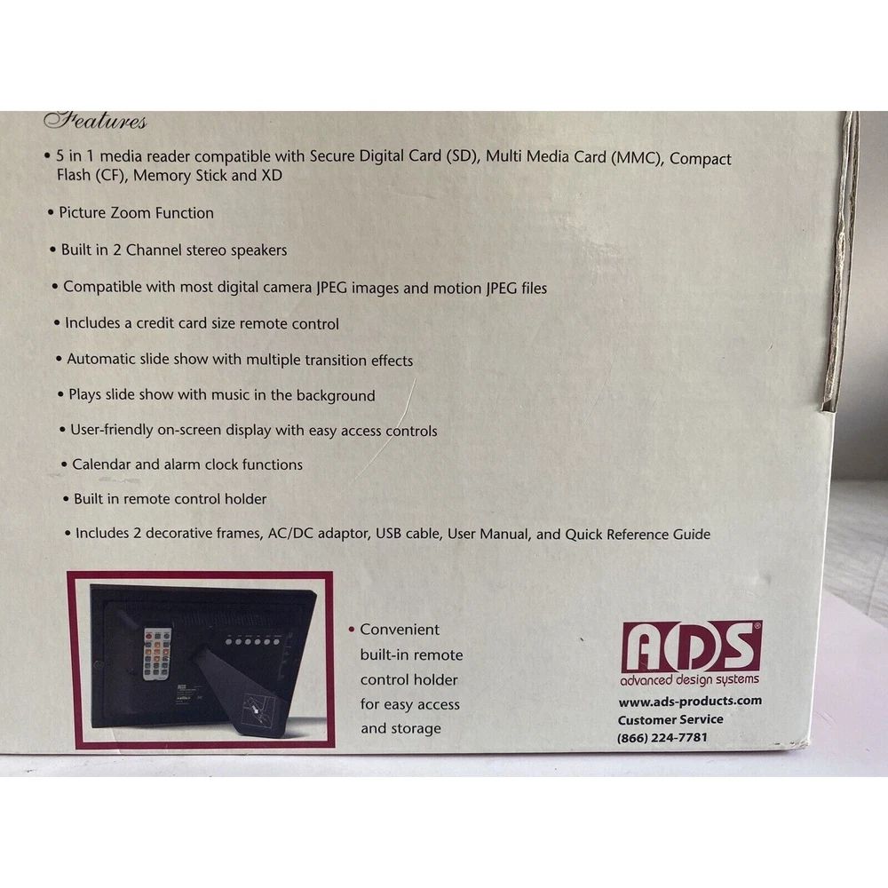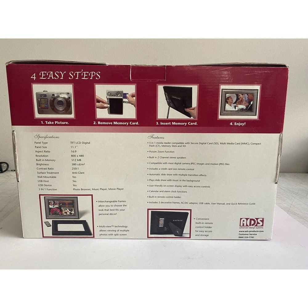 Showcase your precious memories with this ADS 11.1" digital photo frame. This photo frame boasts an 800x480 high resolution display with a 16:9 aspect ratio that beautifully showcases your favorite photos, movies, and music. It has a sleek design in silver, black, and wood grain that complements any home decor. This frame has a built-in speaker and supports MP3 and various media formats. With a connectivity feature of USB and compatible external memory of SD, MMC, Memory Stick, and CompactFlash I, you can easily transfer your desired content. It also features a calendar and clock to keep you reminded of important dates and appointments. Trust in the quality of this Advance Design Systems model, made in China.