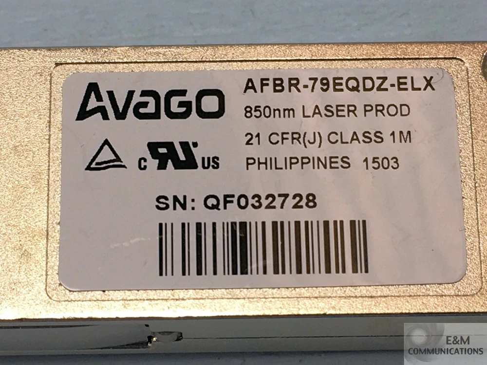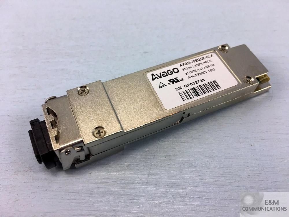 AVAGO (EMULEX) 40 Gbps 4-Channel QSFP+ Transceiver 850nm 100m Multi-mode Fiber Support Part Number: AFBR-79EQDZ-ELX Description: The Avago Technologies AFBR-79EQDZ-ELX (manufactured for Emulex) is a Four-Channel, Pluggable, Parallel, Fiber-Optic QSFP+ Transceiver for 40 Gigabit Ethernet (40GbE) application. This transceiver is a high performance module for short-range multi-lane data communication and interconnect applications. It integrates four data lanes in each direction with 40 Gbps aggregate bandwidth. Each lane can operate at 10.3125 Gbps up to 100 m using OM3 fiber or 150 m using OM4 fiber. These modules supports 4 x 10G InfiniBand (IB) quadruple data rate (40G-IB-QDR) application and is backward compatible to the 4 x 5G IB dual data rate (20G-IBDDR) and 4 x 2.5G IB single data rate (10G-IB-SDR) applications as well. These modules are designed to operate over multimode fiber systems using a nominal wavelength of 850nm. The electrical interface uses a 38 contact edge type connector. The optical interface uses an 8 or 12 fiber MTP® (MPO) connector. This module incorporates Avago Technologies proven integrated circuit and VCSEL technology to provide reliable long life, high performance, and consistent service. Condition: Pulled from working system - Preowned Exterior of transceiver may have signs of insertion/extraction. Functional and tested! Other: Includes our 60-day warranty where we pay for return shipping! Location: 15BC We support combined shipments and can use your UPS or FedEx account, just ask us! Check out our eBay store for additional items like this! Used item(s) may have cosmetic wear as shown in picture(s) WE PROVIDE A DOA WARRANTY See Shipping/Payment tab for further warranty details Pictures are representative and may not be exact item sold, unless specified. PAYMENT AND SHIPPING DETAILS For any shipments requiring motor freight , please contact us directly and provide us with: The type of location - residential or commercial The delivery zip or postal code If there will be a fork lift or lift gate available Are there any other special requirements? (e.g. specific time or appointment required for delivery) We generally ship UPS. If you prefer Fedex or other carriers, please provide us with your shipper number . INTERNATIONAL CUSTOMERS: Delivery times expected to be around 14 business days, but may take as long as a month depending on your customs clearance. Customer may be subject to other duties at time of delivery imposed by importer/customs not by Seller. We ship primarily domestic. You will be required to provide necessary documents for import or accept a delay in processing and/or cancelation and refund of your order. We will not make or accept any “invoice” adjustments on amount to alter import fees. FLORIDA RESIDENTS: Ebay does not have a per-county calculator. Florida tax is currently being collected at 7.5%. If this is higher than your county, you will be refunded the difference (or contact us prior to check-out EASIEST.) If your item is greater than $5000.00, or this is a tax exempt purchase please contact us for invoice modification prior to check-out. Florida shipments will not be processed until sales tax has been collected or a sales tax exemption certificate has been obtained. Thank you for your business and please check out our other eBay Store items! E&M COMMUNICATIONS "Specializing in new and used telecom networking equipment at the lowest prices" It is our goal to provide a consistent inventory of the most popular and hard to find equipment on the market at wholesale prices. ADC-FUJITSU-ADTRAN-CARRIER ACCESS-TELECT-TELLABS-NORTEL-HARRIS-NEC-CISCO-MARCONI-RELTEC-ALCATEL-LU CENT-AFC-STINGER-HENDRY-LORAIN-AVAYA-AT&T-ITT-WECO AND MUCH MORE