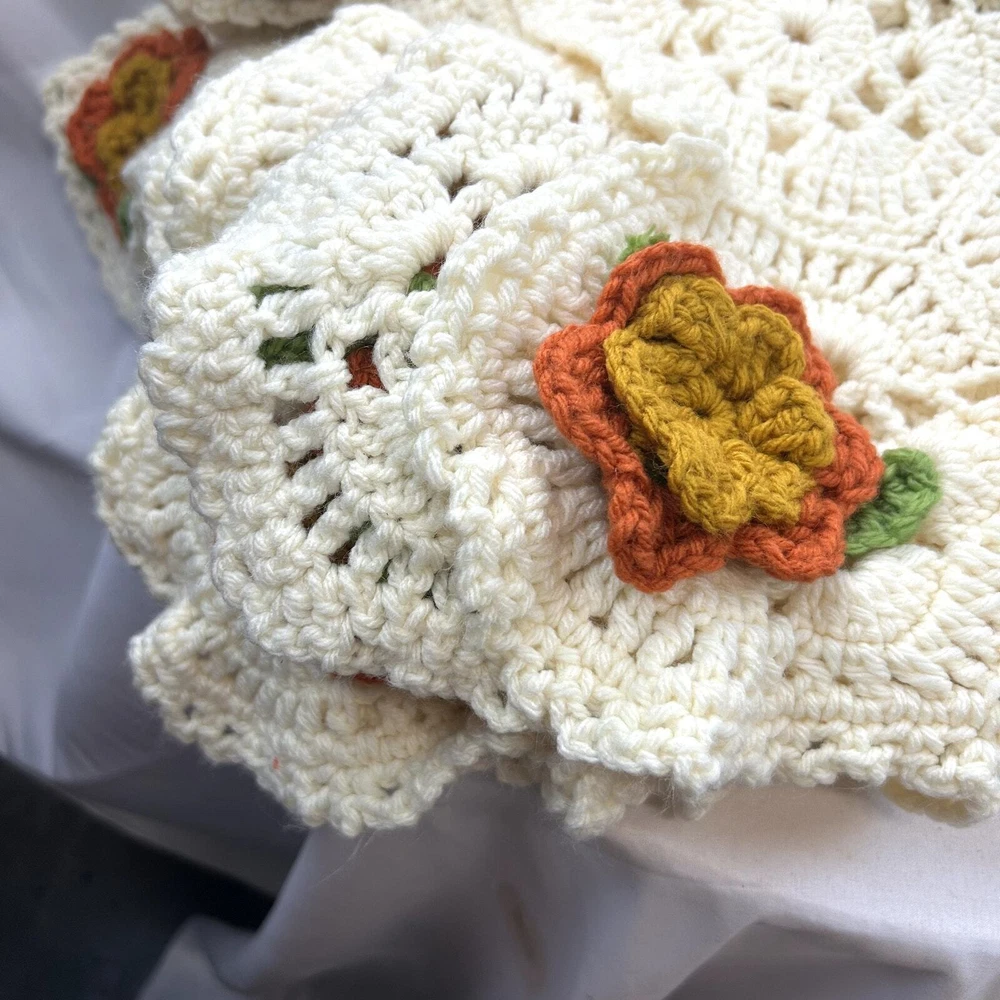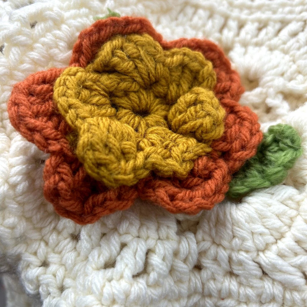 AFGHAN Handmade USA Crochet 70 x 60 inches 6.5" 6-sided put together with flowers Cream with orange and gold flowers with green leaves. New without tags very nice work You Are Enough 2176 $150 6 lbs
