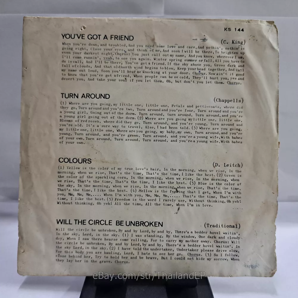 Welcome to The World of ""Thailand Vinyl Records"".Very rare and beutiful picture of cover. Check everyday . This item is for a true 7" single collector. It was printed and sold locally as limited EP back in the early 70's. Only few copies were spread outside Thailand. Most professional record collectors know that it is scarce nowadays and is absolutely a collector's item. If you know a UK magazine called RECORD COLLECTOR then you must have read many articles mentioning THAILAND EP and this is it !!! Here is your chance to own one-of-a-kind piece of Asian's 7" single history. Description Records !!! DETAIL SONG and ARTIST !!! Side A: A1 = Agnes Chan - Colours / A2 = Agnes Chan - Will The Circle Beunbroken Side B: B1 = Agnes Chan - You've Got A Friend / B2 = Agnes Chan - Turn Around Label&Catalogue number : : KS144 Country of release : THAILAND Condition (Sleeve/Disc) : VG / VG+ and pls see picture too. Shipping I am seller in Thailand not USA.So I can not ship 4$ as policy pls understand this real rate from oversea . Price for shipping(Airmail )&Packaging to worldwide only US 14.99 USD .Except Asia and JAPAN only 14.99 USD. You can save cost for combine shipping only 3 USD$ per each. 2xEP=17.99 USD$ , 3xEP=20.99 USD$ . My package very safety by big cardboard don't worry about your's EP/PS/LP. Time delivered 21-45 days . ***All item : have tracking system no need add money*** **For normal shipping (Airmail).Time delivery to ITALY maybe use 1-2 Months, France use 1-2 Months.But Don't worry item will arrived to you sure!!.For fastest and High value you can use Express Mail Service cost for1 EP =39 USD.EP will arrived to you within 5-7 Days. ***All shipment have fully tracking system *** Payment PAYMENT : I accept the follow payment by eBay managed , . My ID eBay provide by eBay .Account will be provide at the end auction.Charges to be covered by winner. If you have question pls email to me anytime i can answer immediatly. I have many EP,PS 7" Thailand Pls Click => View seller's other items Check my feedback , I care and honest all customer.I welcome 0 feedback but contact me first if you will bidding. Good Luck !!!! and Enjoy . 45 RPM / EP/ LP Grading Scale: Mint /NM/ Excellent(VG++) /VG+/ VG /G+ /Good(G) / Fair / Poor / Bad (According Record Collector Magazine (UK)) LOT161-03KS144