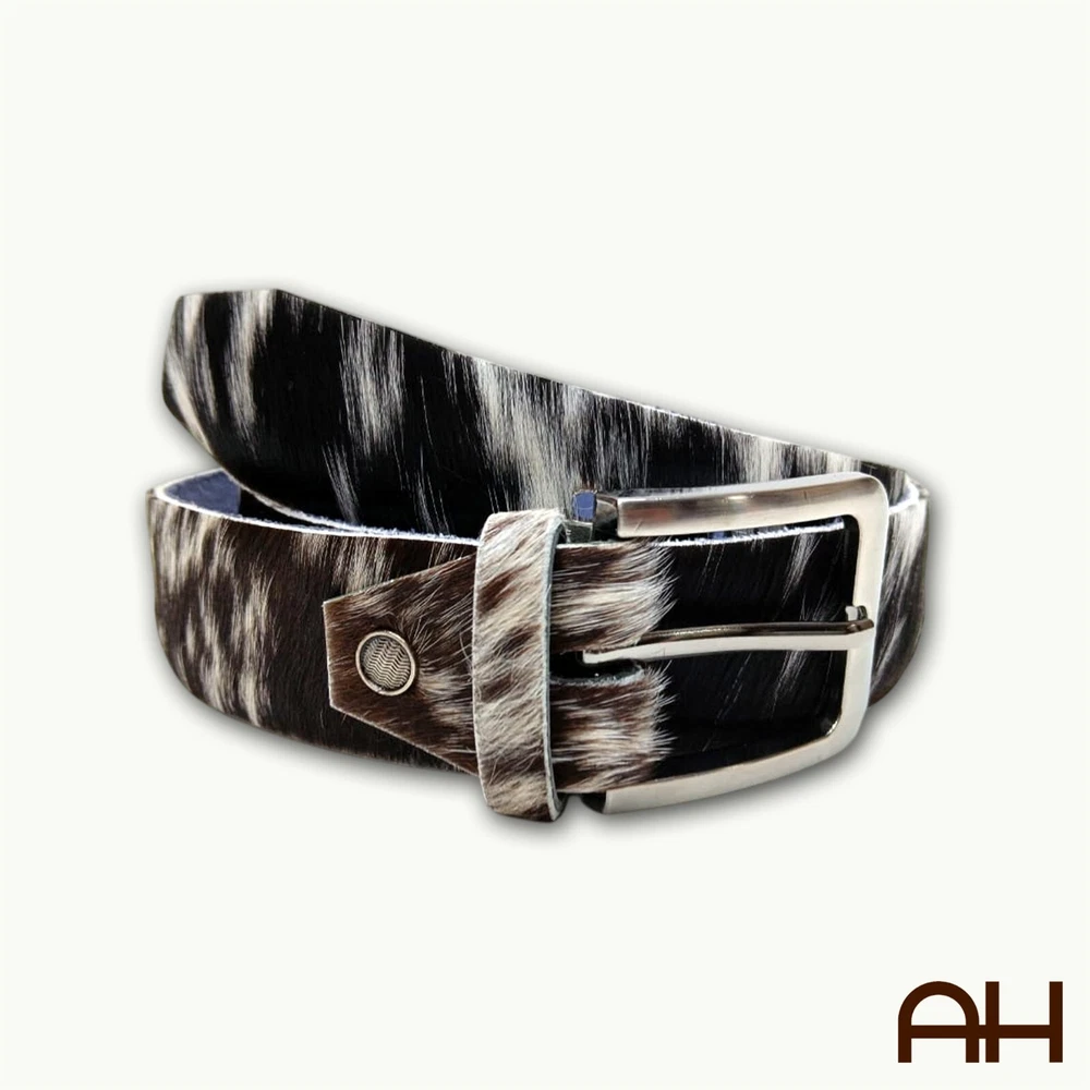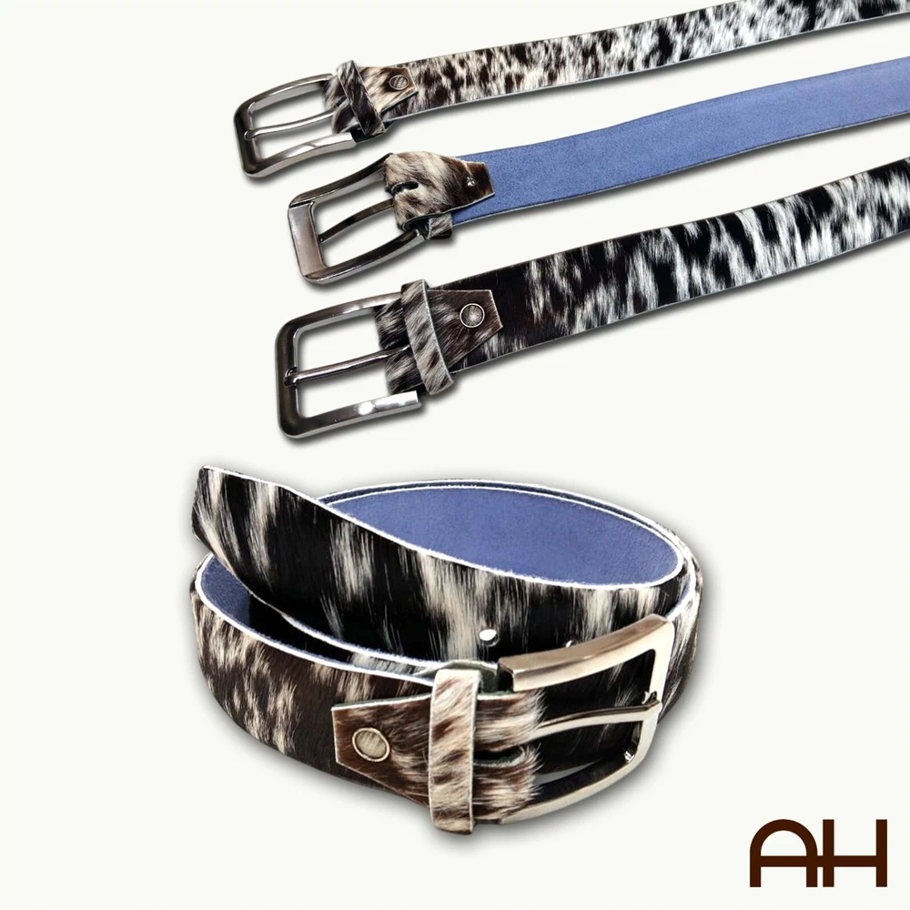 New AH Leathers Cowboy Style Real Cow Hair Leather Belt Men & Women Handmade USA White & Black Fur Made in the USA, by AH Leathers Craftsman, from one solid piece of Buffalo Hide Leather Black Color Elevate your style with our Cowboy Style Genuine Hair On Leather Belt, perfect for both men and women. This belt is crafted from 100% natural hair-on leather, offering a unique and sophisticated look. Each belt is handmade with high-quality materials, ensuring durability and timeless elegance. The solid brass removable buckle adds versatility, allowing you to customize your belt easily. Details: Material: 100% genuine hair-on leather with premium leather backing Buckle: Detachable and adjustable solid brass buckle Width: 1.5 inches (4 cm) Unique Color Patterns: Each belt is uniquely patterned due to natural hair-on leather Ethically Sourced: Made from ethically sourced materials, ensuring responsible practices Environmentally Conscious: Crafted with a focus on environmental sustainability Suitable for: Both men and women Ideal for: Formal and casual wear Features: Premium Quality: Made from high-quality hair-on leather with genuine leather backing Durable & Stylish: Combines durability with a modern, stylish design Silky Soft & Odorless: Ensures comfort and a pleasant wearing experience Versatile: Perfect width for both jeans and formal attire Adjustable: Multiple holes for easy size adjustment Handmade Craftsmanship: Expertly crafted for superior quality Size: Waist Sizes: Available in 30" to 48" Width: 1.5 inches (4 cm) Adjustable Length: Easily adjustable to fit your waist Buffalo Hide Full Grain Leather Men's Heavy-Duty Belt for work Leather Belt or any occasion. Men's Leather Belts are hand crafted from solid piece of Full Grain Buffalo Leather. Heavy-Duty Roller Buckle attached with heavy duty Chicago screw, to make changing the buckle out for your own personal Buckle easy. Buckle colors available: Stainless steel Handmade from thick 9/10 OZ Buffalo Hide Leather - 1.5" Wide belt. Sizes available: 30" to 52" in length. 7 Hole adjustment, for better fit.
