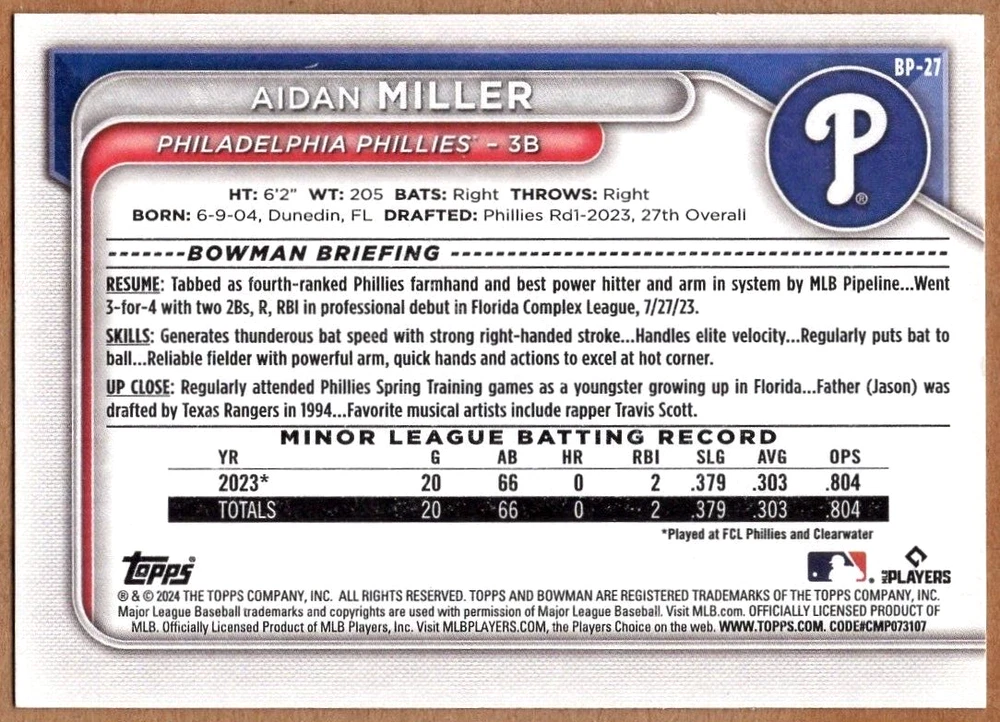 You are bidding on a lot of 10 2024 Bowman Prospects Aidan Miller RC #BP-27. The winner will please include $3.49 for the first item and $0.99 for each additional item for secure, padded shipping. There is a maximum shipping charge of $9.95 no matter how many items you win! International shipping will be extra. Thank you and good luck!