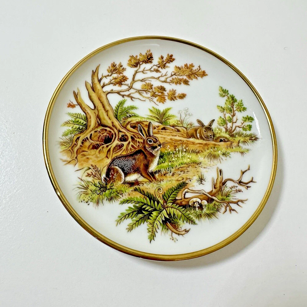AK Kaiser Porcelain Trinket 4" Plates Coasters Germany Wildlife/Flowers Set Of 4 Pre-owned & overall in great used condition. One plate (rabbit plate) has a small dent in one side. See photos for close ups & measurements. Would make a great stocking stuffer! Ready to ship!